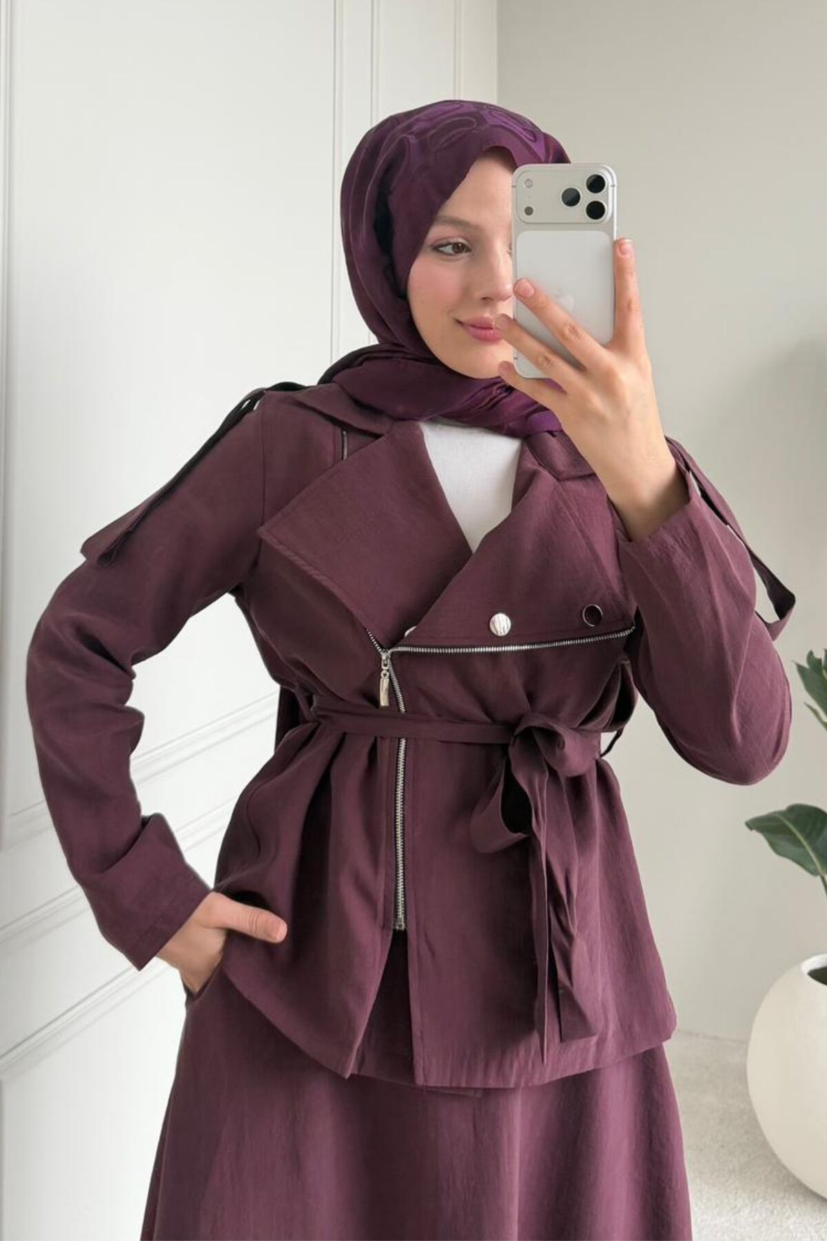Balenbi Kruvaze Yaka Çapraz Fermuar Detaylı Kuşaklı Tesettür Etekli Takım 1190 - Form Serisi 44 - Bordo