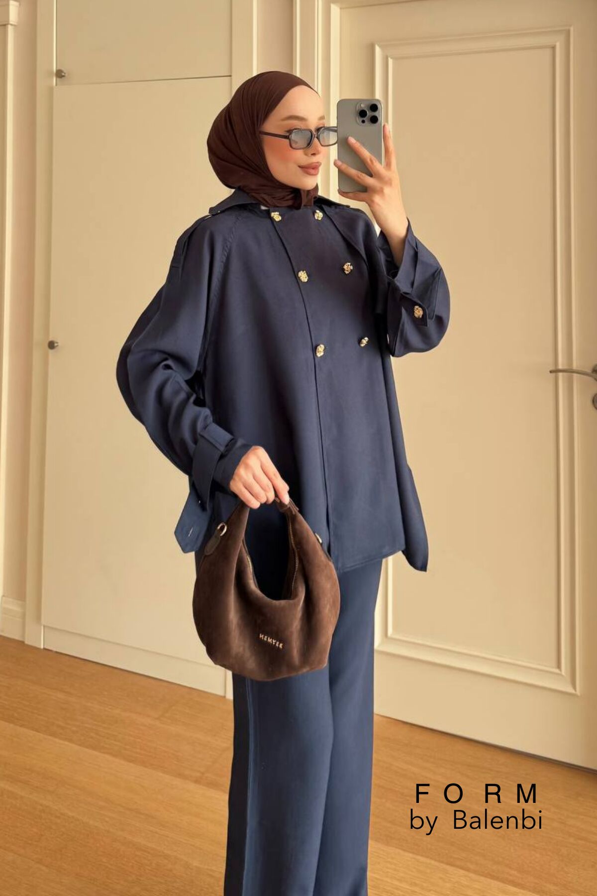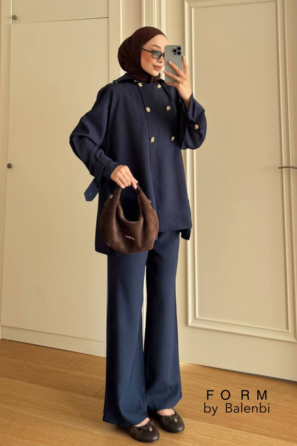 Balenbi Kruvaze Yaka Çift Düğme Detaylı Tesettür Kadın Dokuma Takım 1175 – Form Serisi L/XL - Lacivert