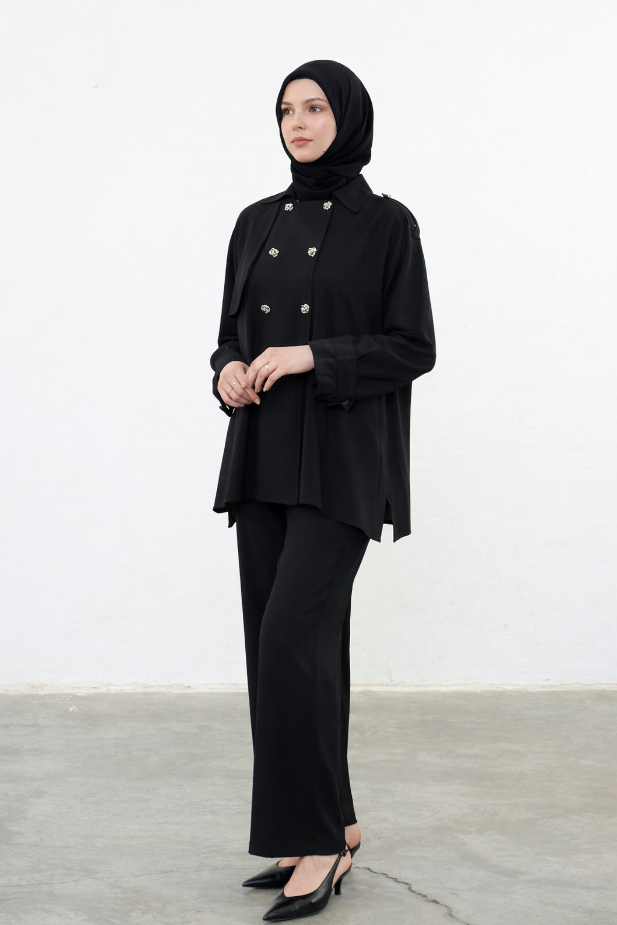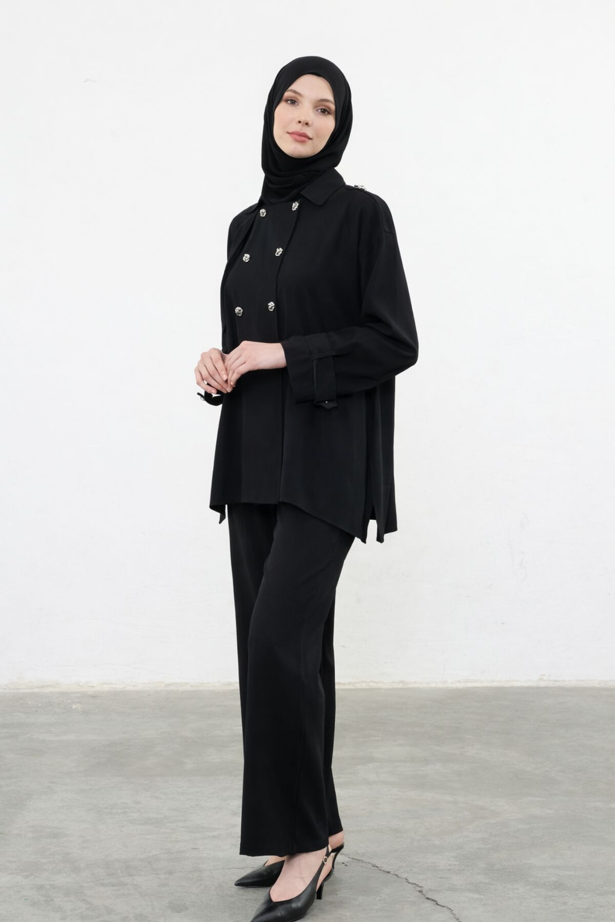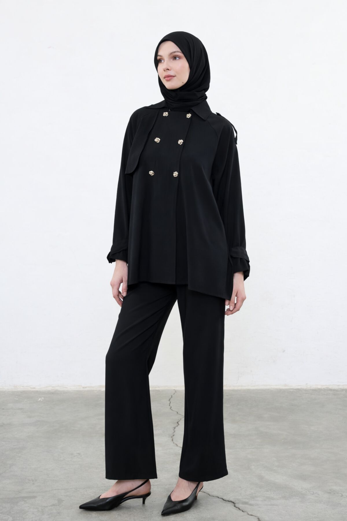 Balenbi Kruvaze Yaka Çift Düğme Detaylı Tesettür Kadın Dokuma Takım 1175 – Form Serisi S/M - Siyah