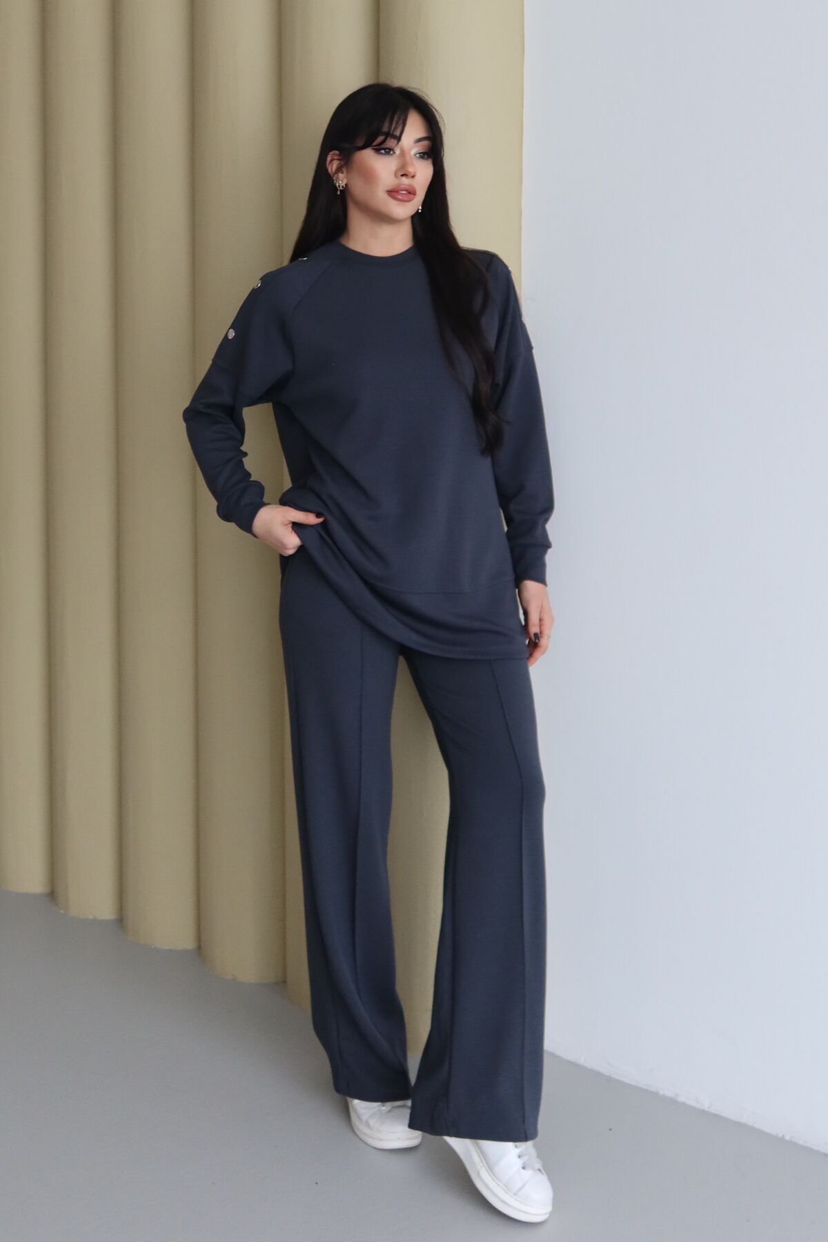 Balenbi Omuz Çıtçıt Detaylı Bisiklet Yaka Oversize Modal Tesettür Takım 1178 XL - Füme