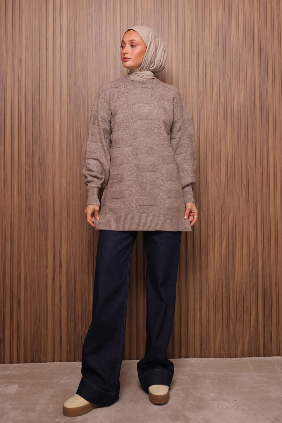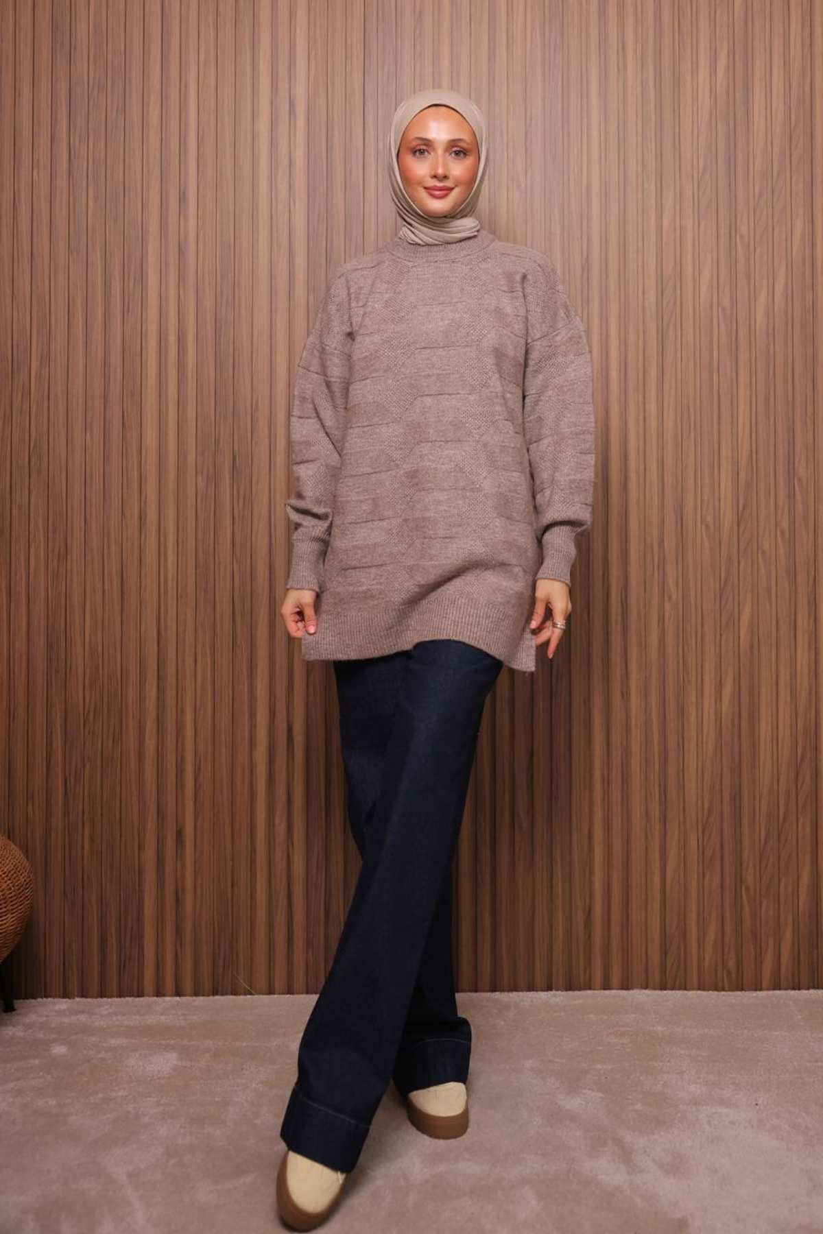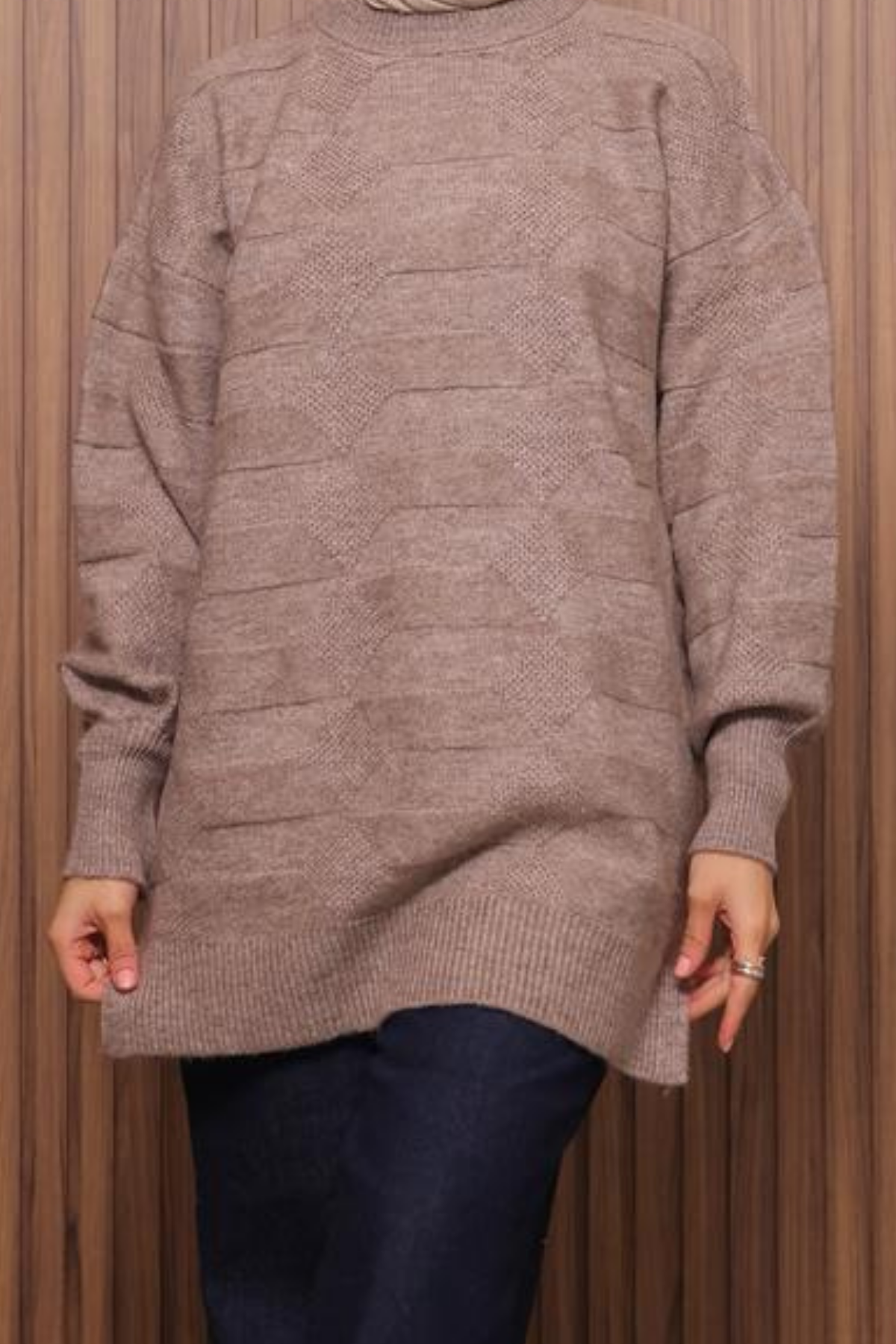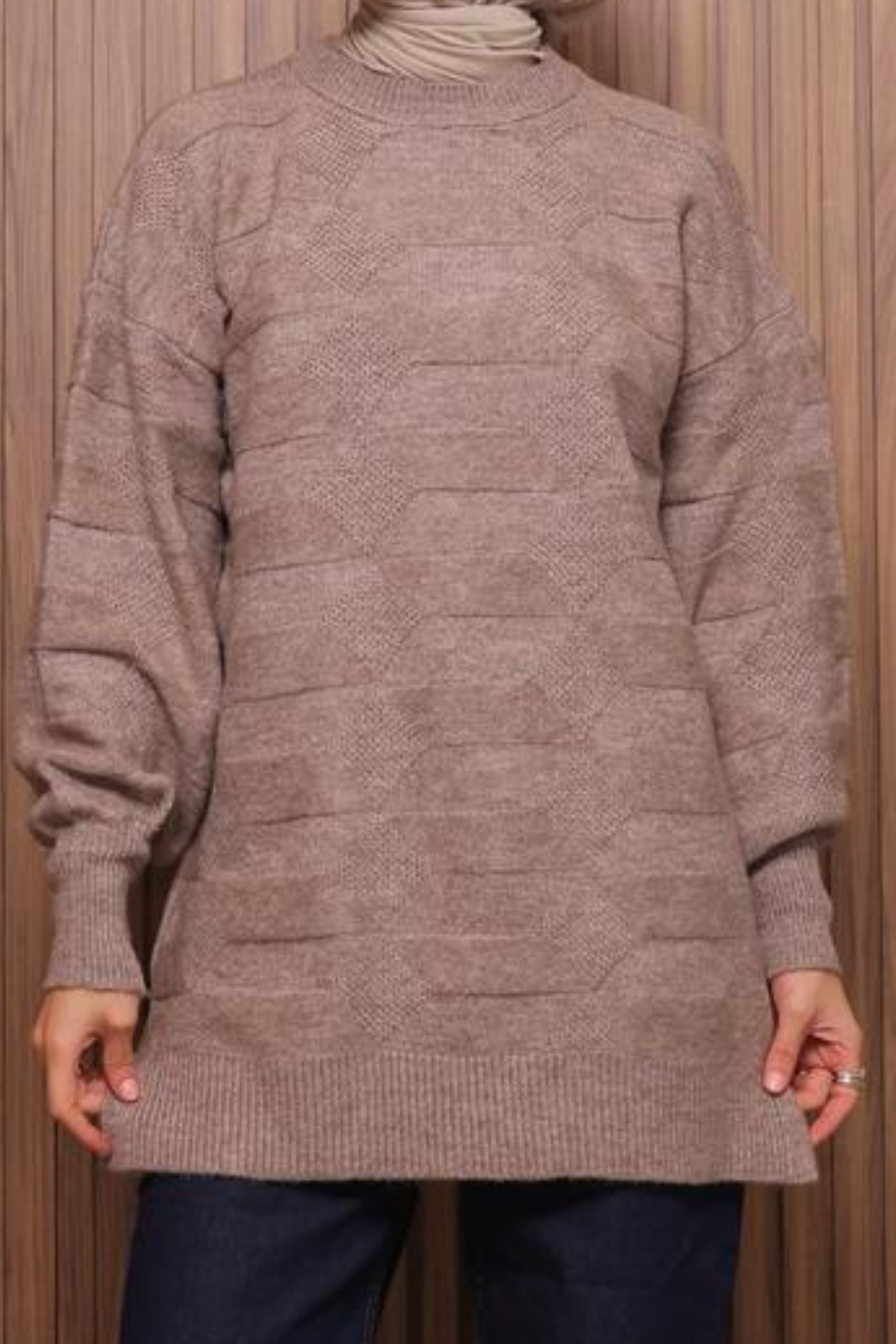 Balenbi Örgü Dokulu Yumoş Oversize Tesettür Triko Tunik 7018 Standart - Toprak