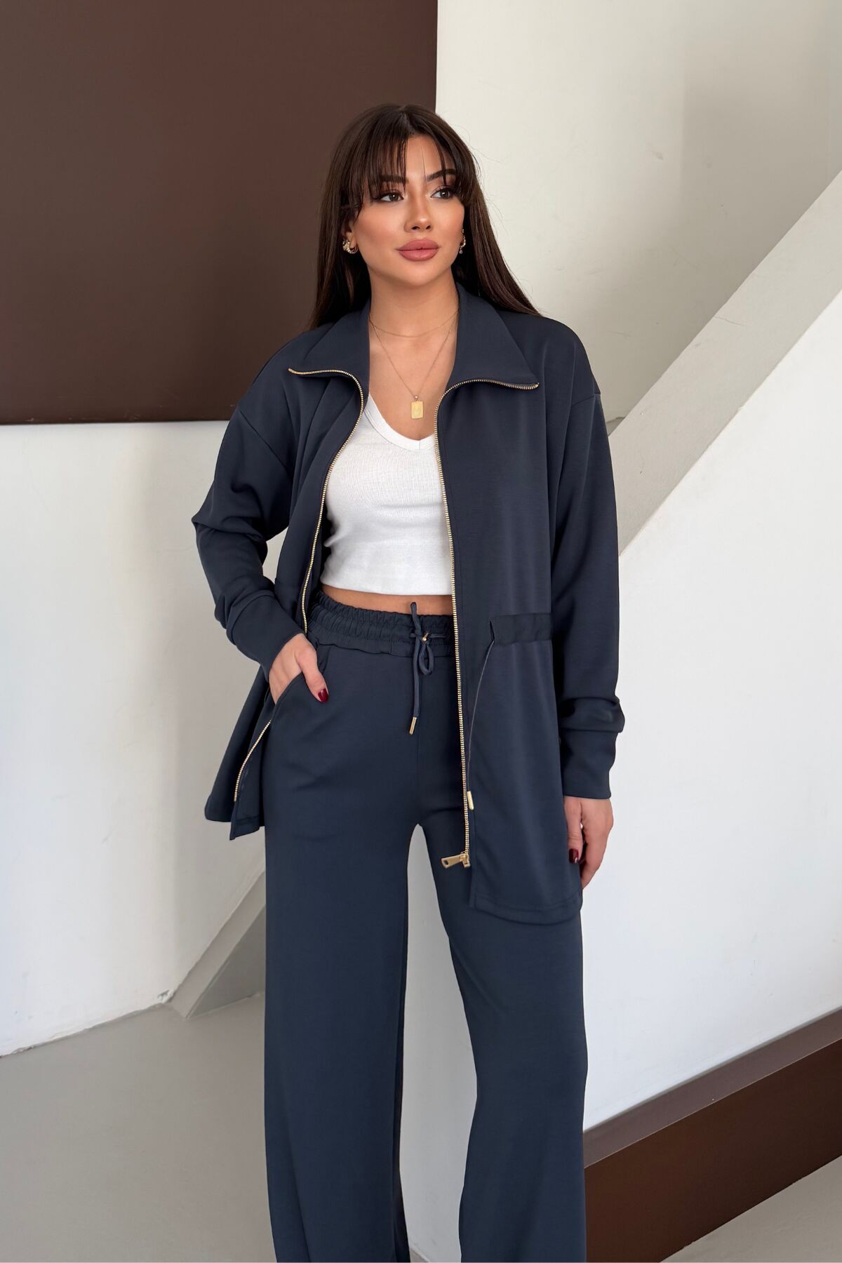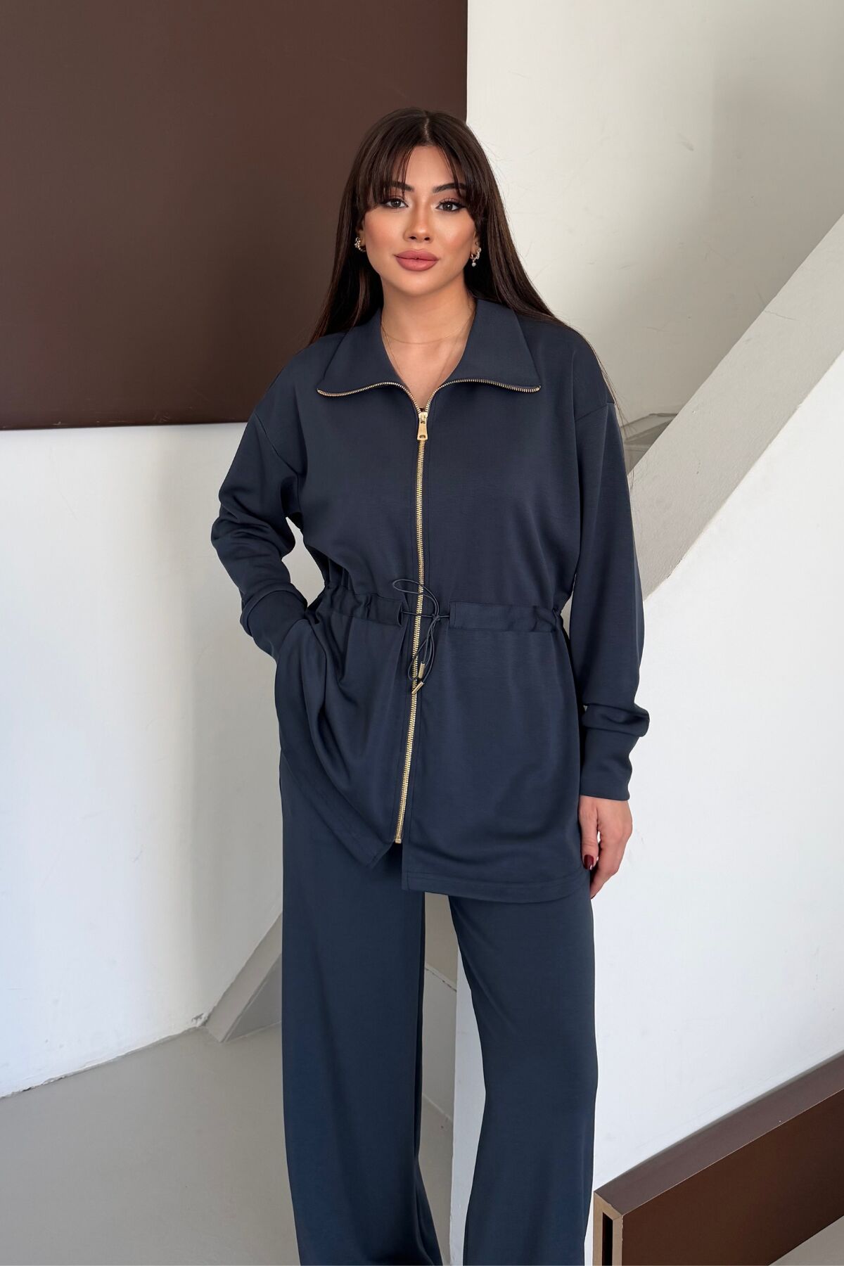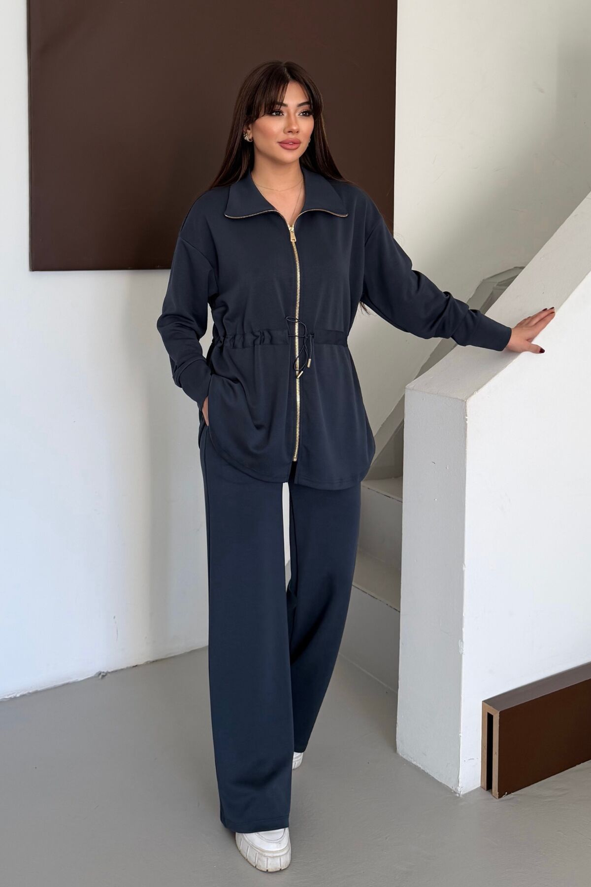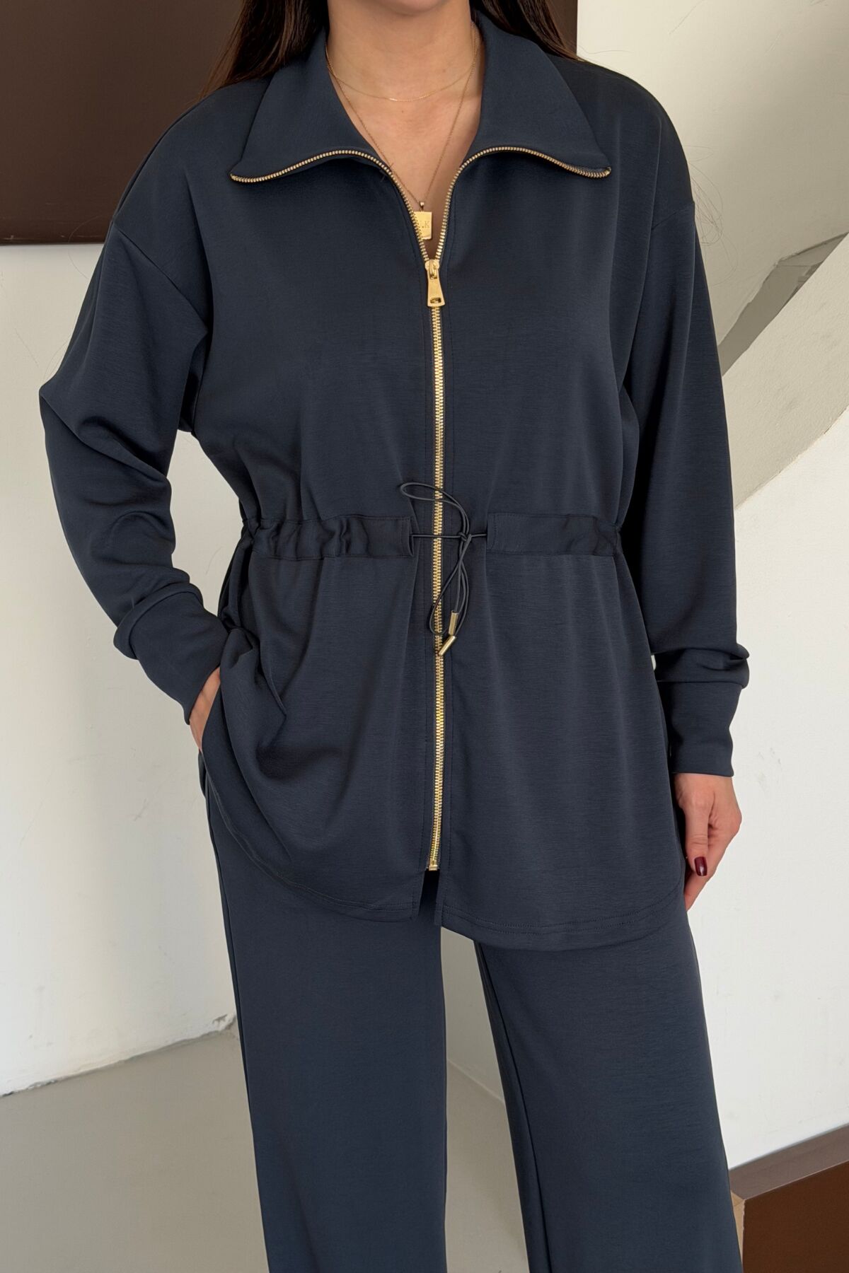 Balenbi Oversize Fermuarlı Beli Bağcıklı Polo Yaka Modal Kadın Takım 1196 - Form Serisii