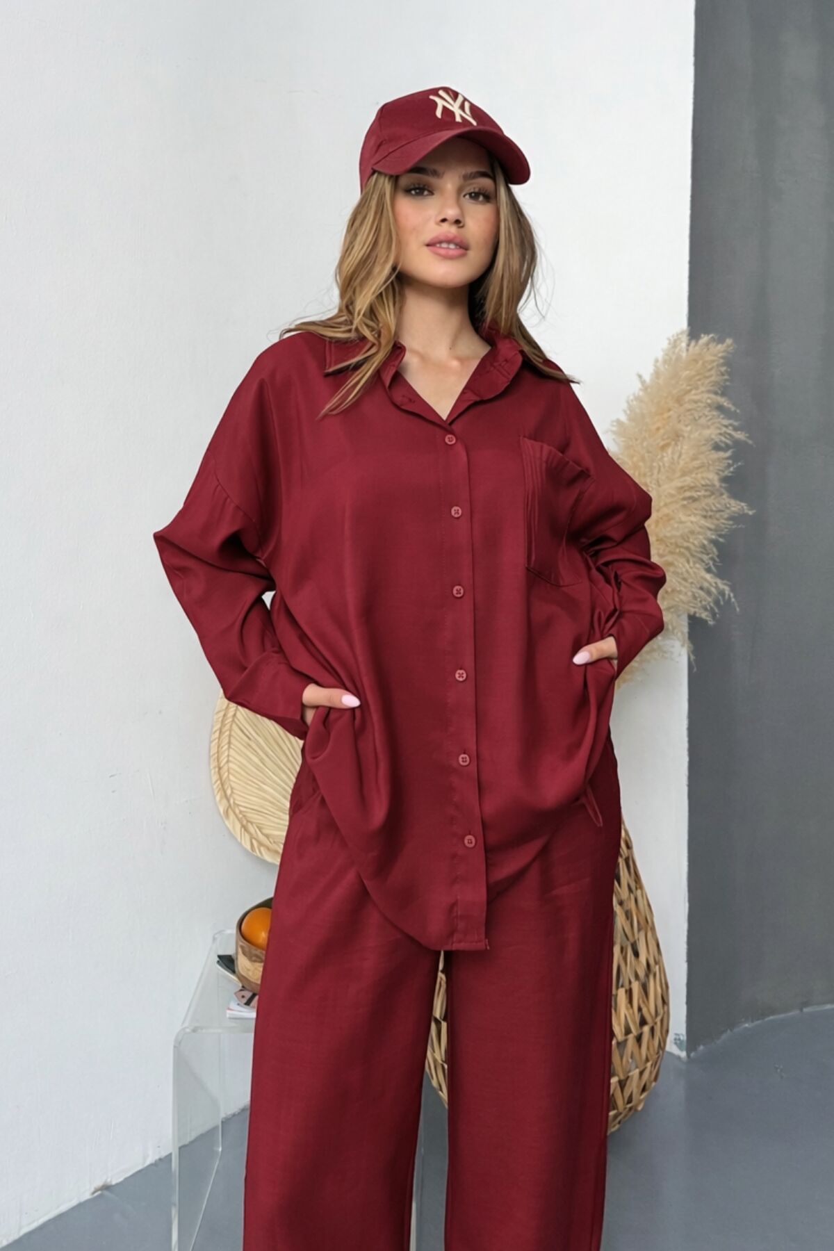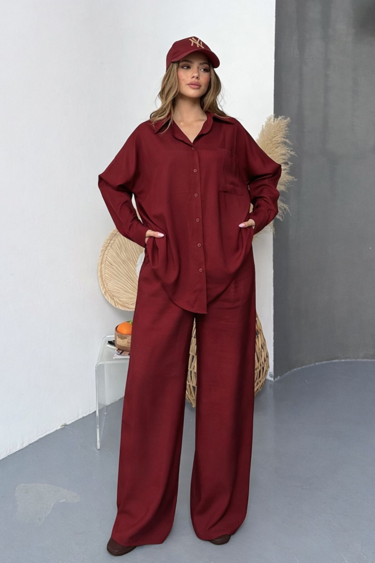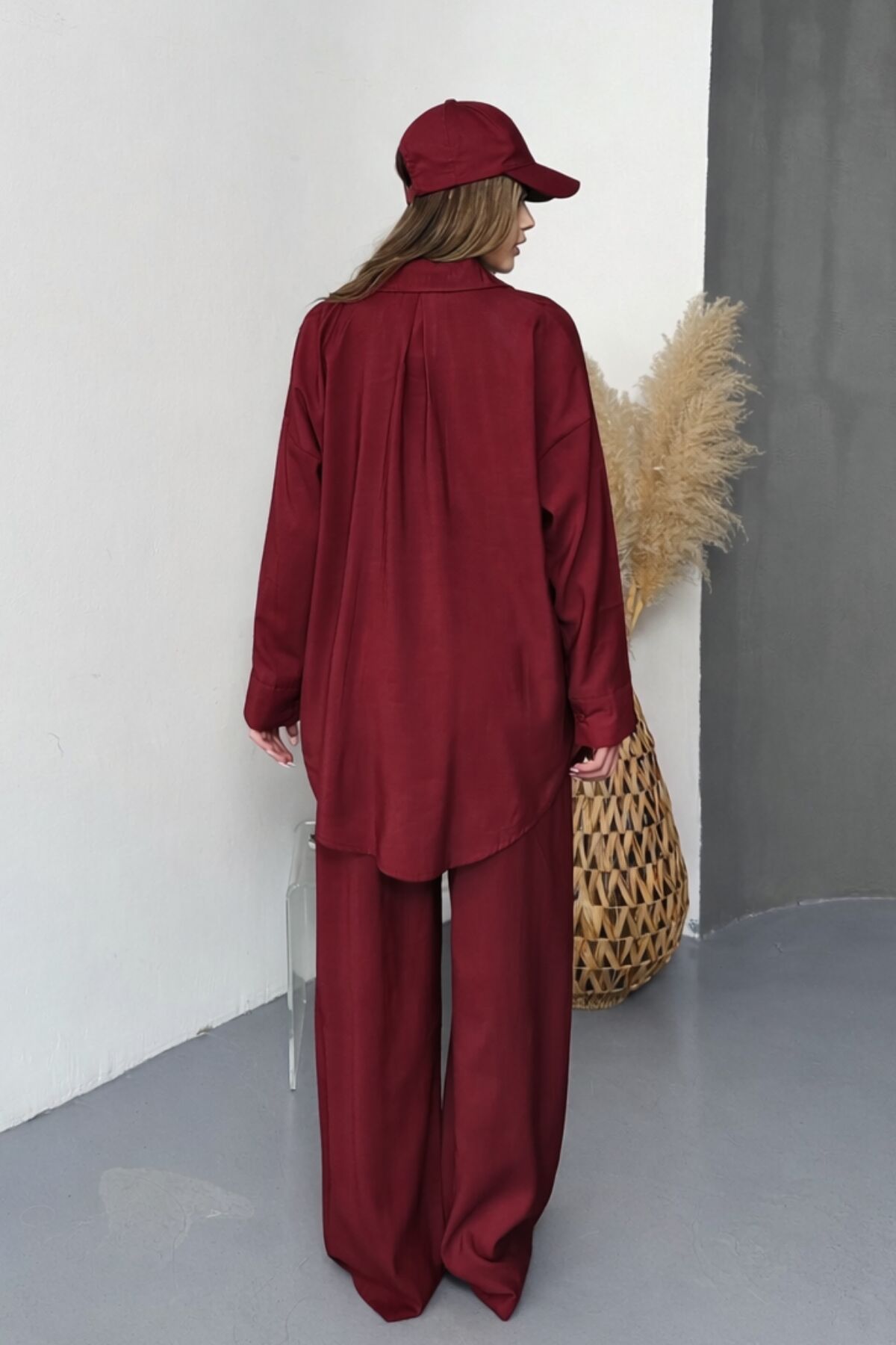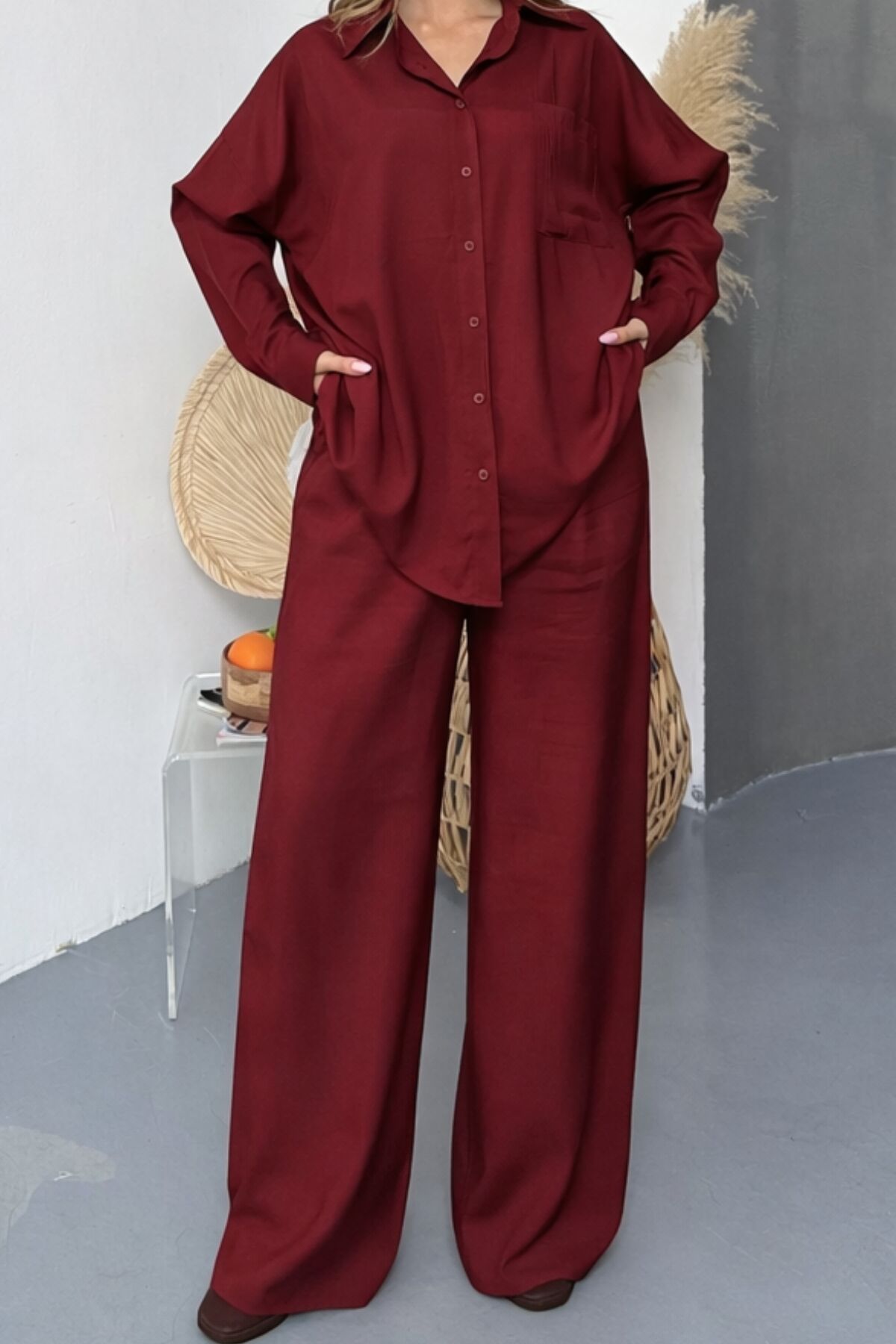 Balenbi Oversize Gömlek Bol Paça Pantolonlu Rahat Kesim Kadın İkili Takım 1201 S - Bordo
