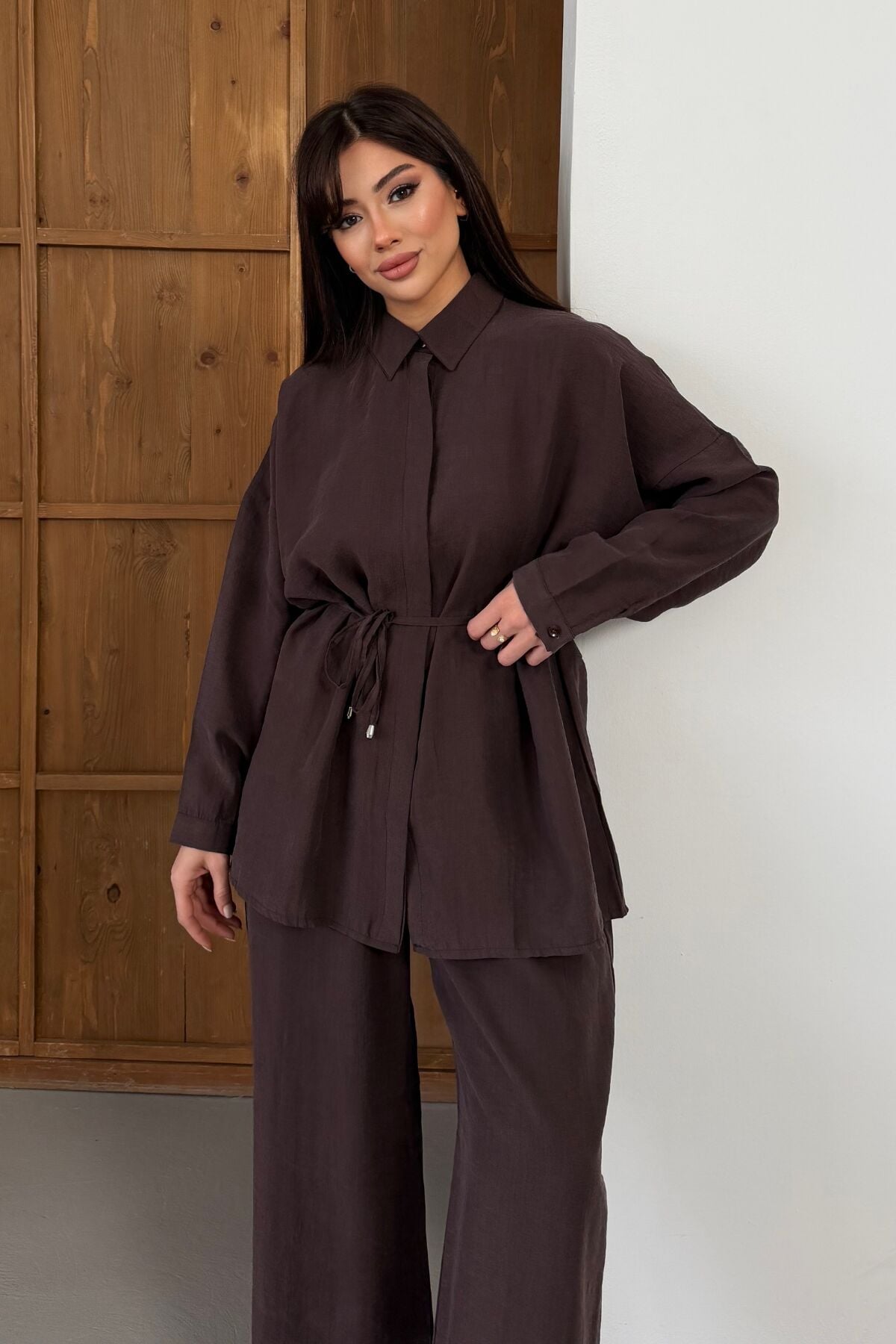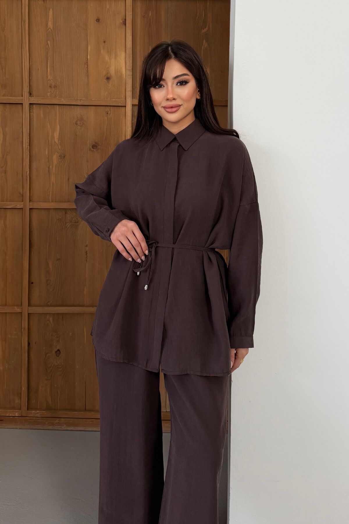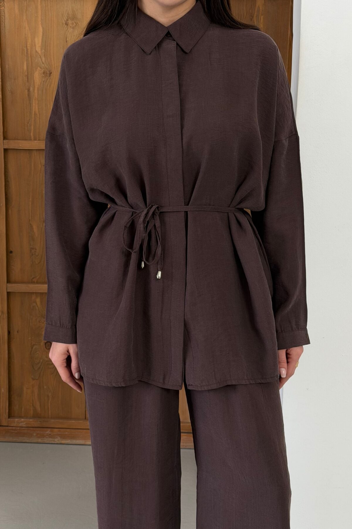 Balenbi Oversize Gömlek Yaka Bağcıklı Salaş Kesim İkili Tesettür Takım 1207 – Form Serisi S/M - Kahverengi