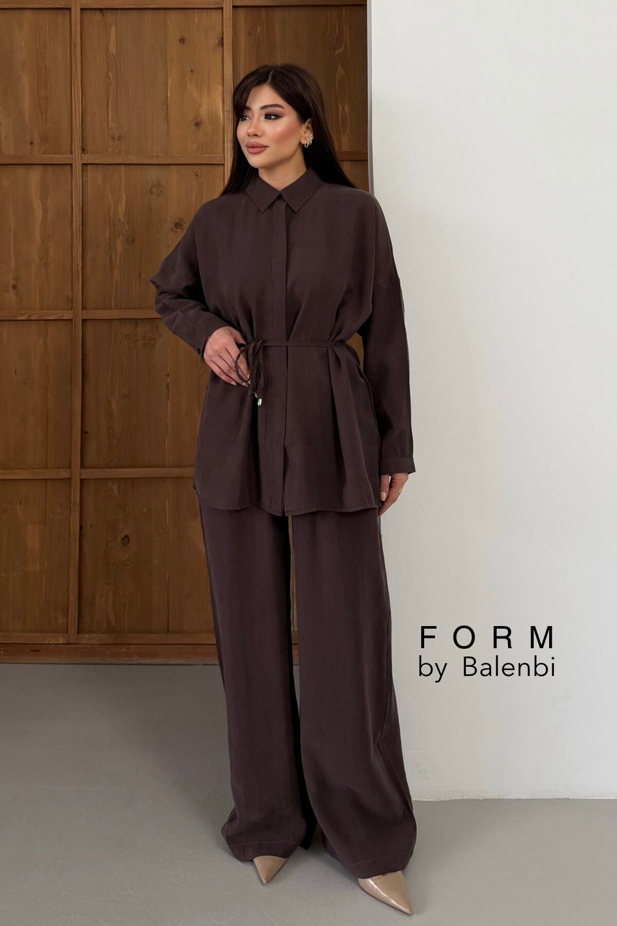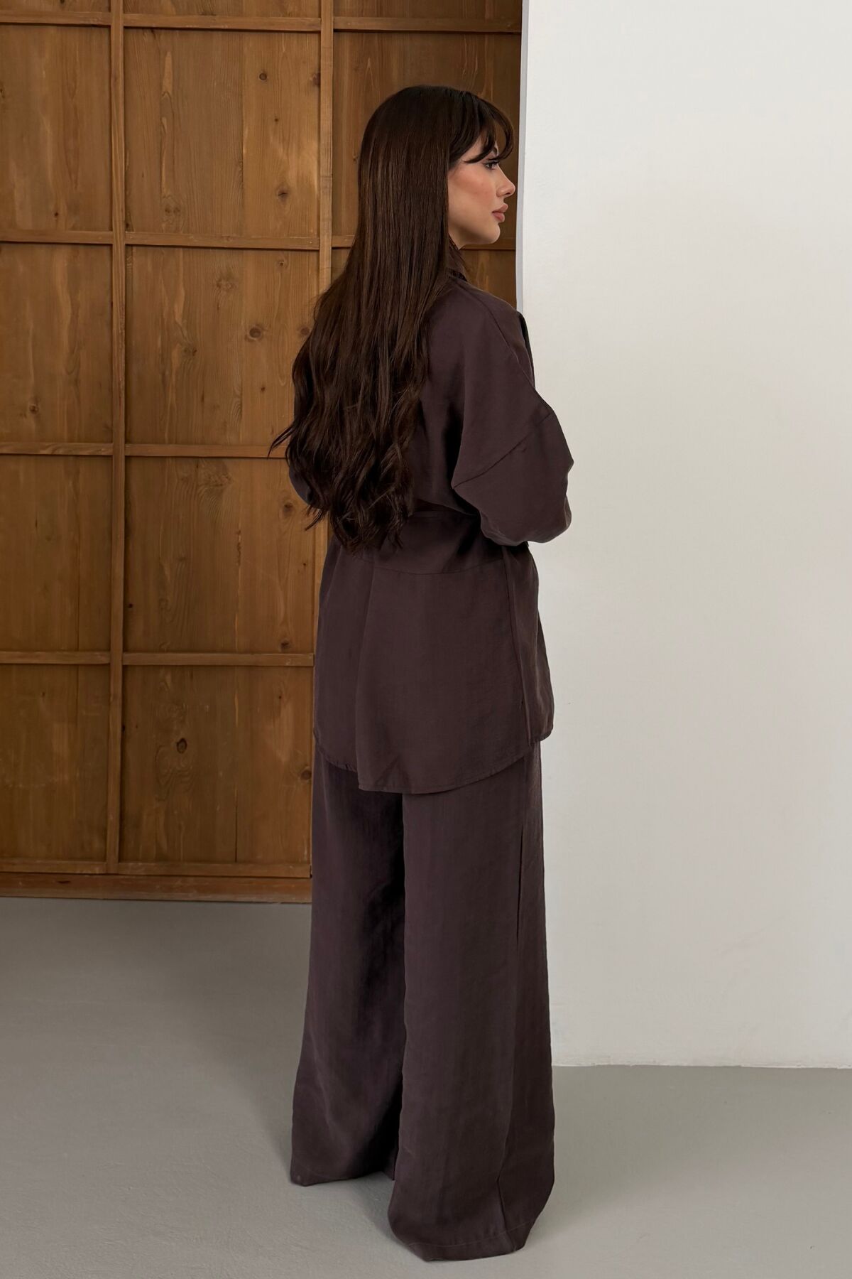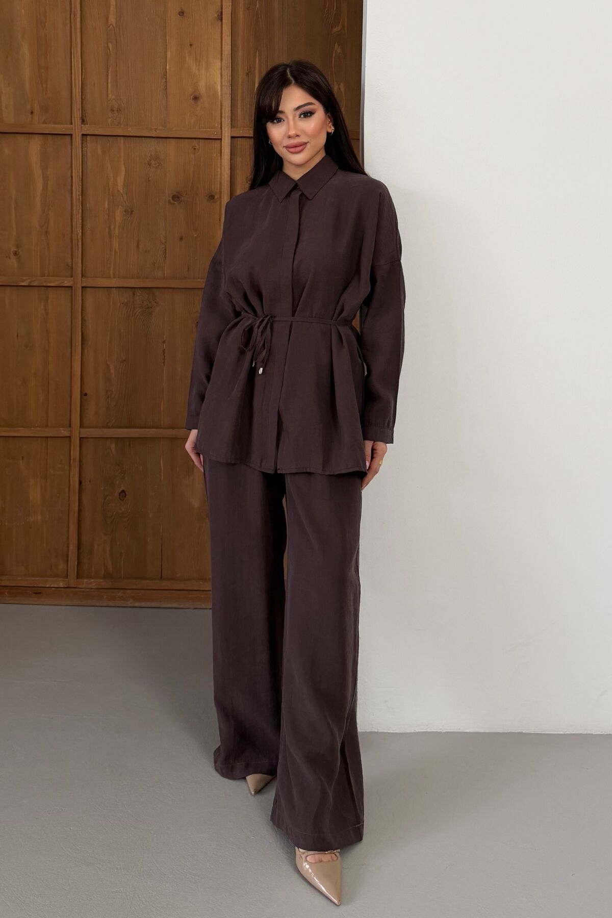 Balenbi Oversize Gömlek Yaka Bağcıklı Salaş Kesim İkili Tesettür Takım 1207 – Form Serisi S/M - Kahverengi