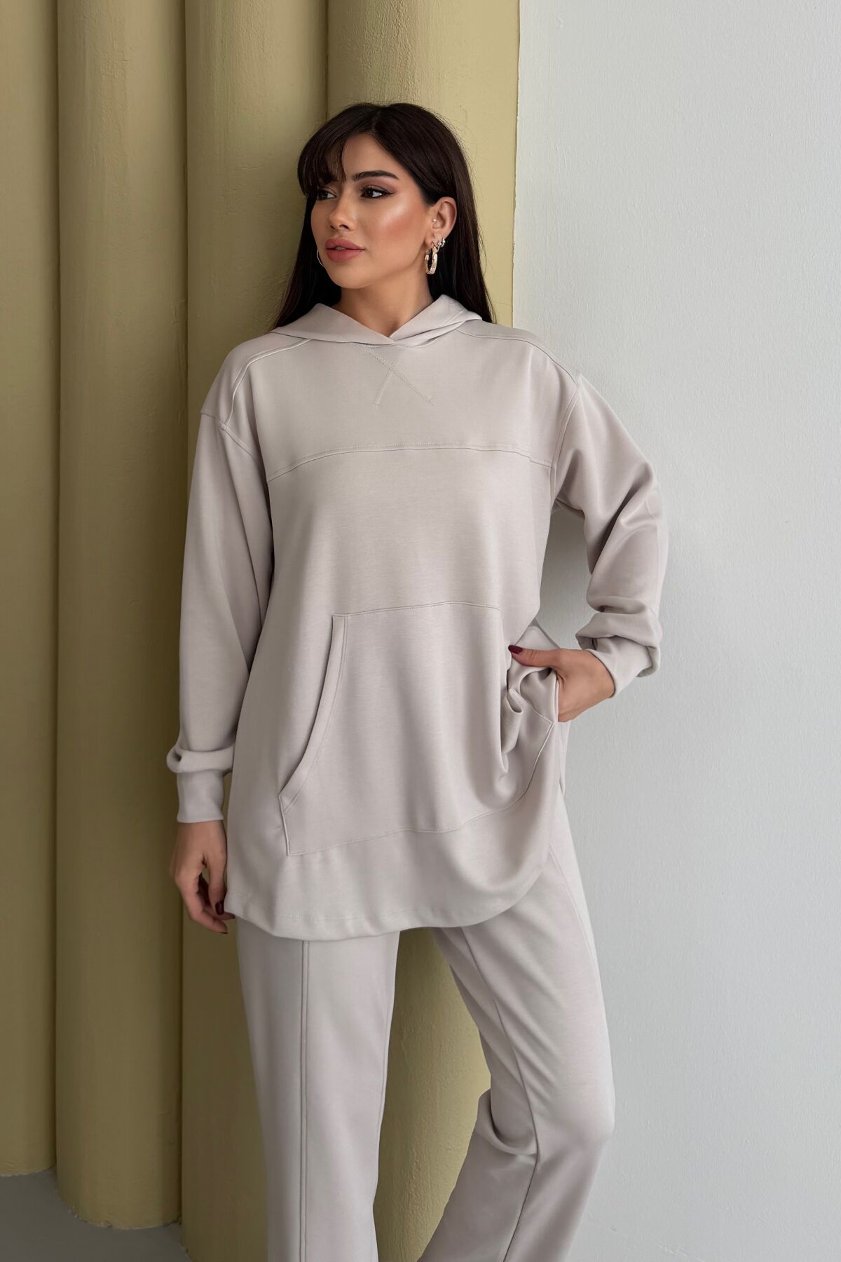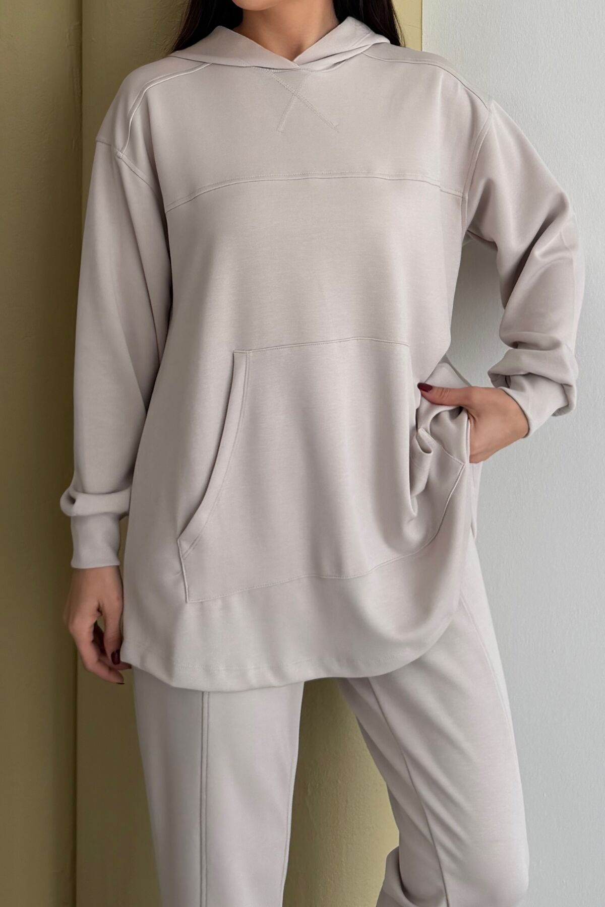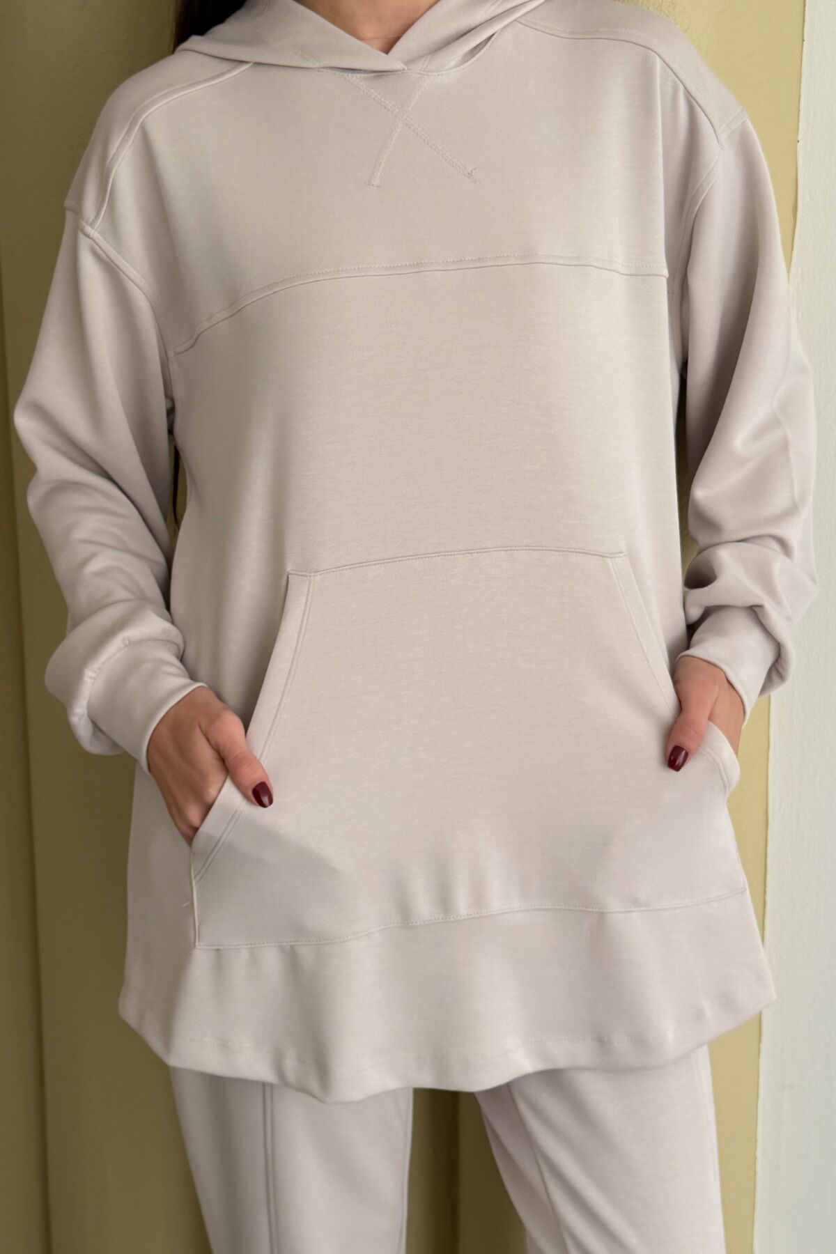 Balenbi Oversize Kapüşonlu Kanguru Cepli Modal Tesettür Takım 1192 - Form Serisi XL - Taş
