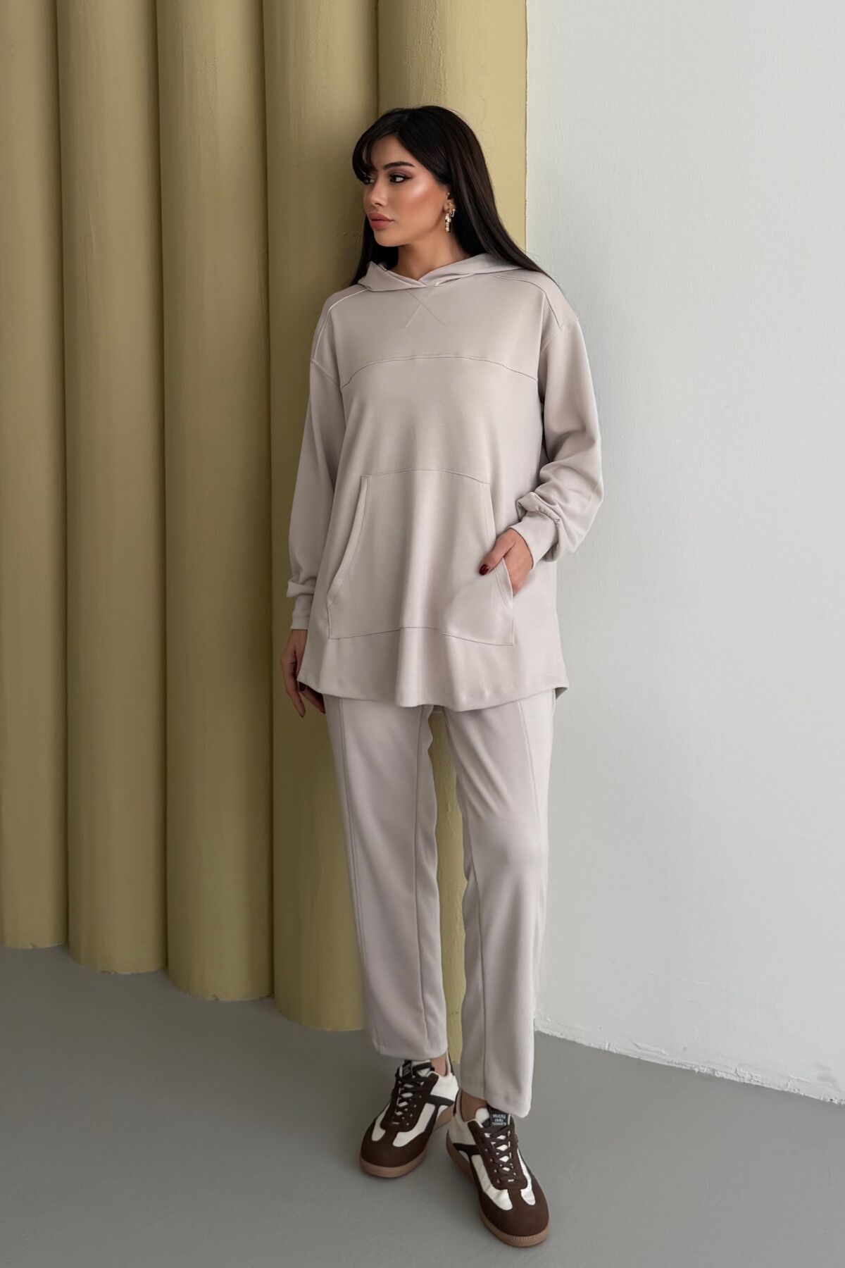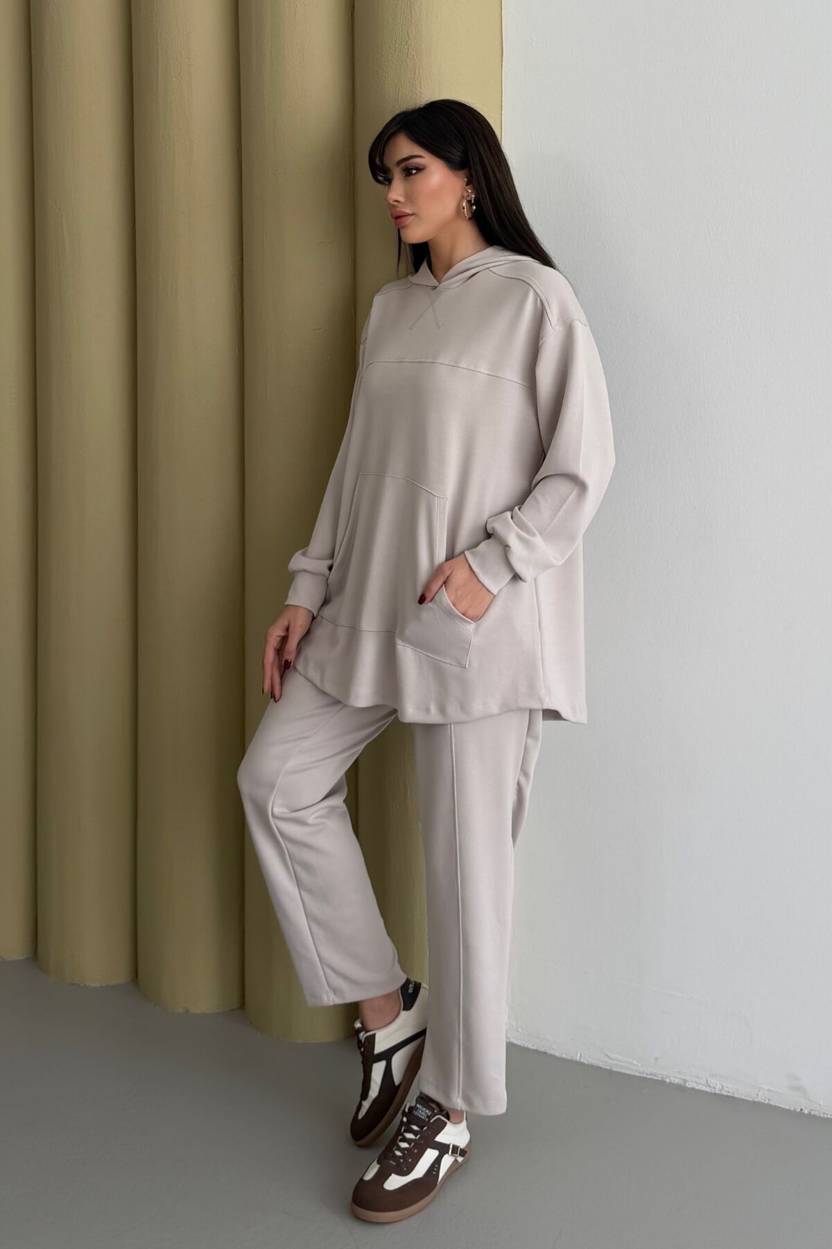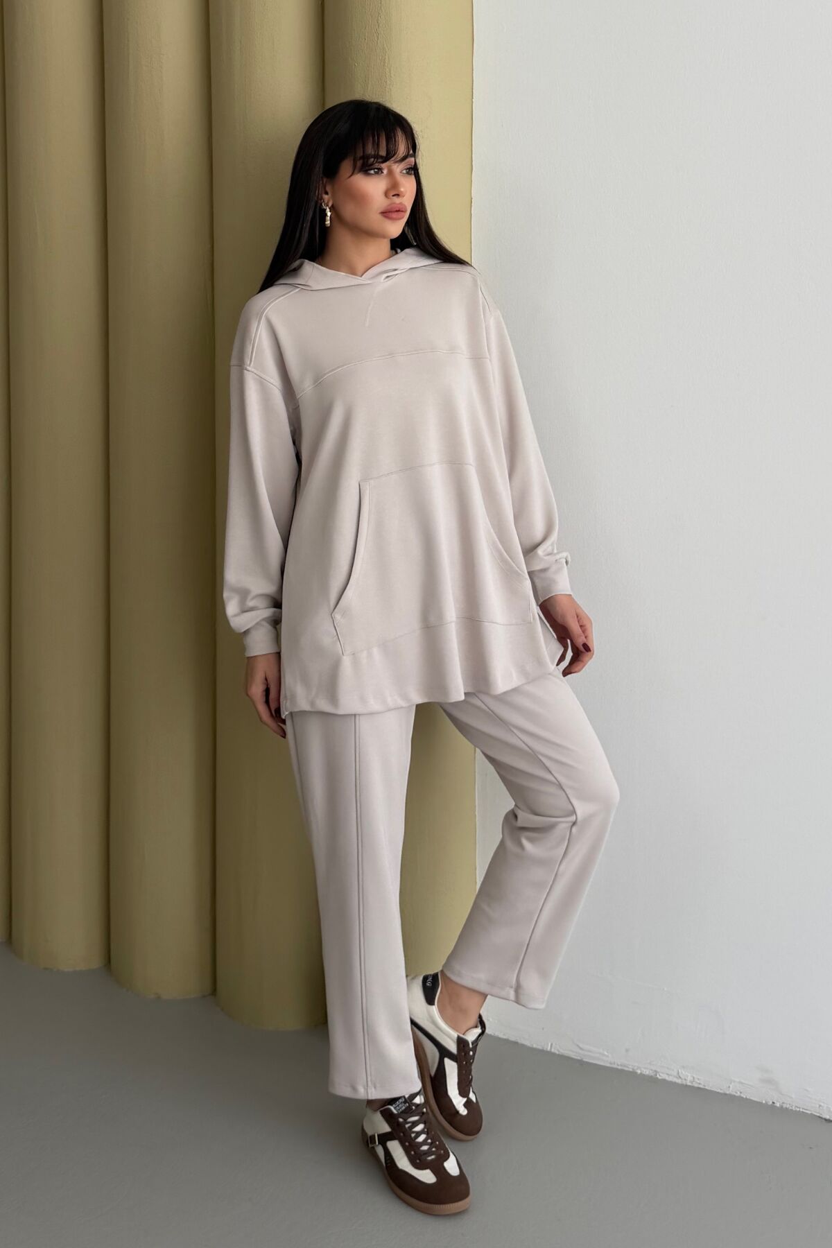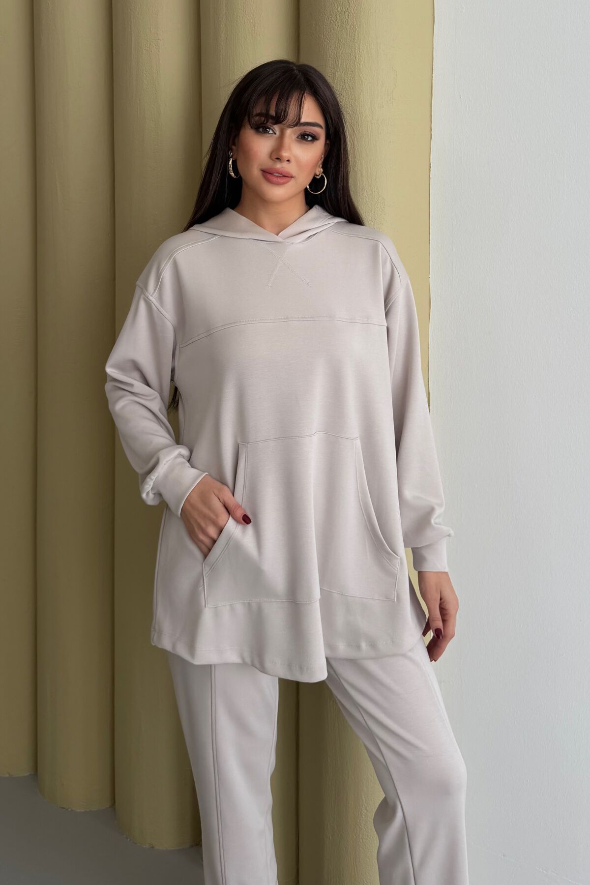 Balenbi Oversize Kapüşonlu Kanguru Cepli Modal Tesettür Takım 1192 - Form Serisi XL - Taş