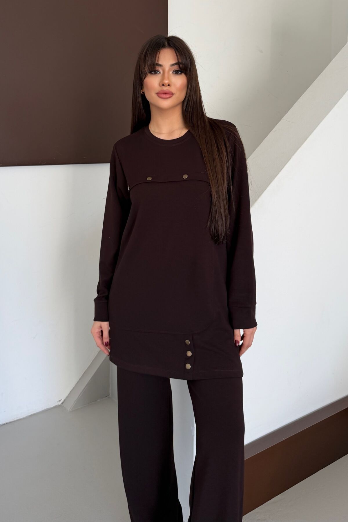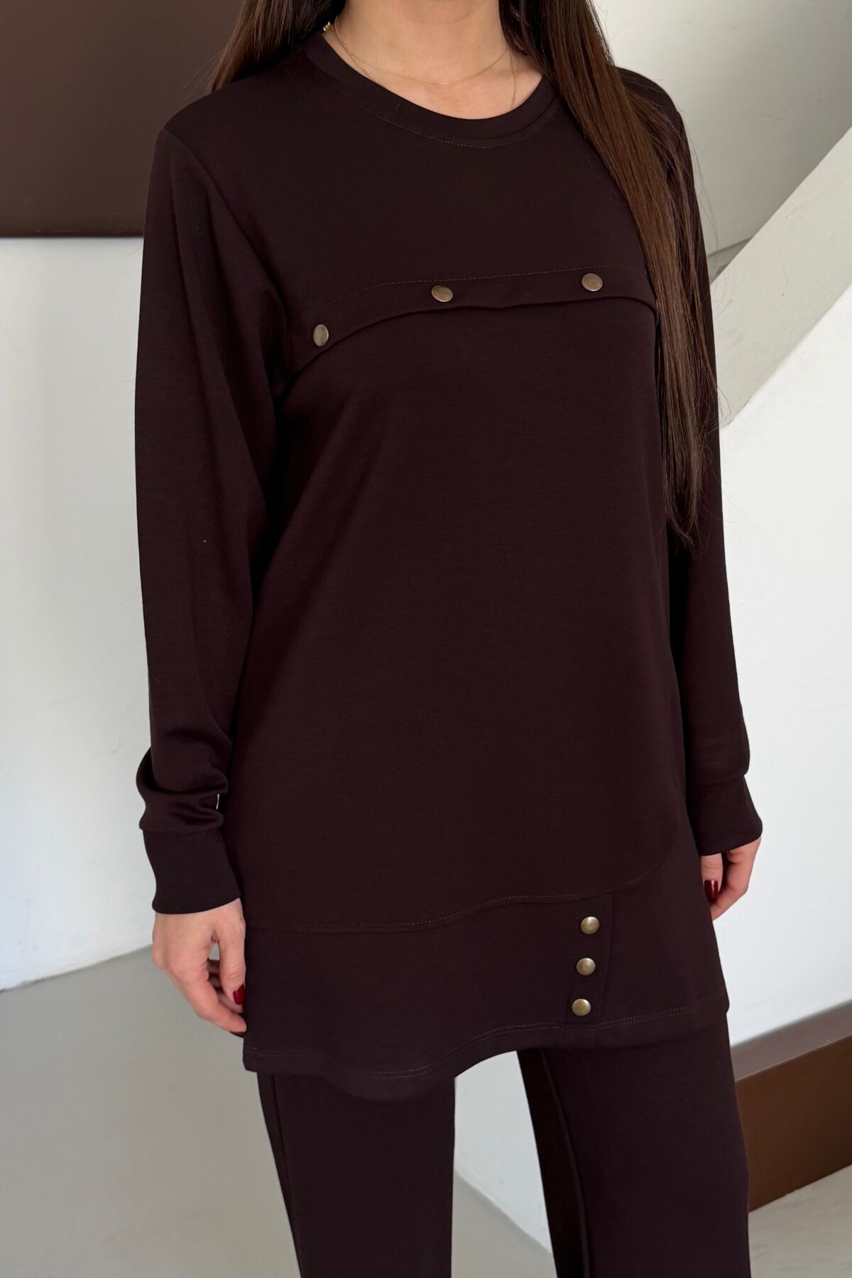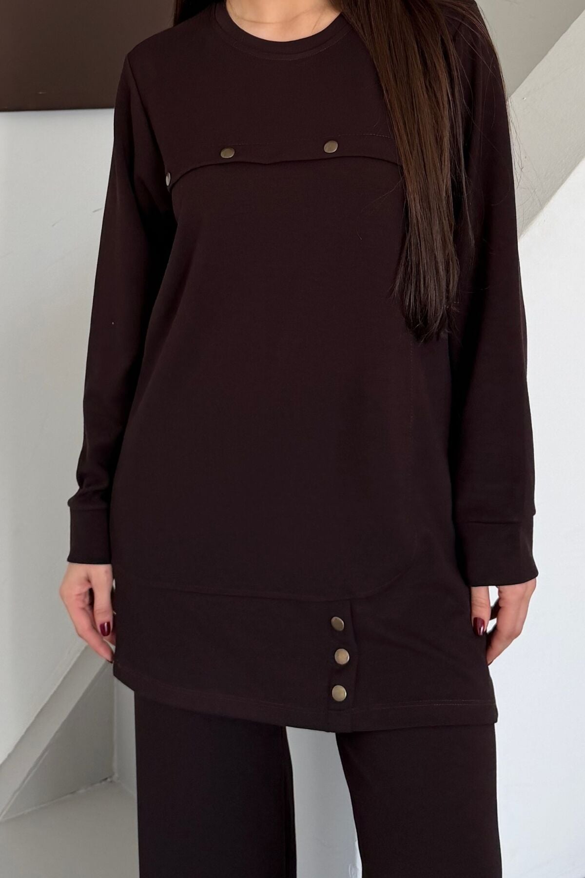 Balenbi Oversize Metal Çıtçıt Detaylı Asimetrik Kesim Modal Tesettür Takım 1187 XL - Kahverengi