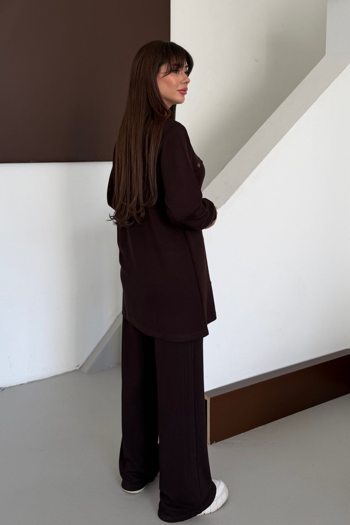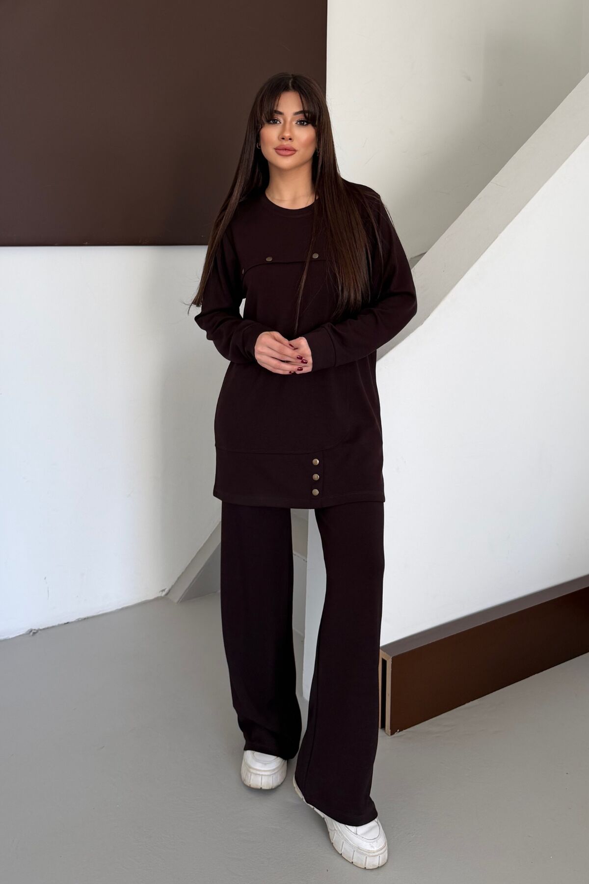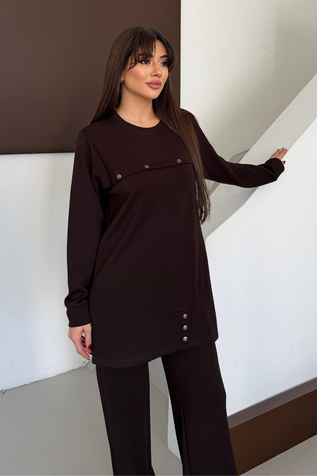 Balenbi Oversize Metal Çıtçıt Detaylı Asimetrik Kesim Modal Tesettür Takım 1187 XL - Kahverengi