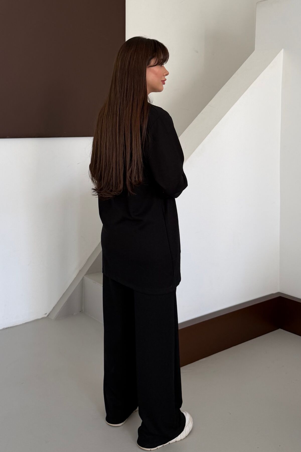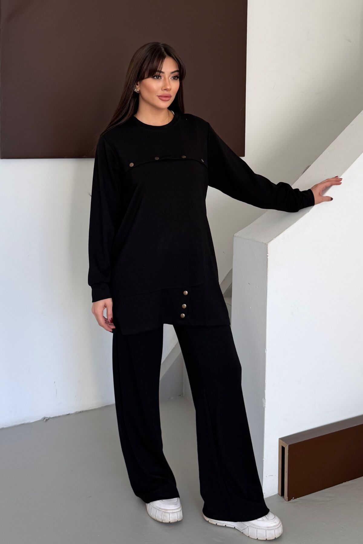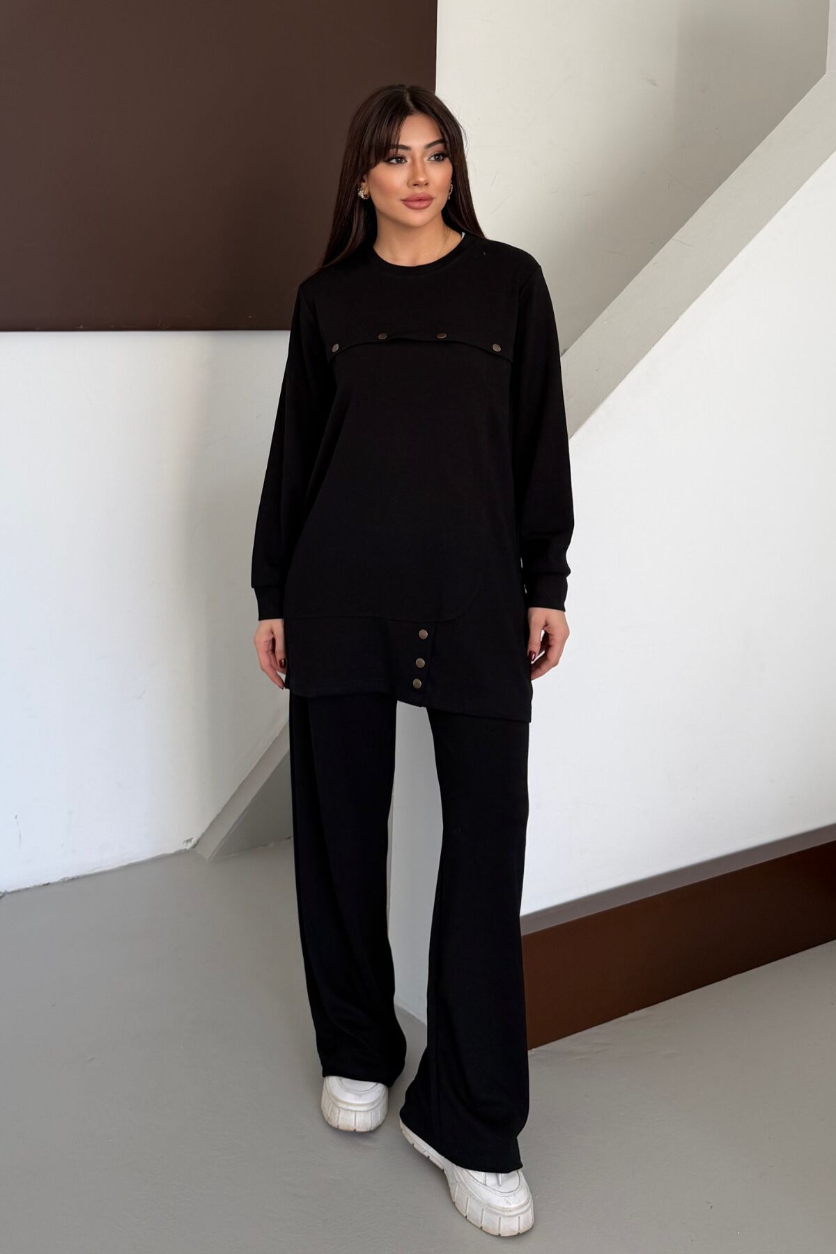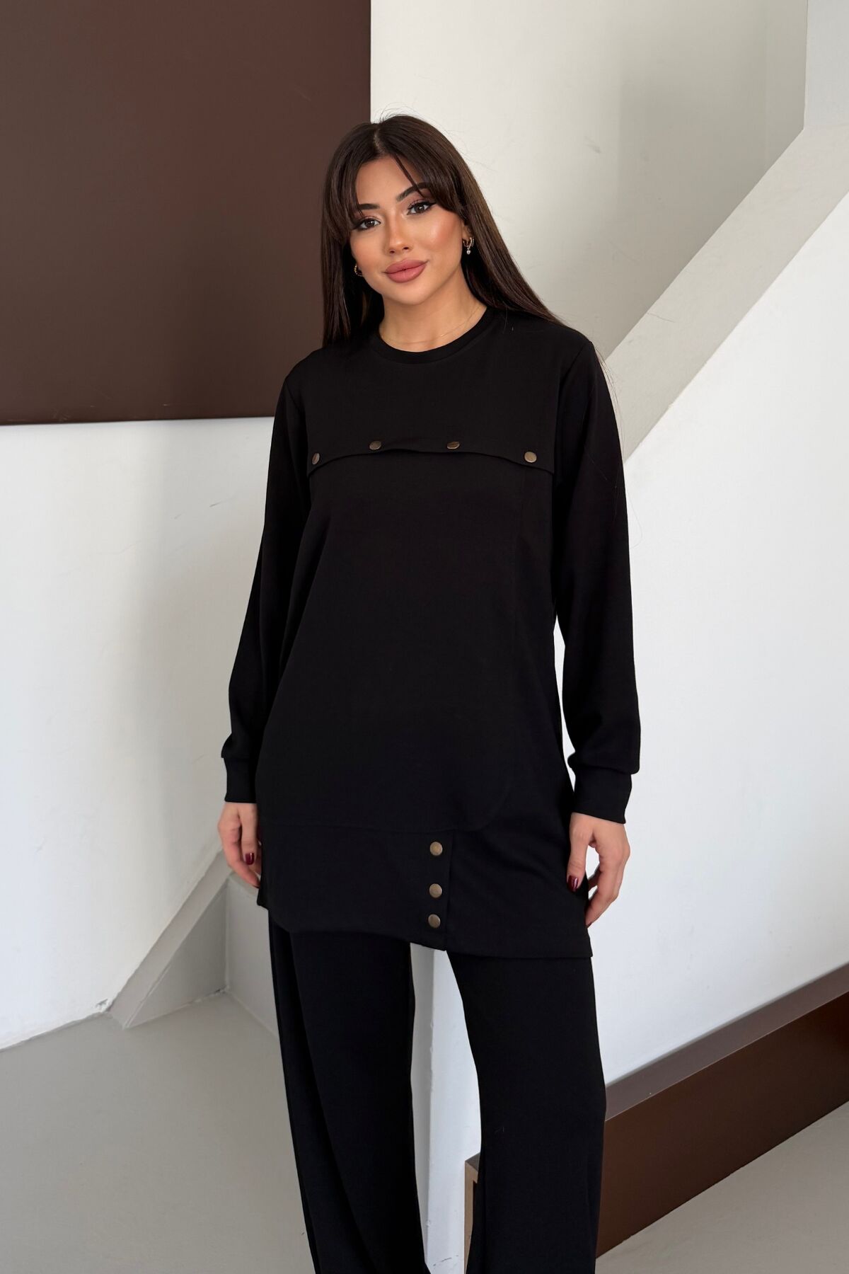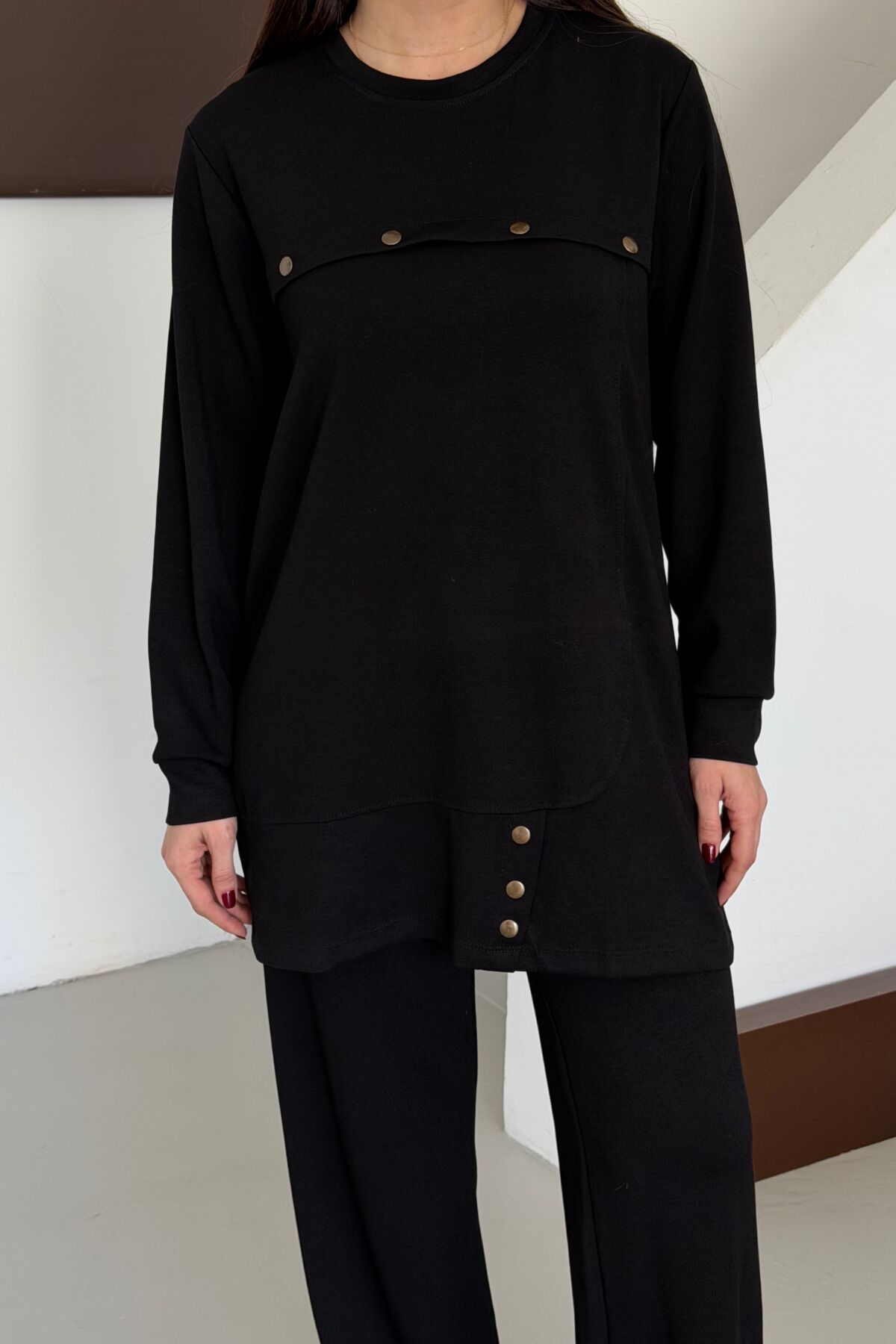 Balenbi Oversize Metal Çıtçıt Detaylı Asimetrik Kesim Modal Tesettür Takım 1187 S - Siyah