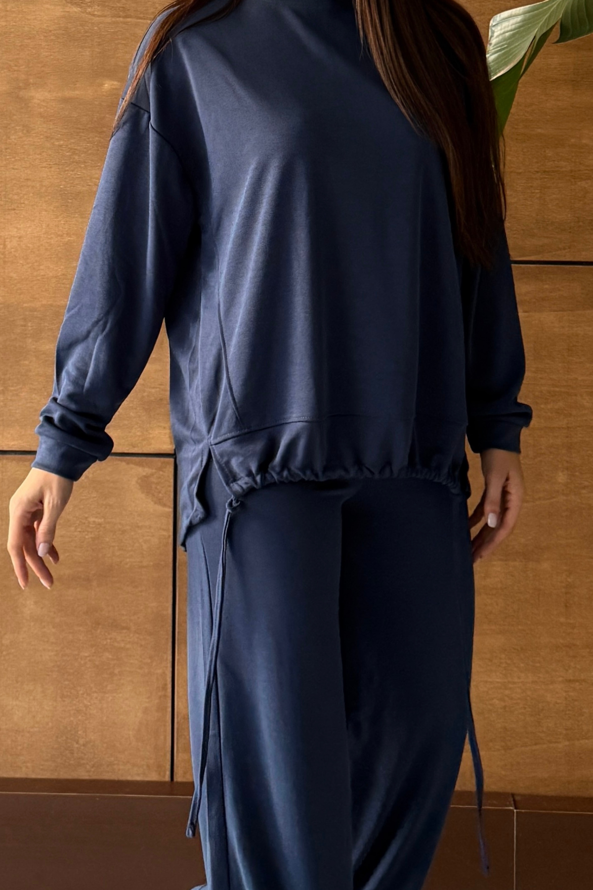 Oversize kesim sweatshirt ve geniş paça pantolondan oluşan bu iki parça kadın takım, hem günlük kullanım hem de ev giyim için ideal bir seçenektir.