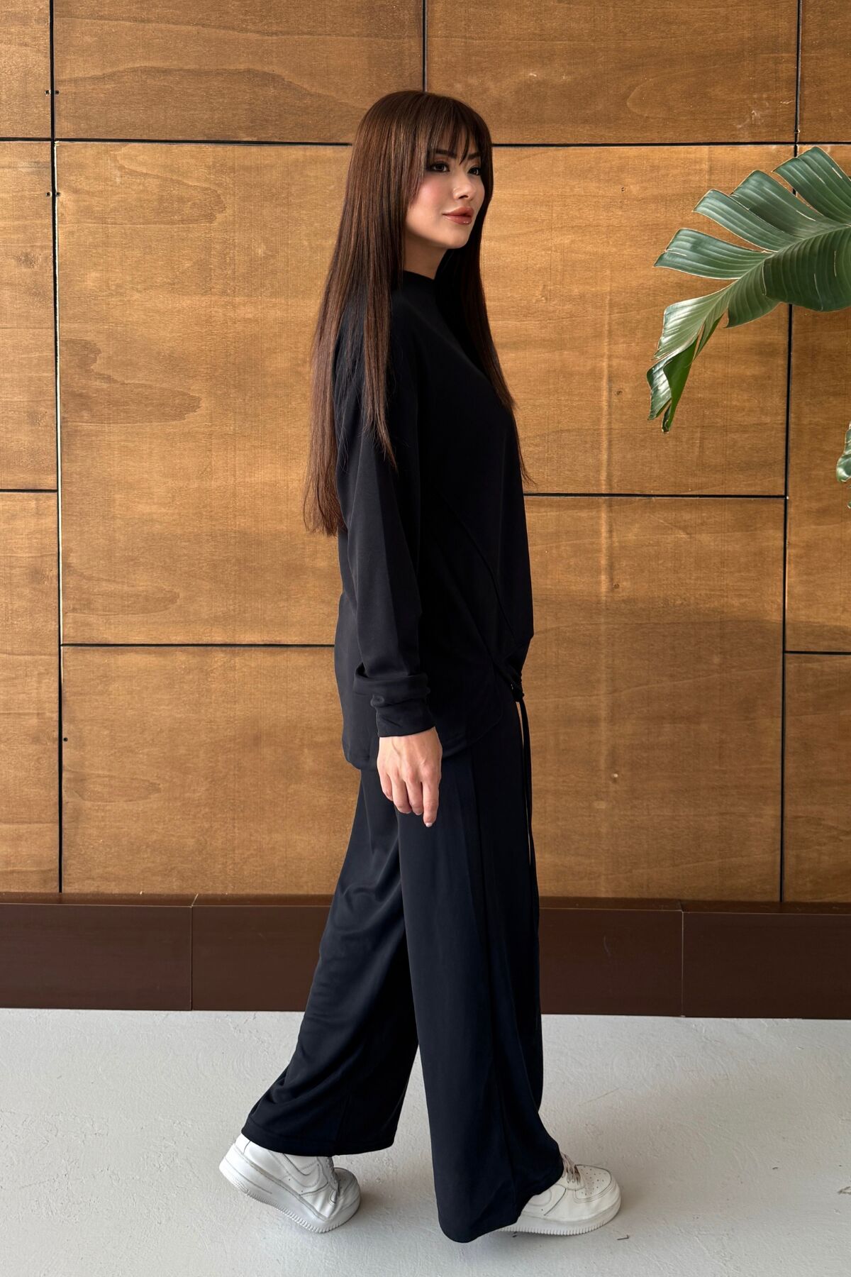 Günlük hayatta, evde, hafta sonu kombinlerinde ve rahat şıklık arayanlar için tercih edilebilecek bu takım; spor ayakkabı, sneaker ve basic aksesuarlarla kolayca kombinlenebilir.