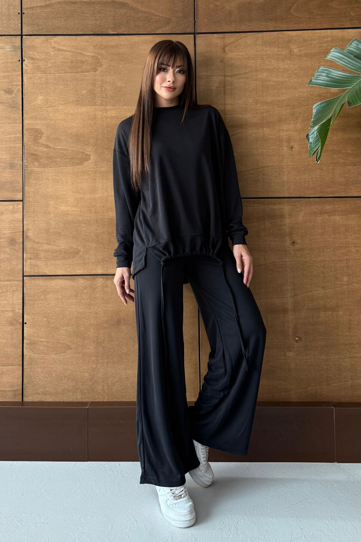 Oversize kesim sweatshirt ve geniş paça pantolondan oluşan bu iki parça kadın takım, hem günlük kullanım hem de ev giyim için ideal bir seçenektir.