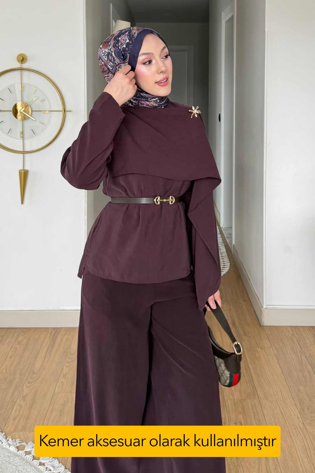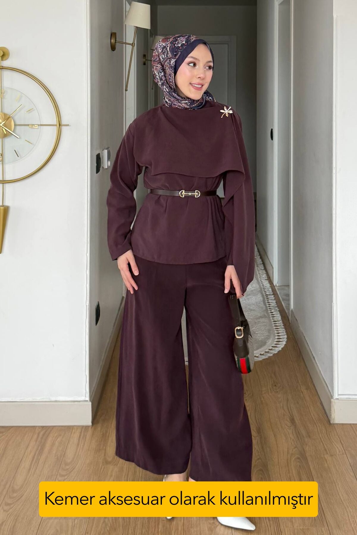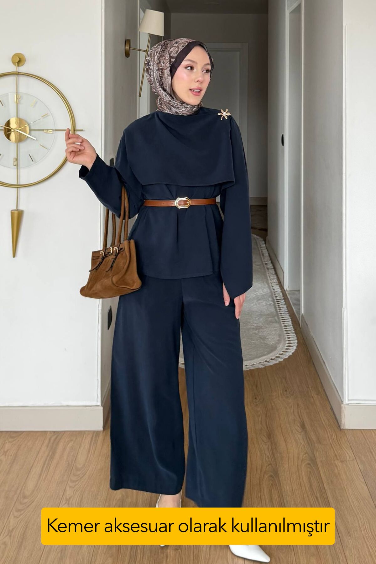 Balenbi Pelerin Detaylı Kemerli Tesettür Kadın Bol Paça Pantolonlu Takım 1203 – Form Serisi