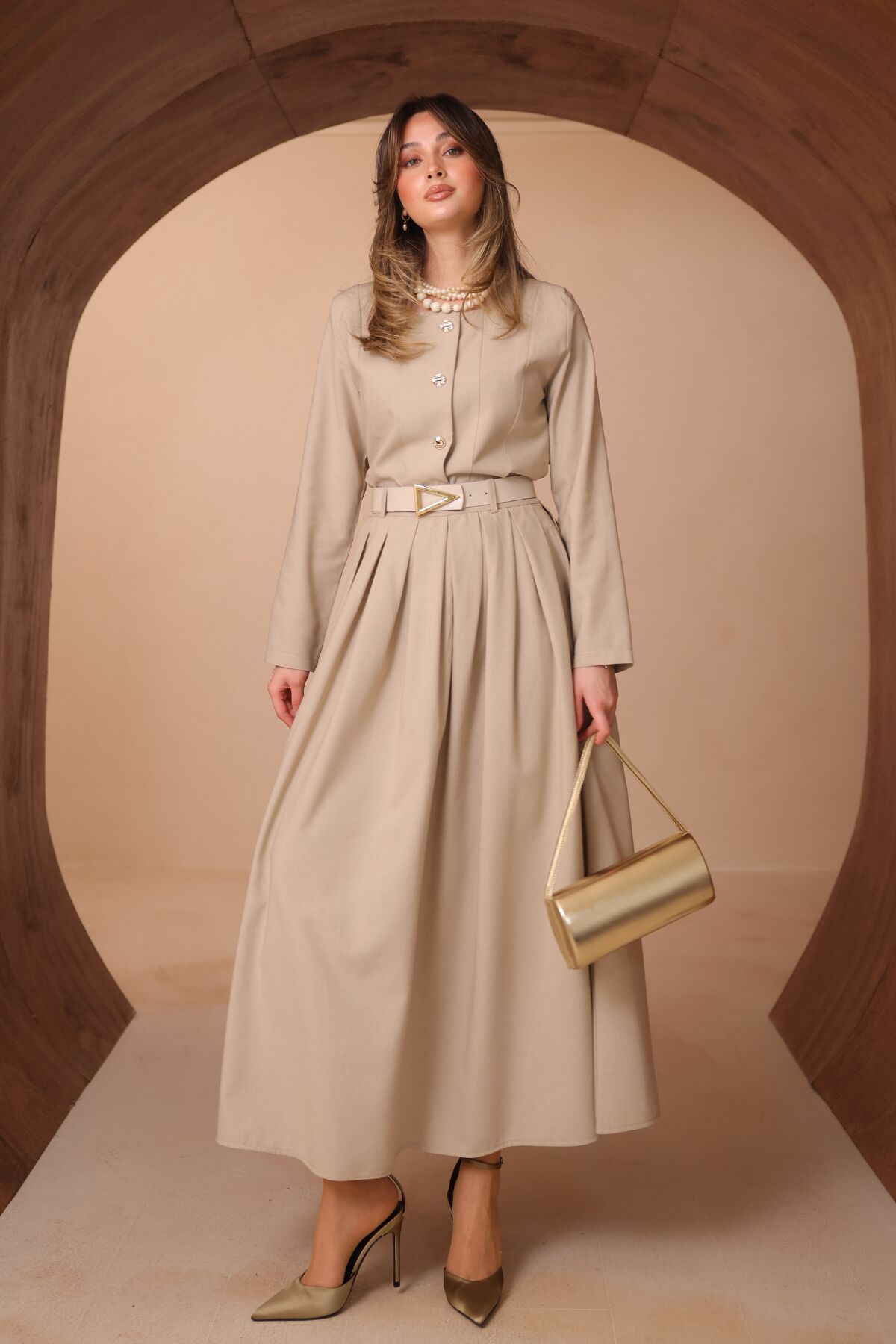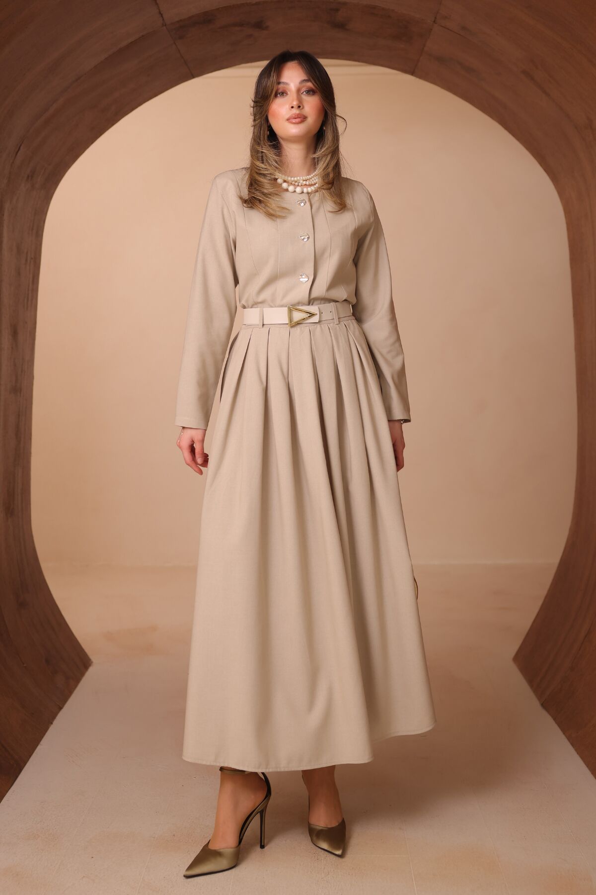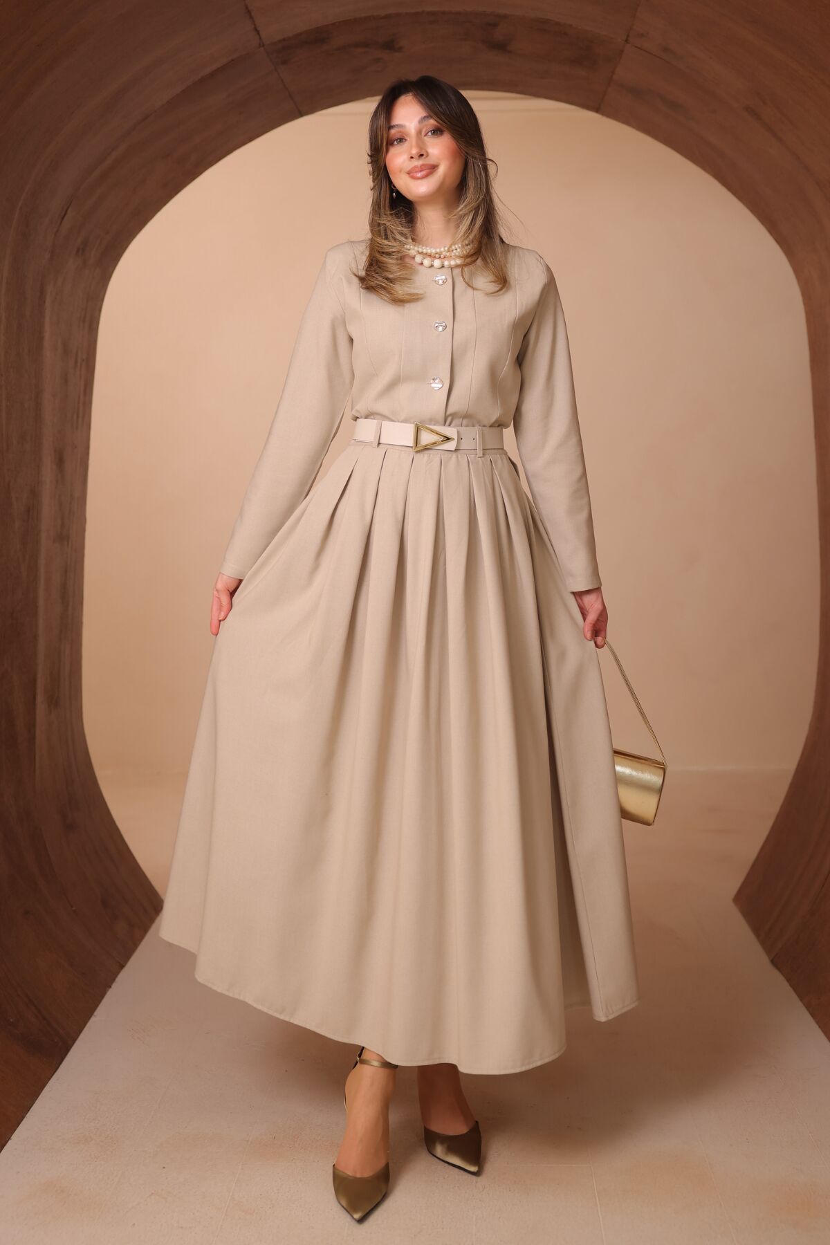 Balenbi Pileli Uzun Etek Kemerli Düğmeli Tesettür Kadın Takım 1200 - Form Serisi L/XL - Bej