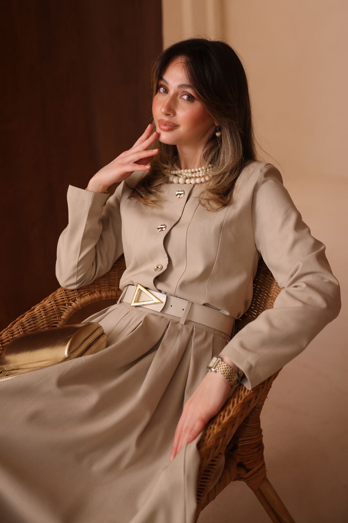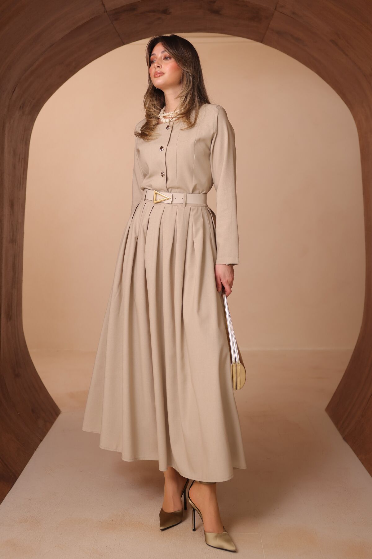 Balenbi Pileli Uzun Etek Kemerli Düğmeli Tesettür Kadın Takım 1200 - Form Serisi M/L - Bej