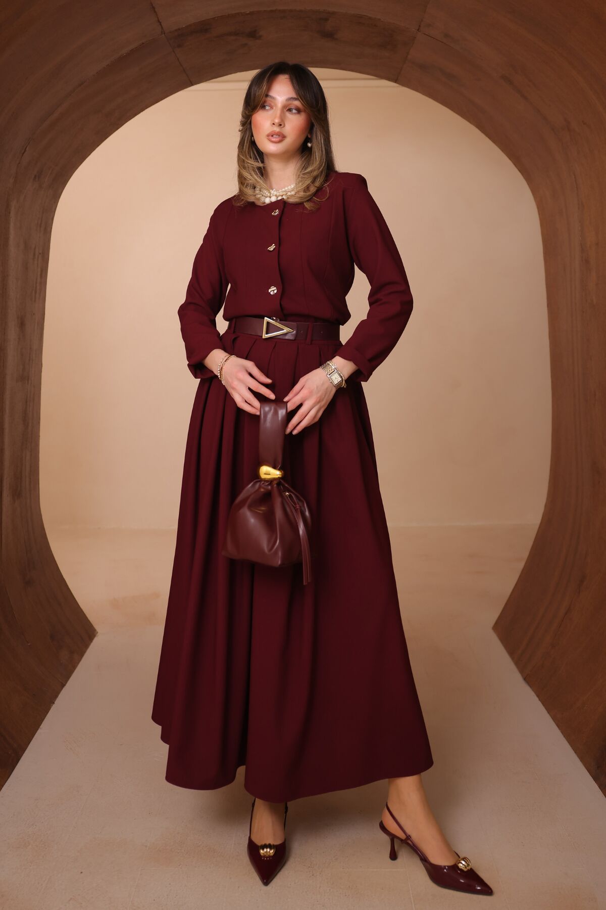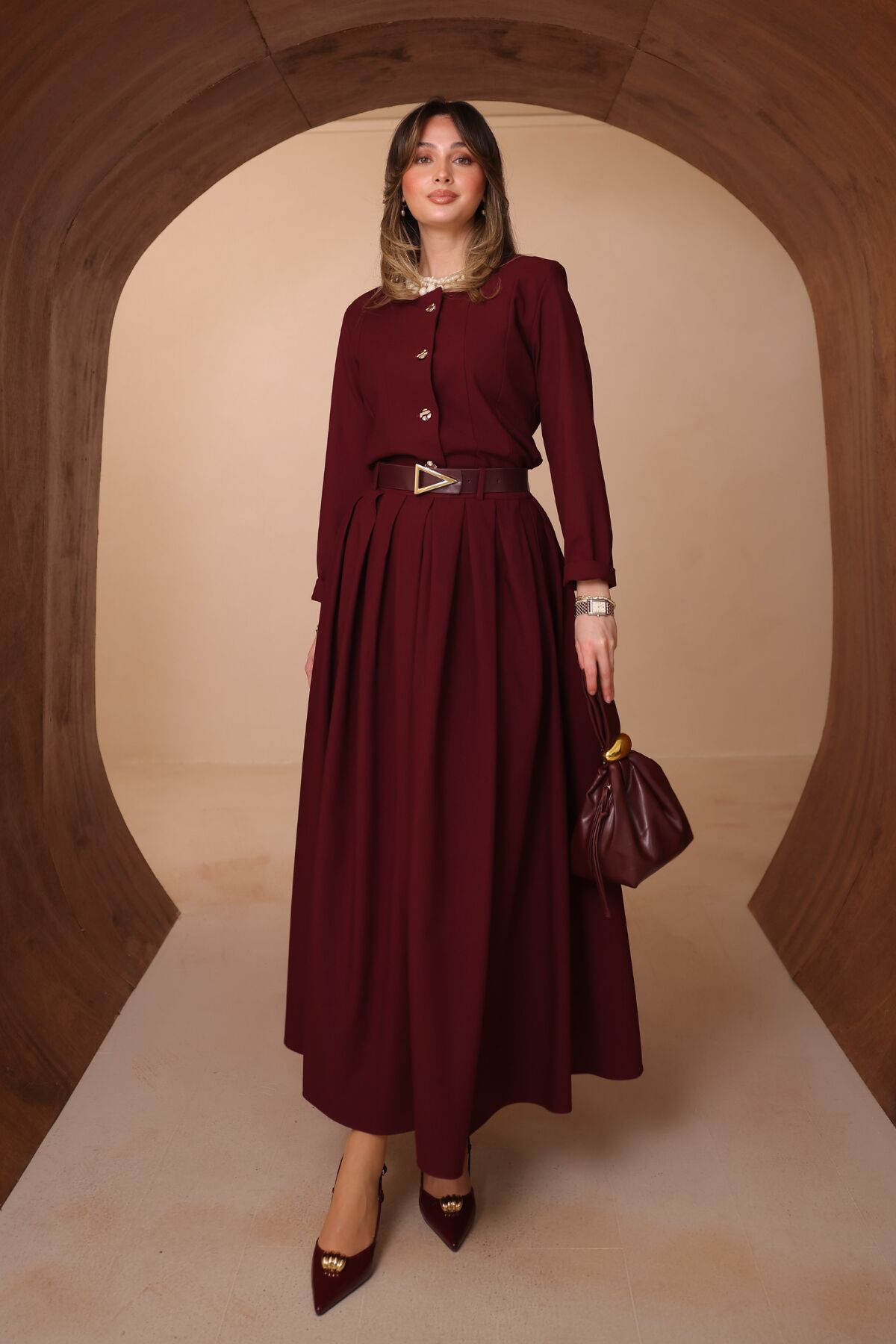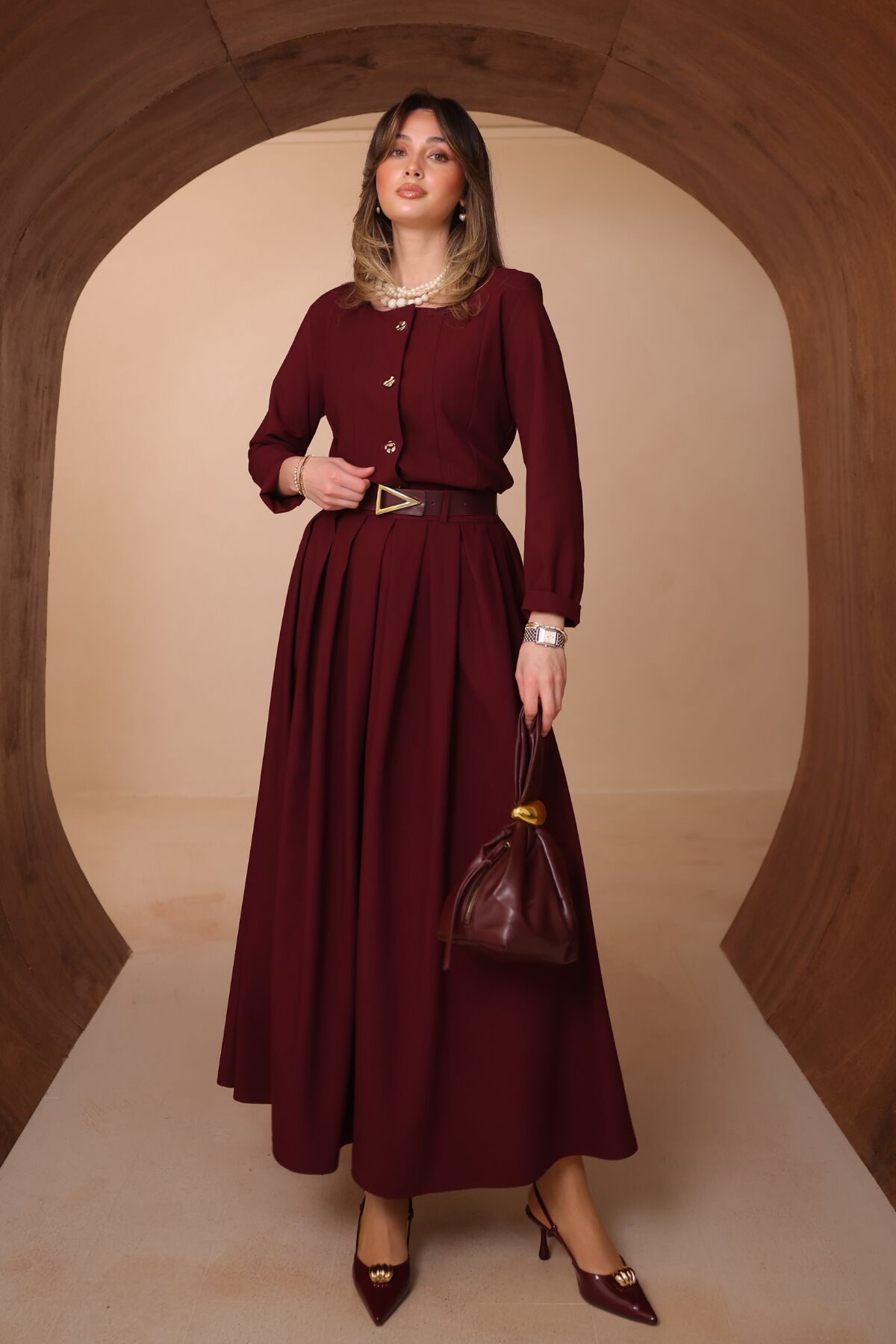 Balenbi Pileli Uzun Etek Kemerli Düğmeli Tesettür Kadın Takım 1200 - Form Serisi M/L - Bordo