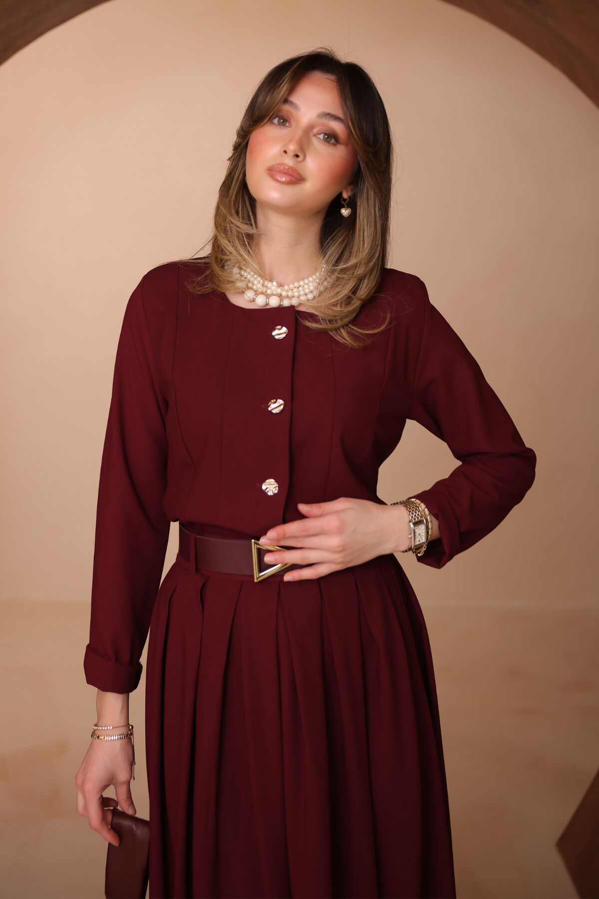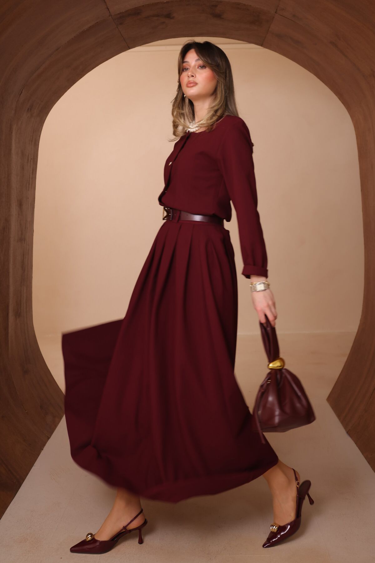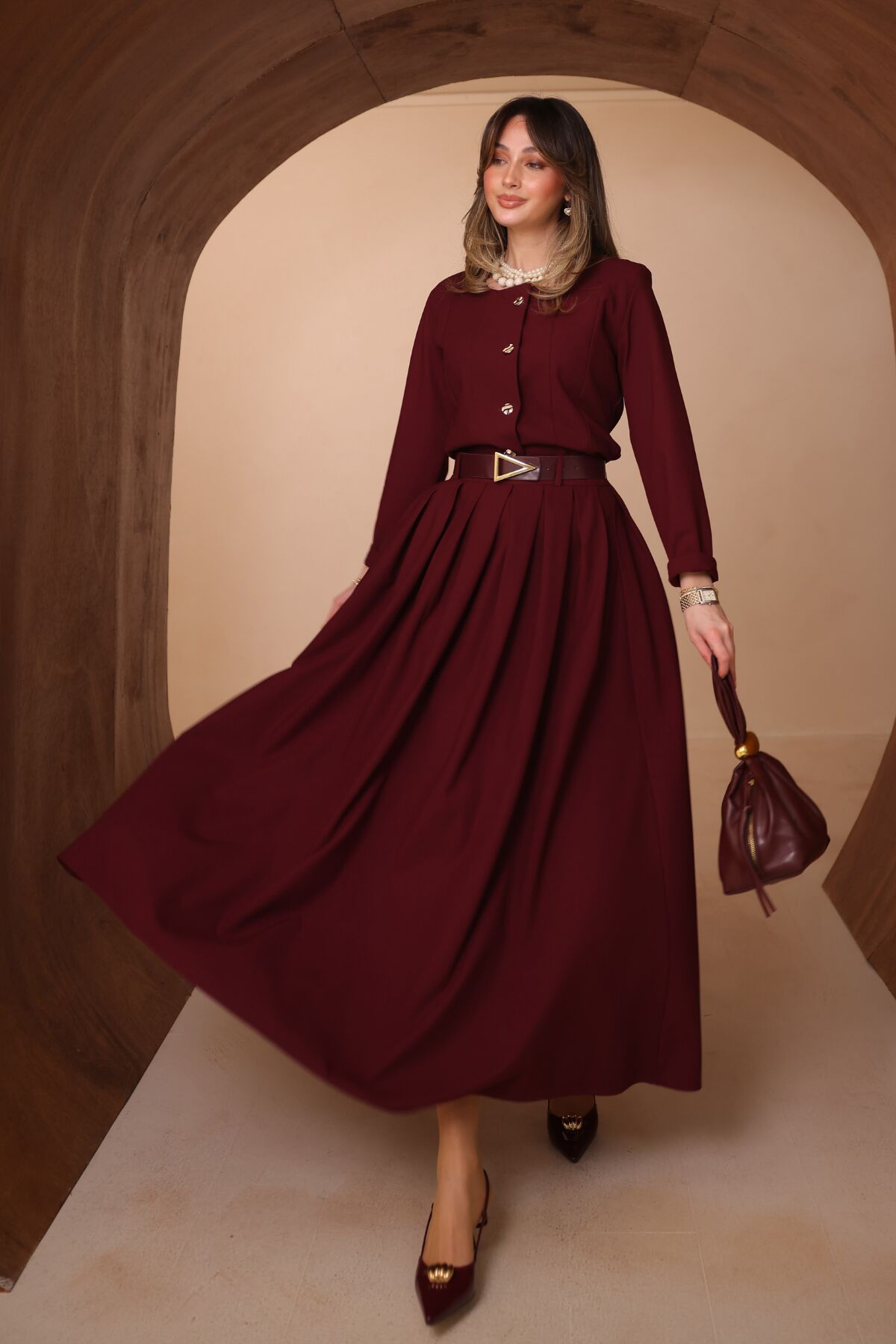 Balenbi Pileli Uzun Etek Kemerli Düğmeli Tesettür Kadın Takım 1200 - Form Serisi M/L - Bordo