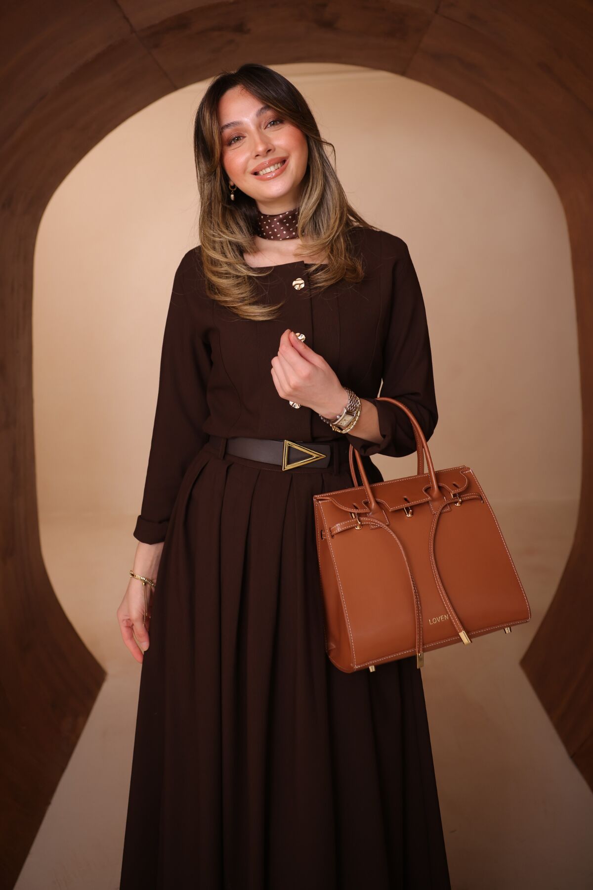 Balenbi Pileli Uzun Etek Kemerli Düğmeli Tesettür Kadın Takım 1200 - Form Serisi S/M - Kahverengi