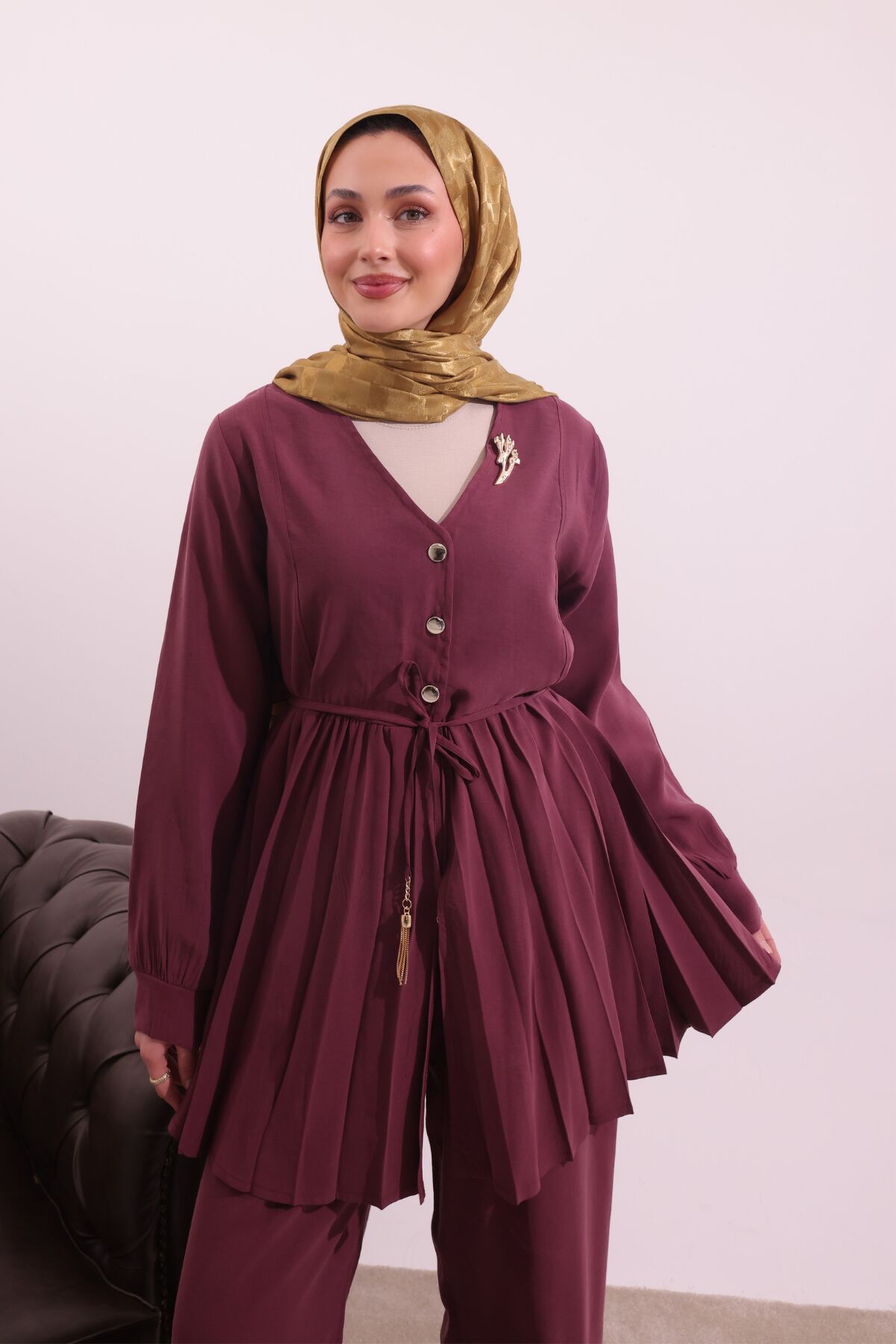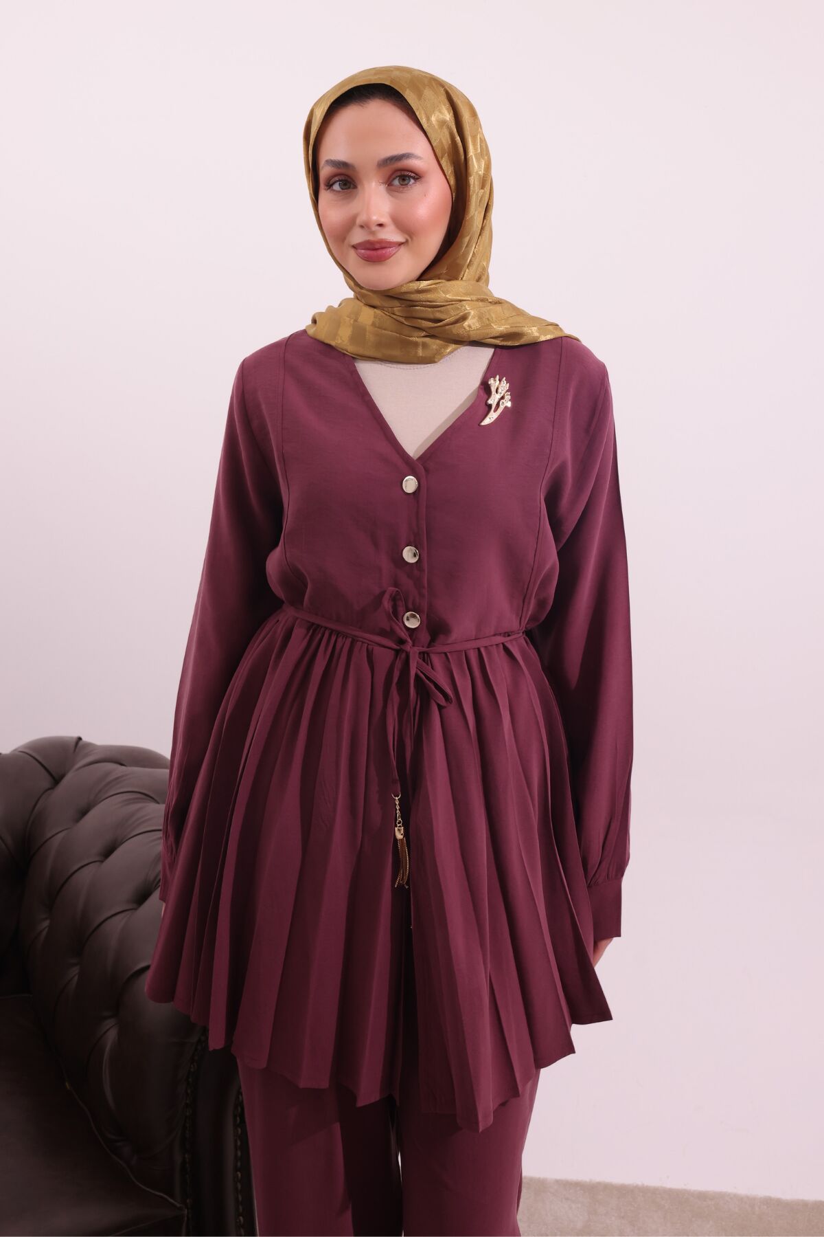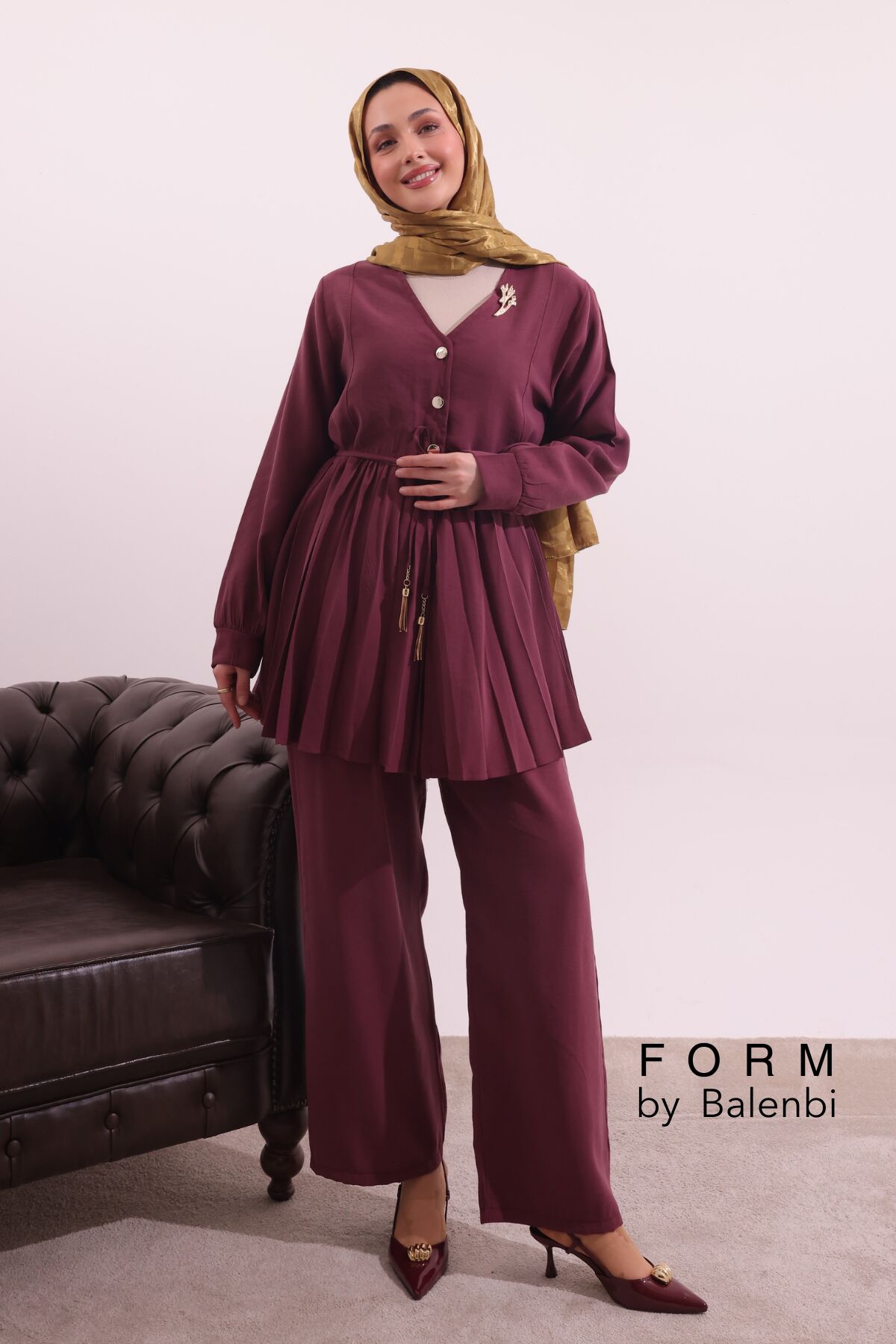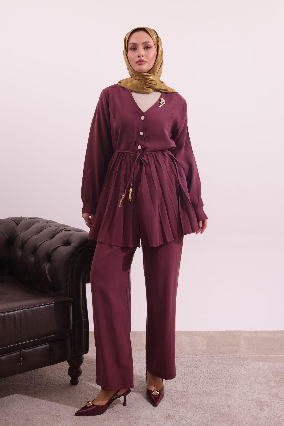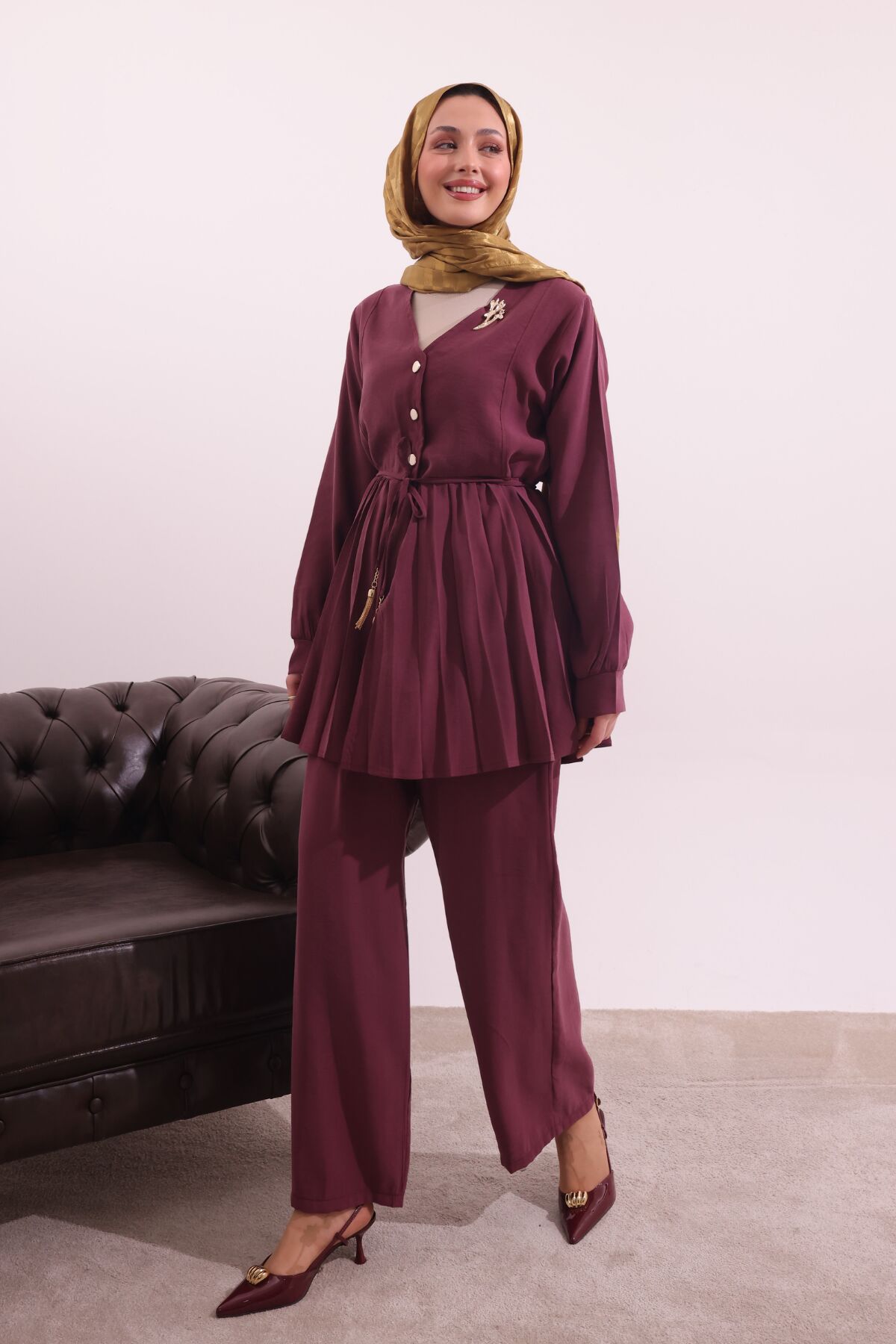 Balenbi Pilise Detaylı Beli Bağcıklı Dokuma Tesettür Takım 1182 – Form Serisi XL/2XL - Bordo