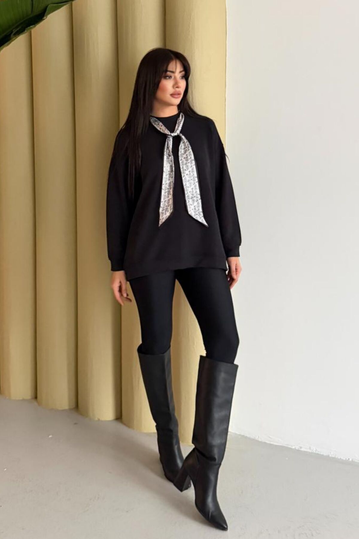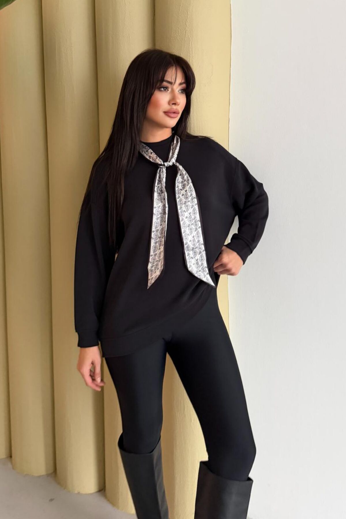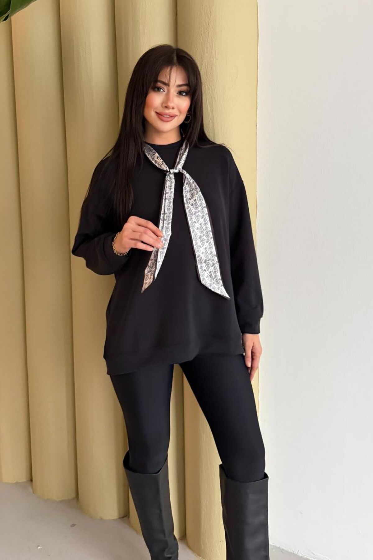 Balenbi Premium Modal Fular Detaylı Bisiklet Yaka Oversize Tunik 1177 S - Siyah