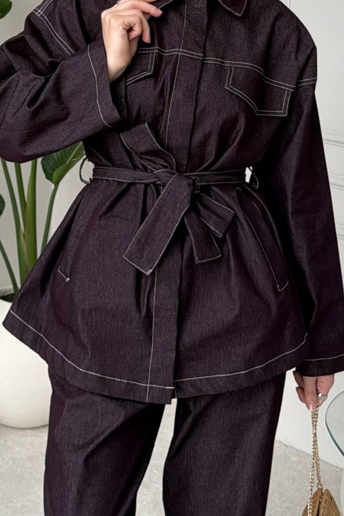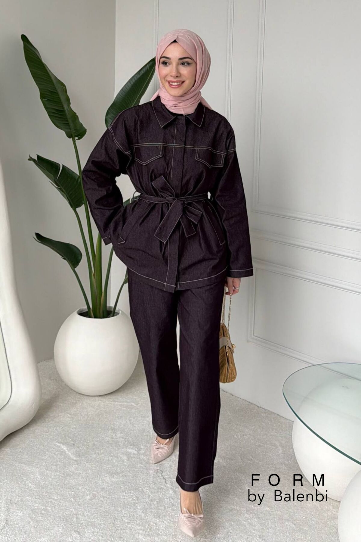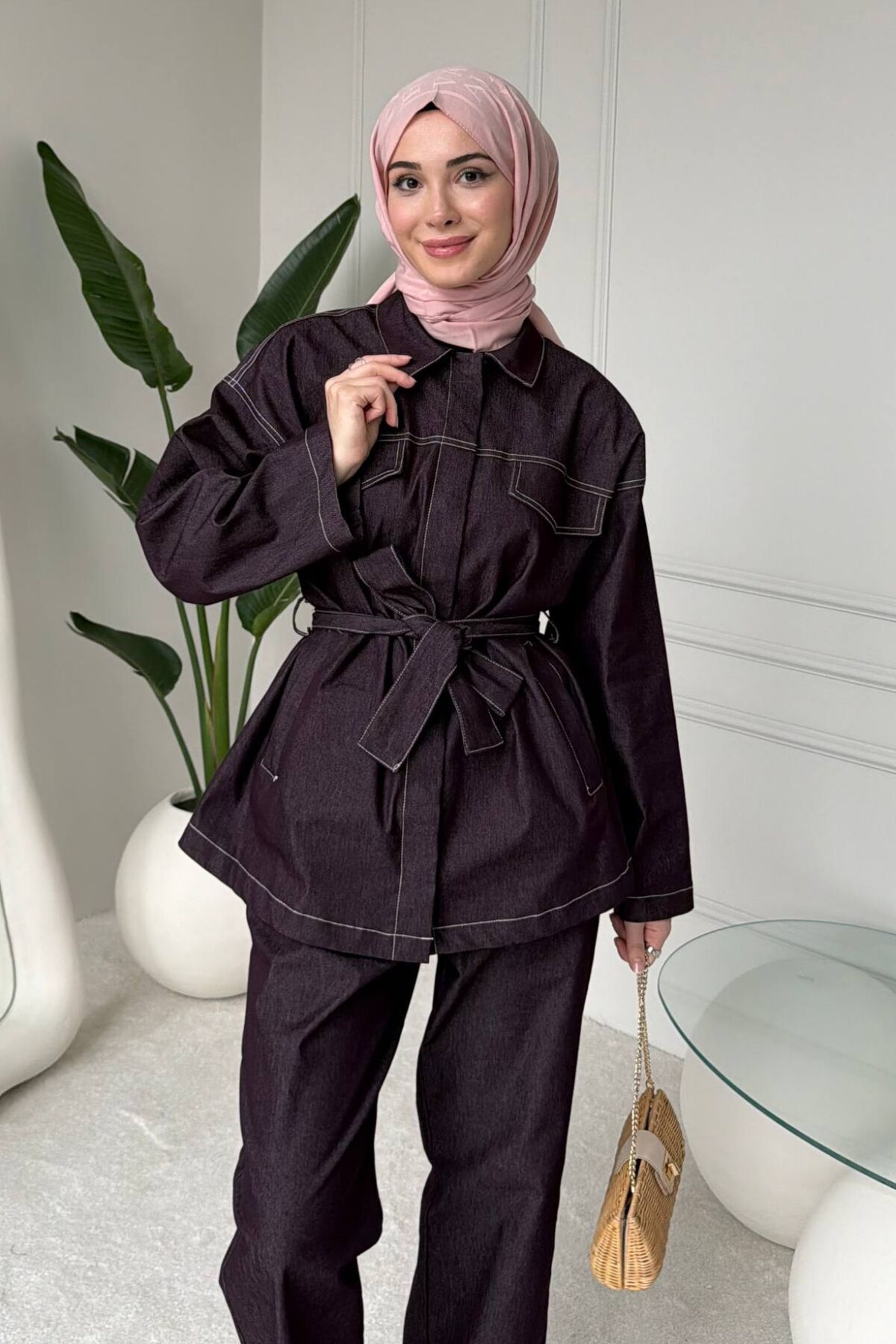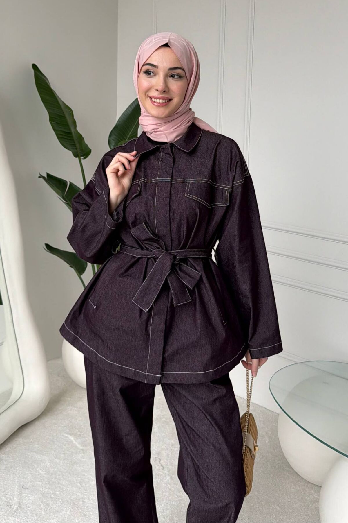 Balenbi Rahat Kesim Bağlama Detaylı Tesettür Kadın Denim Takım 1165 – Form Serisi 44-46 - Mürdüm