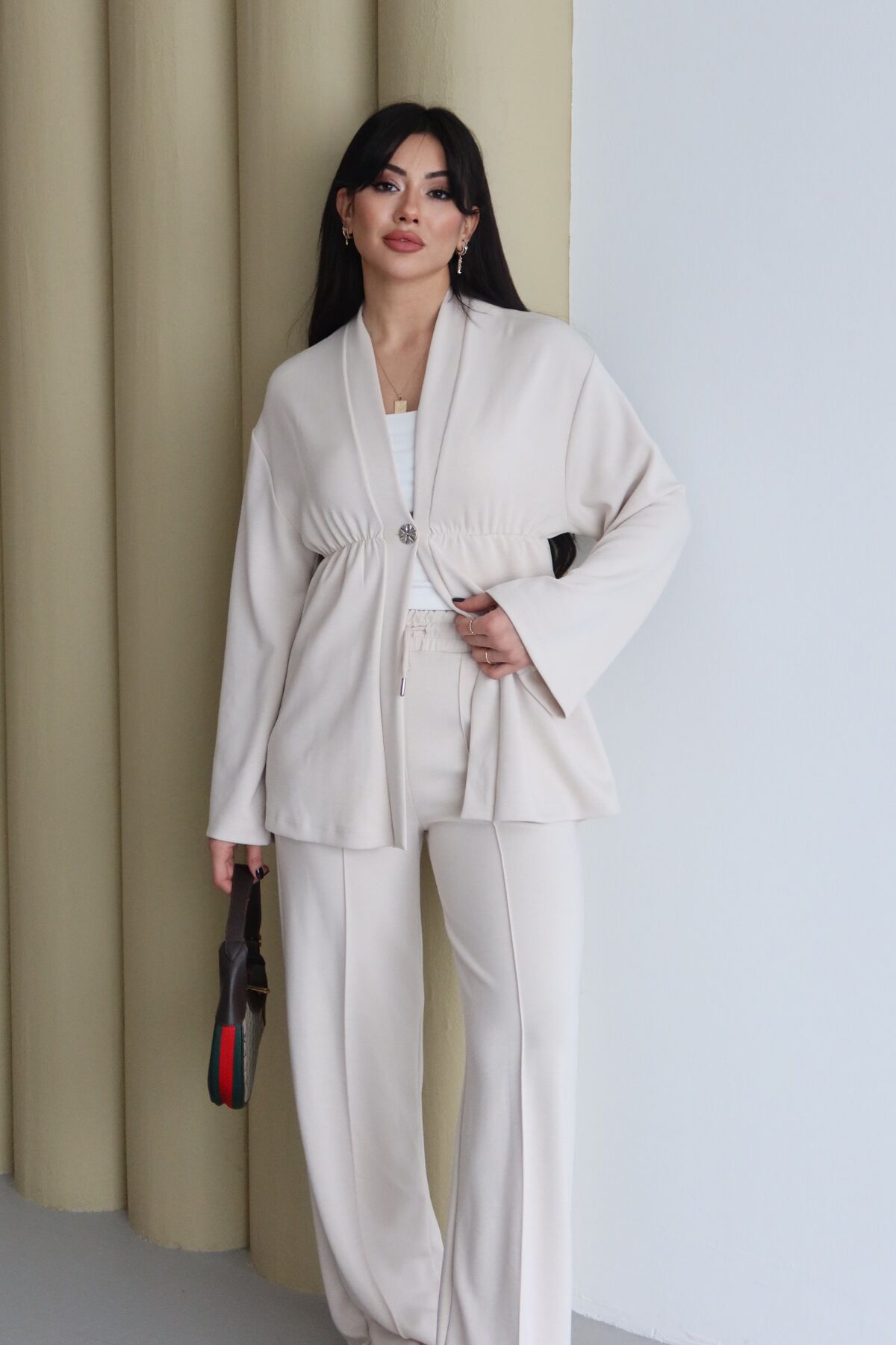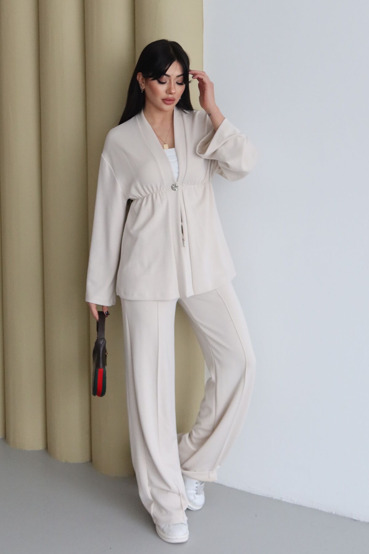 Balenbi Şal Yaka Büzgü Detaylı Rahat Kalıp Modal Kimono Tesettür Takım 1179 XL - Taş