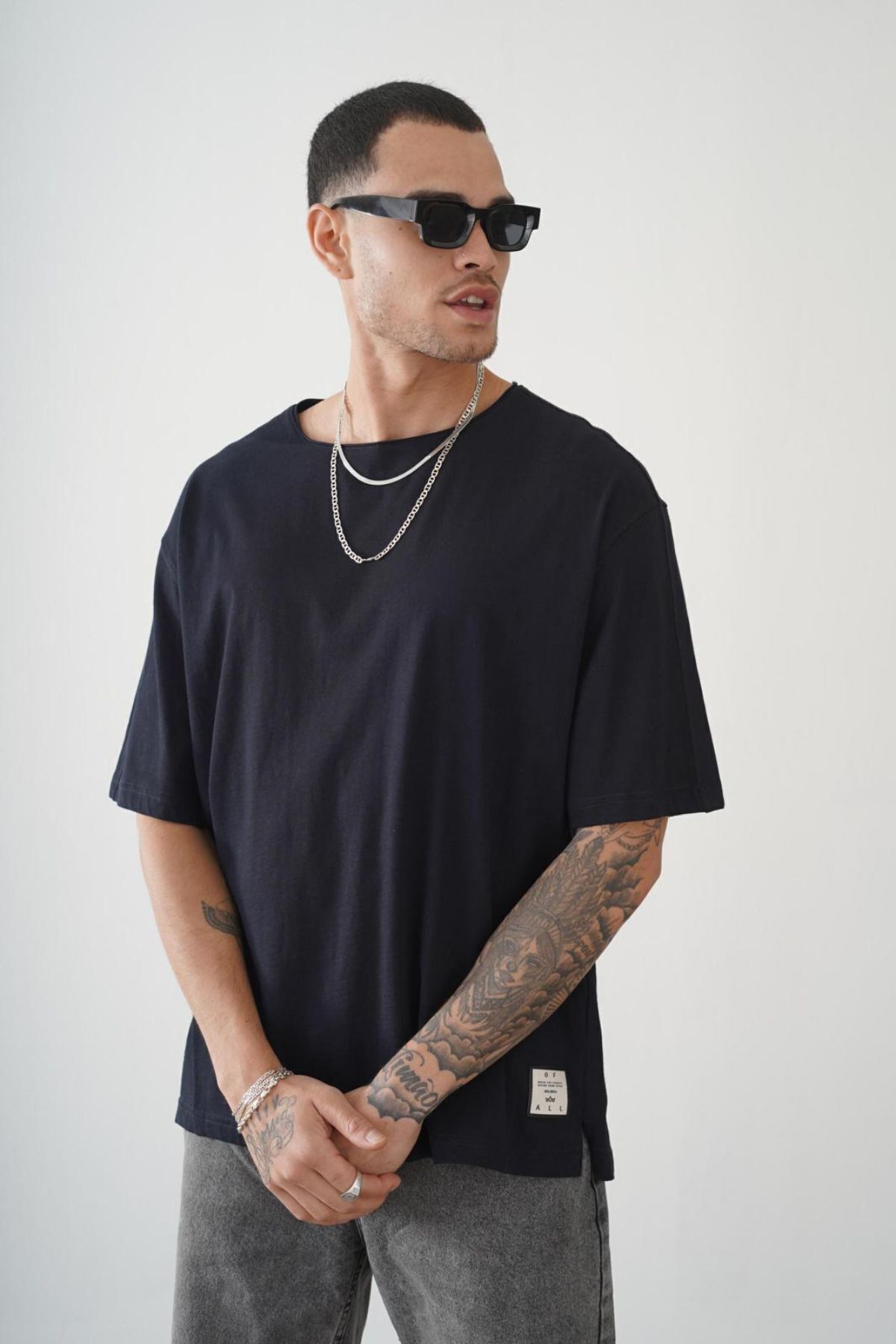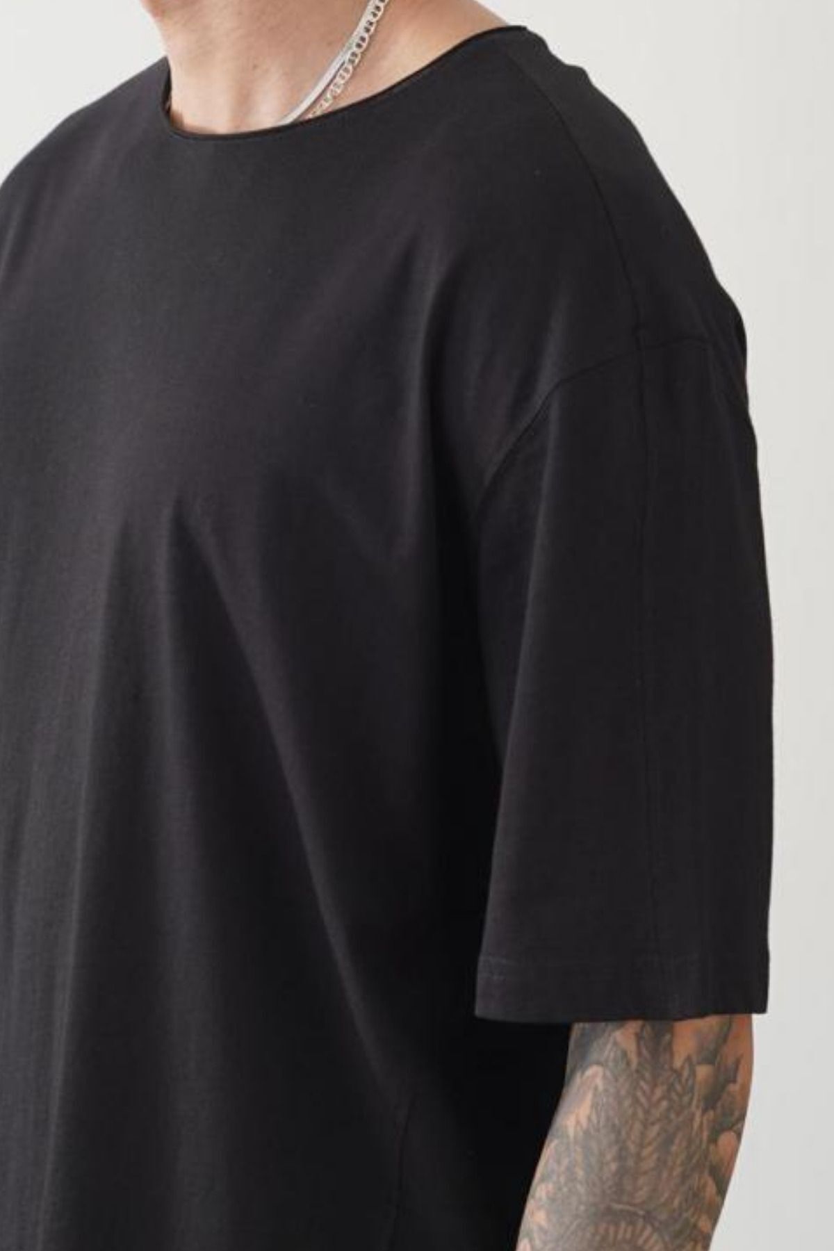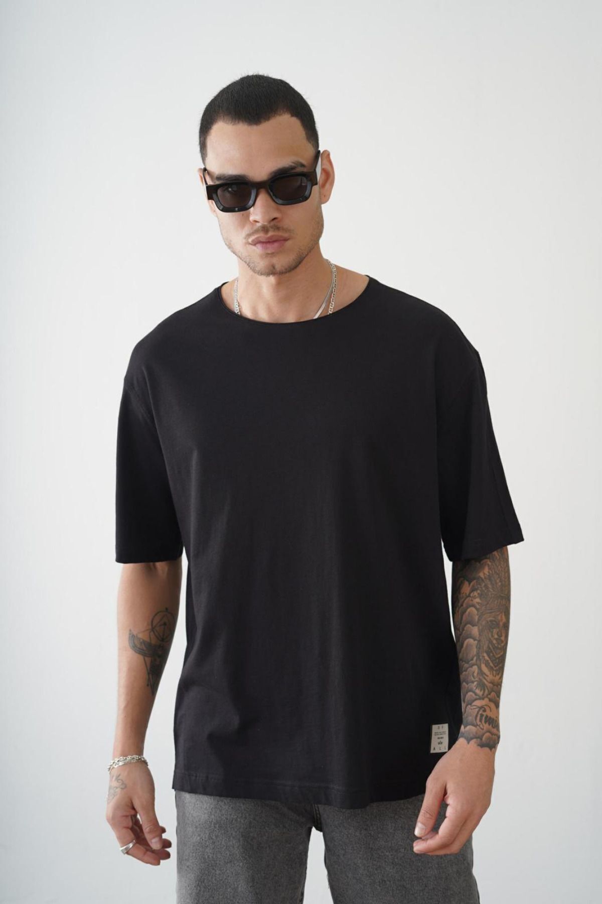 Balenbi Unisex Pis Yaka Basic Eteği Armalı Oversize Kalıp Tişört 1013 M - Siyah