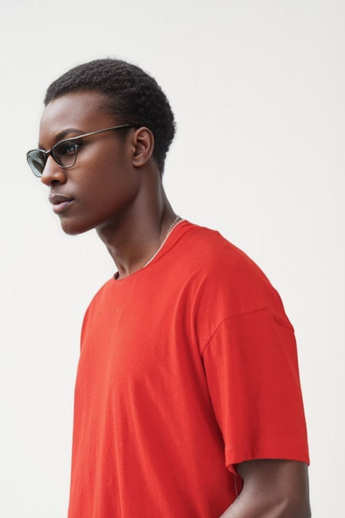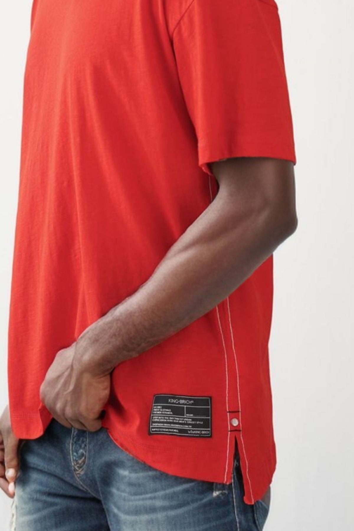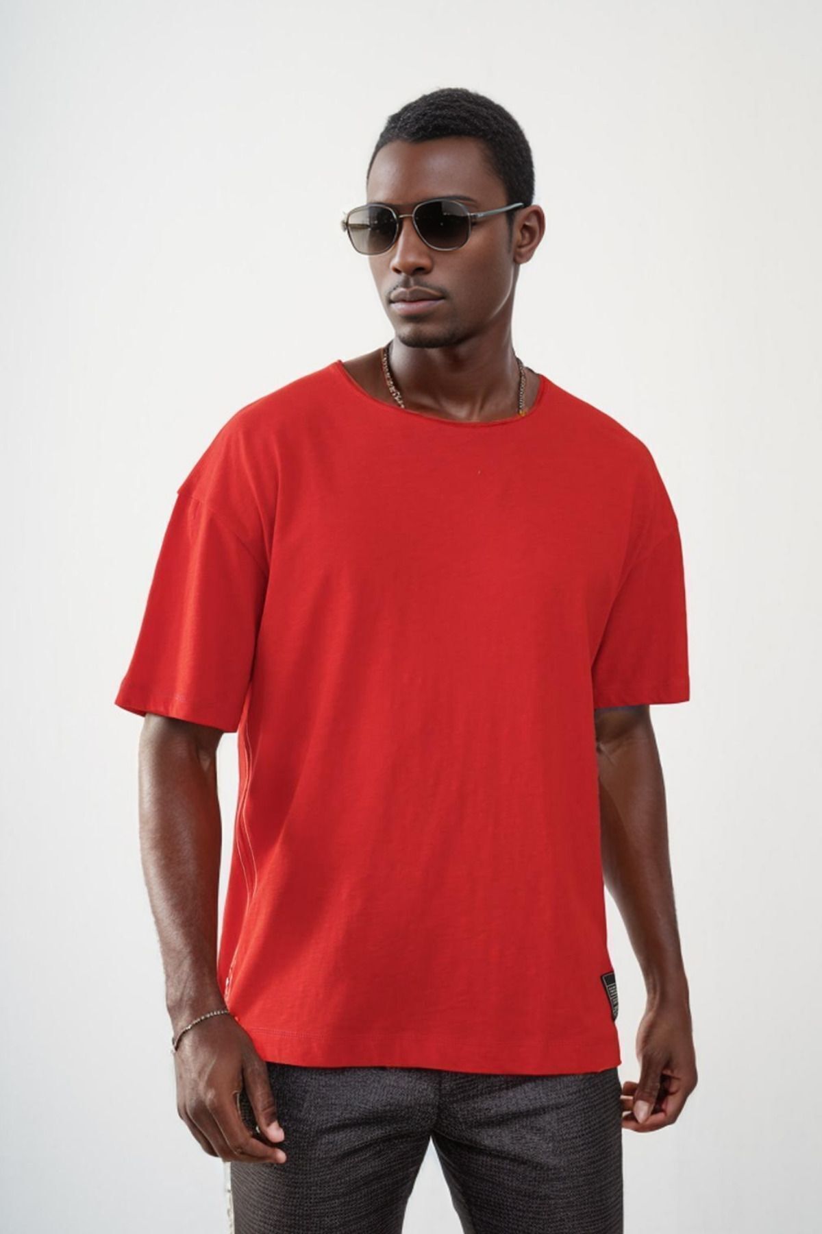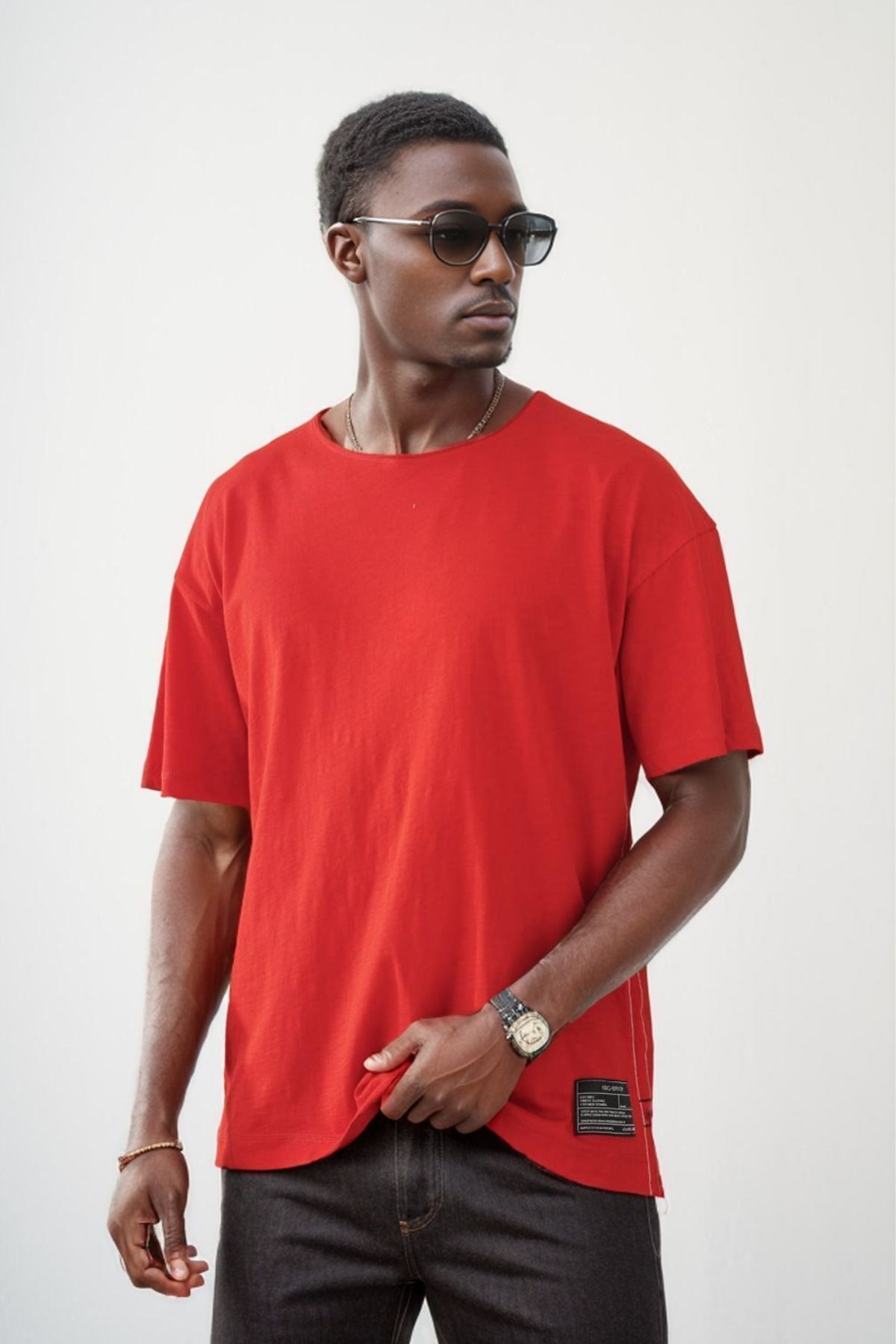 Balenbi Unisex Pis Yaka Basic Eteği Armalı Oversize Kalıp Tişört 1014 M - Kırmızı