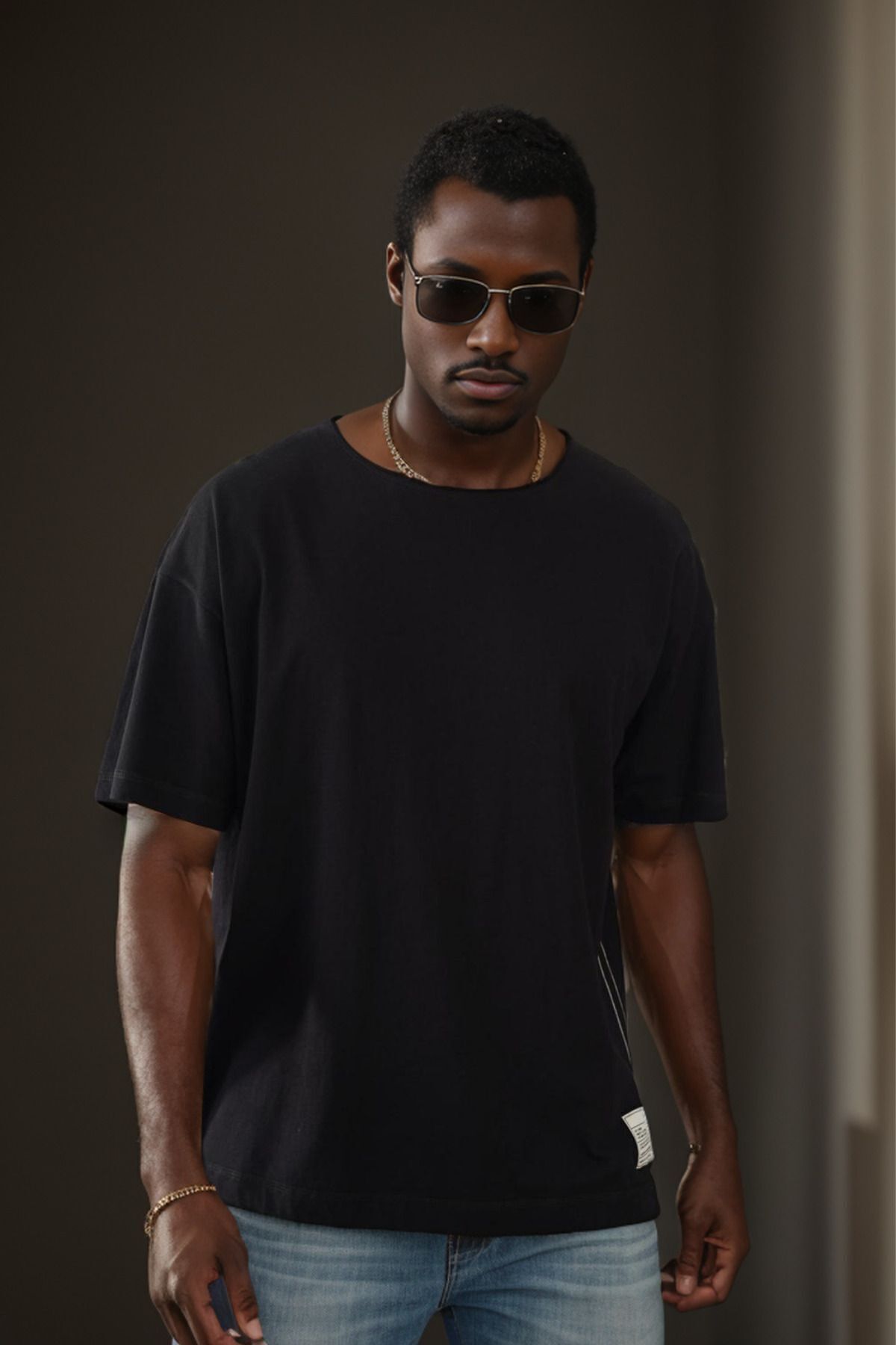 Balenbi Unisex Pis Yaka Basic Eteği Armalı Oversize Kalıp Tişört 1014 L - Siyah