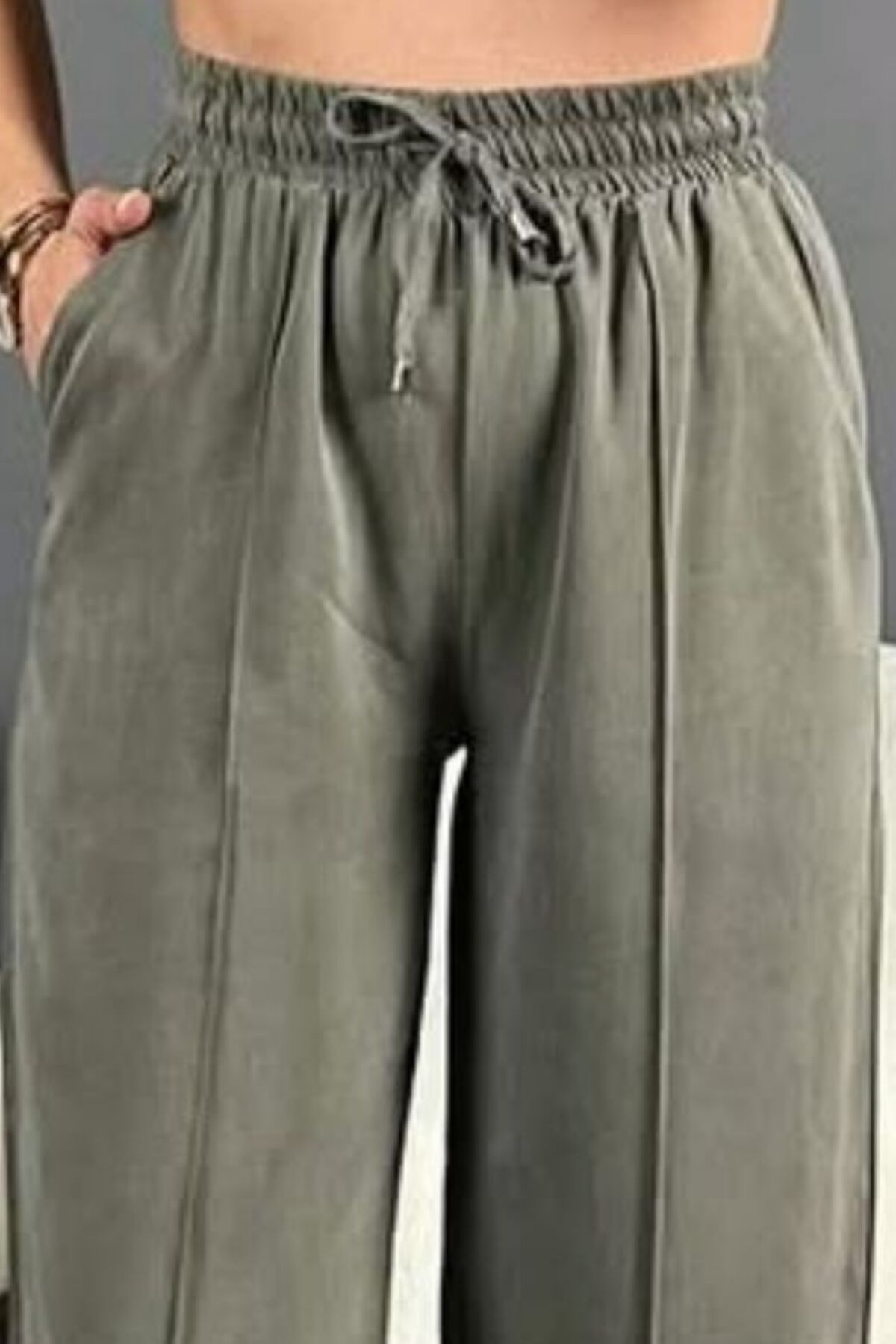 Feela Moda 2007 Bağcıklı Beli Lastikli Modal Çımalı Palazzo Kadın Pantolon 40 - Haki