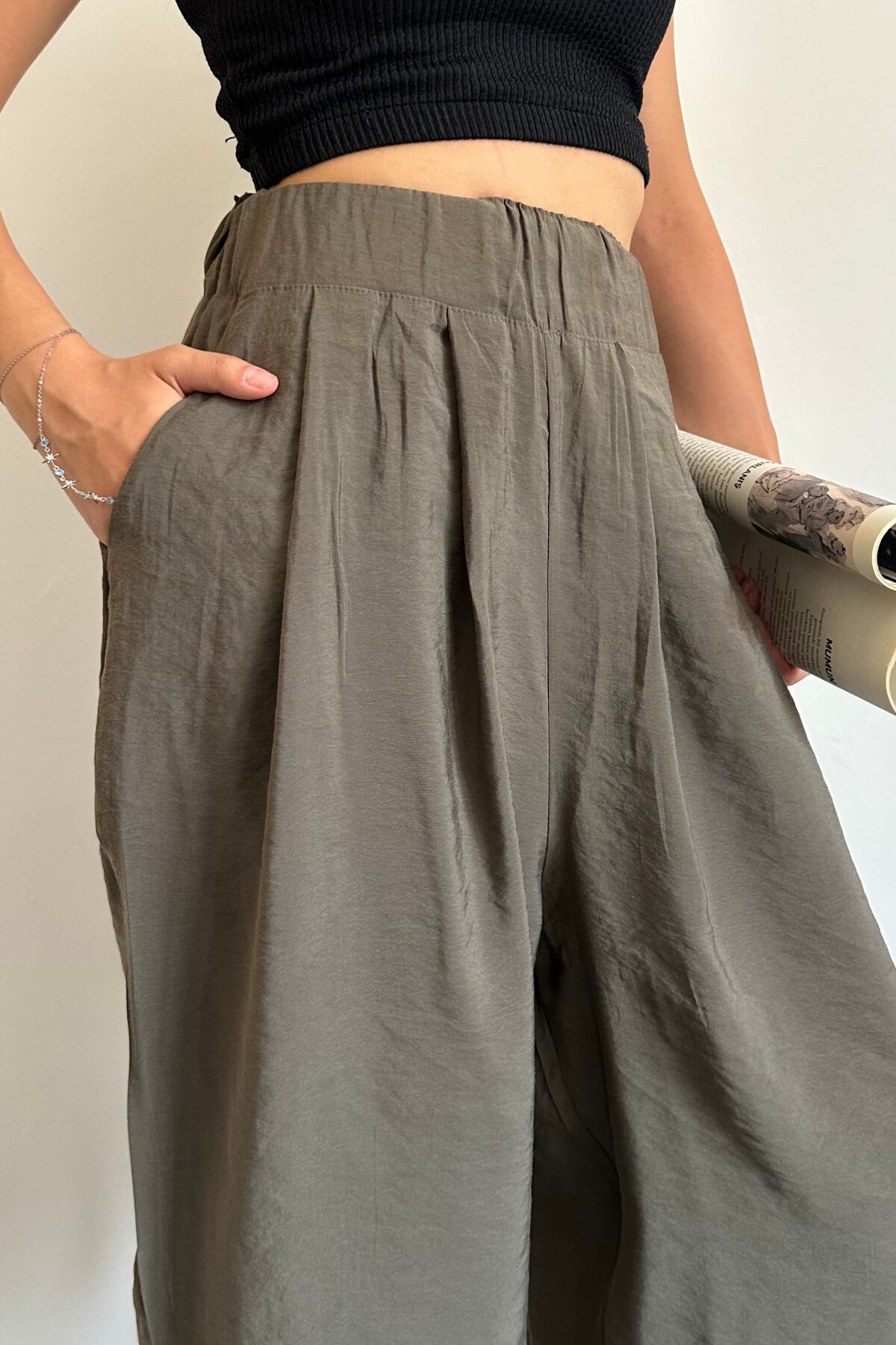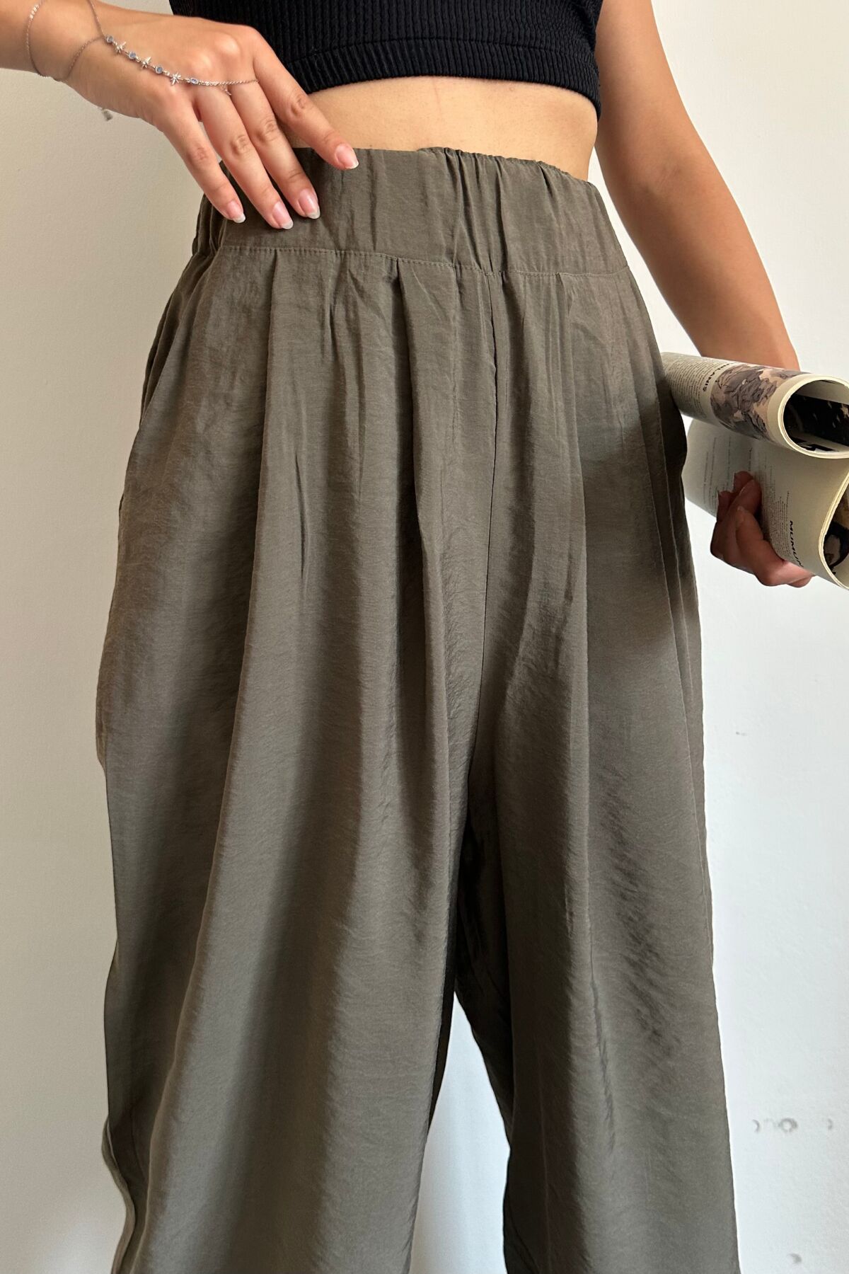 Feela Moda 2009 Beli Lastikli Paraşüt Kumaş Palazzo Kadın Pantolon 42 - Haki