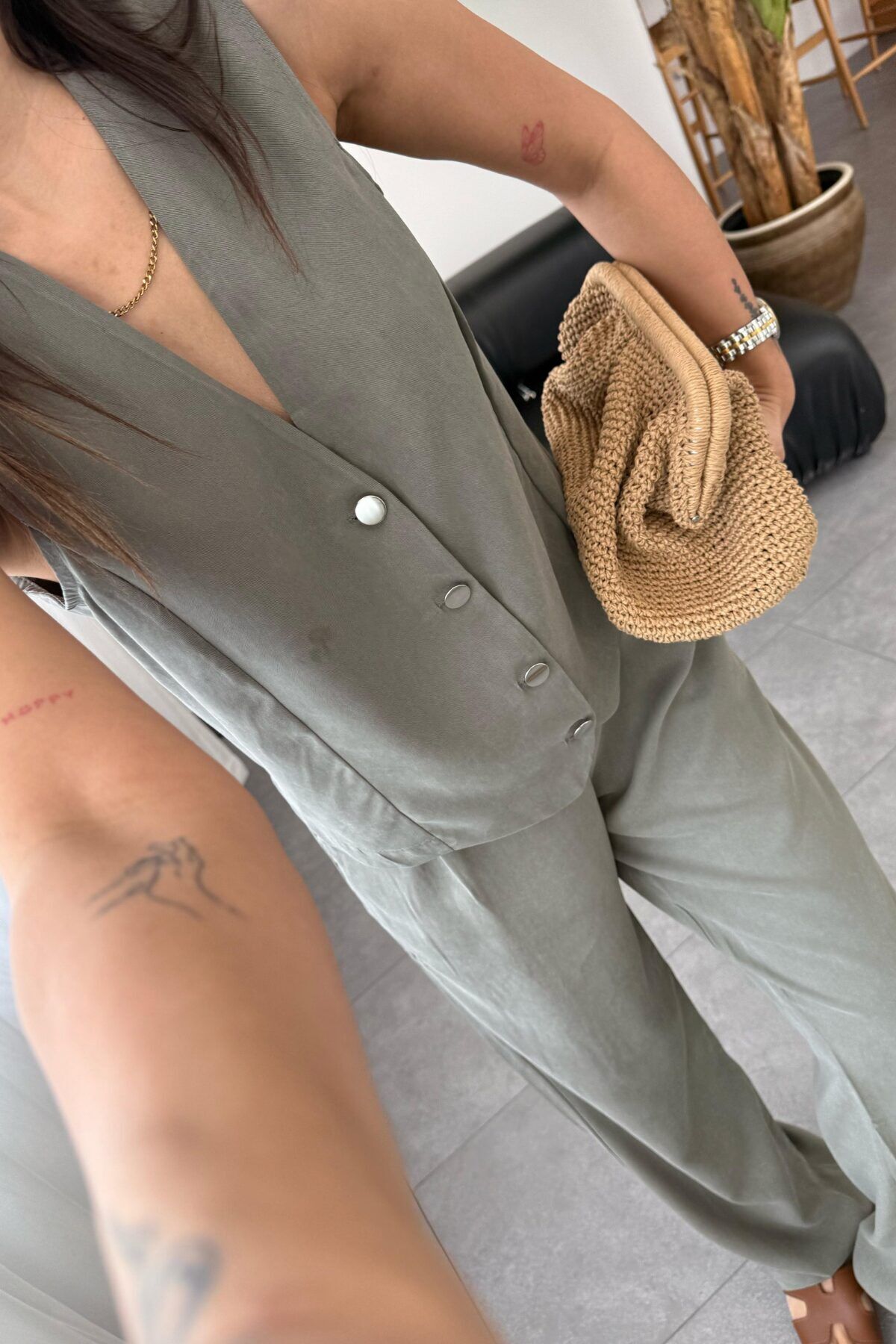 Feela Moda Kadın Tensel Kumaş Dokuma Yelekli Palazzo Takım 2011 S - Haki