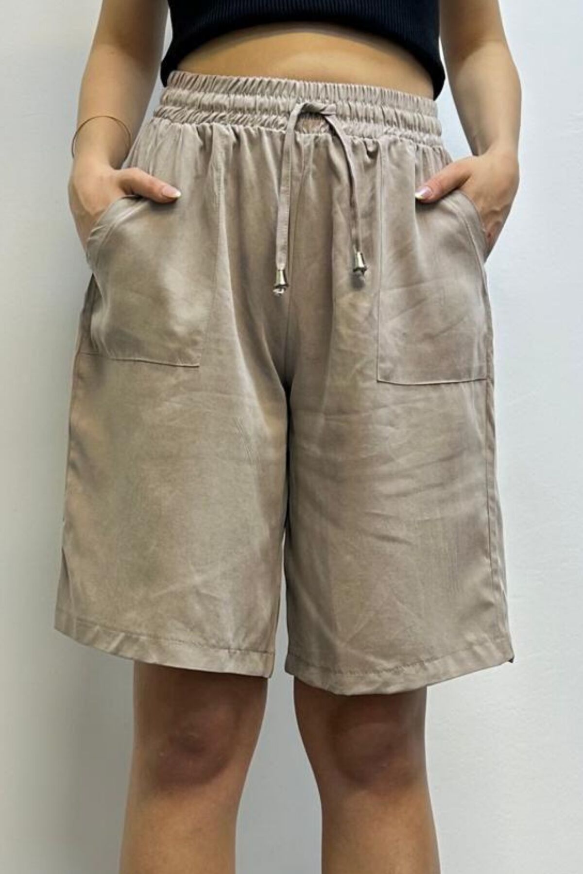 Feela Moda Kadın Bağcıklı Beli Lastikli Modal Dokuma Şort 2010 42 - Bej
