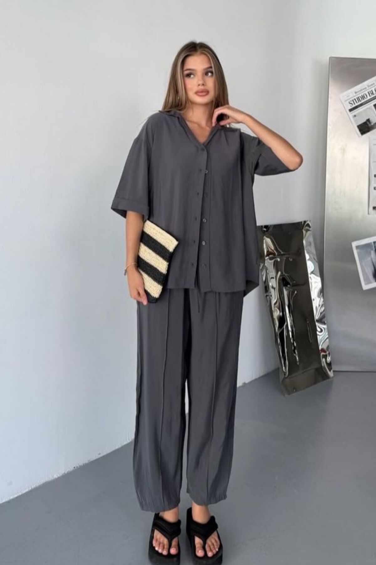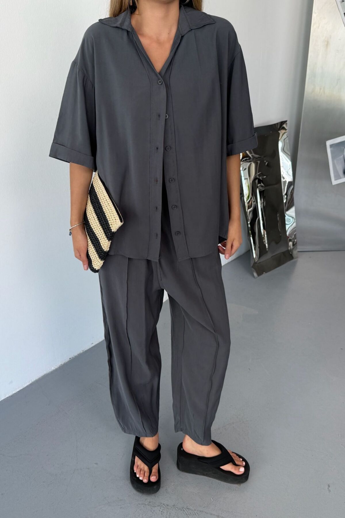 - İki parçadan oluşan set gömlek ve pantolondan oluşuyor ve kombin yapmayı kolaylaştırıyor.