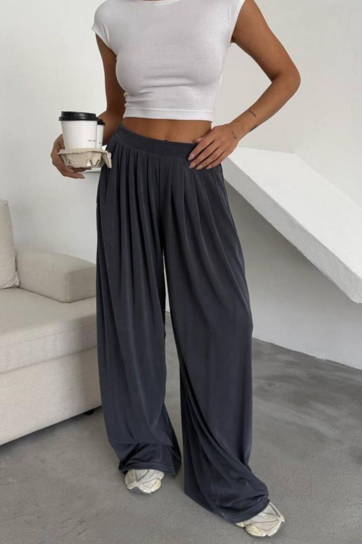 Feela Moda Kadın Premium Modal Pileli Bol Paça Salaş Pantolon 2012 40 - Antrasit