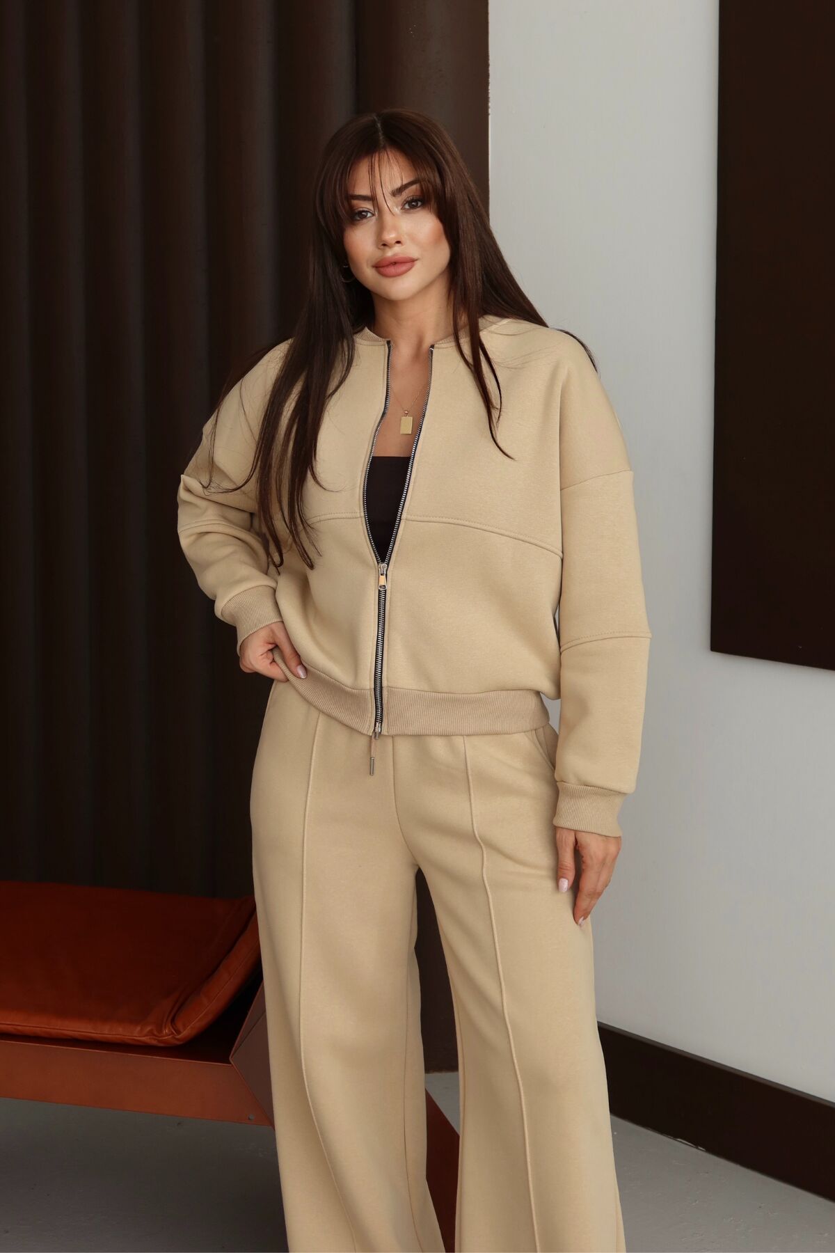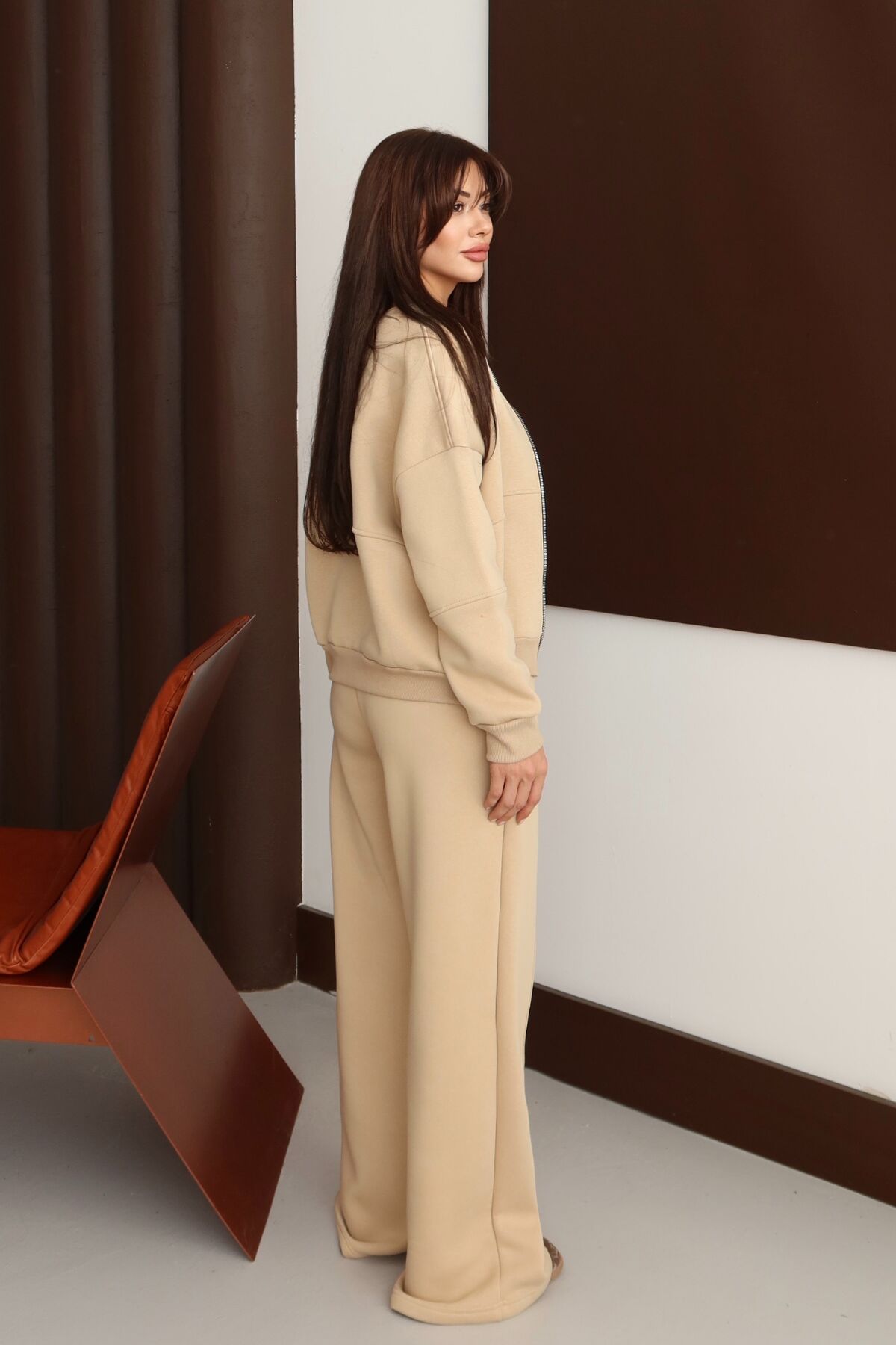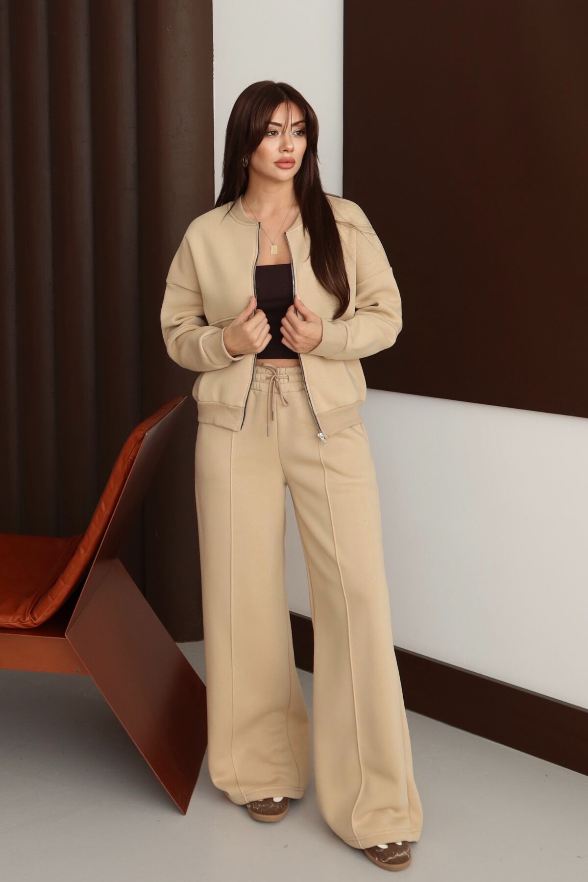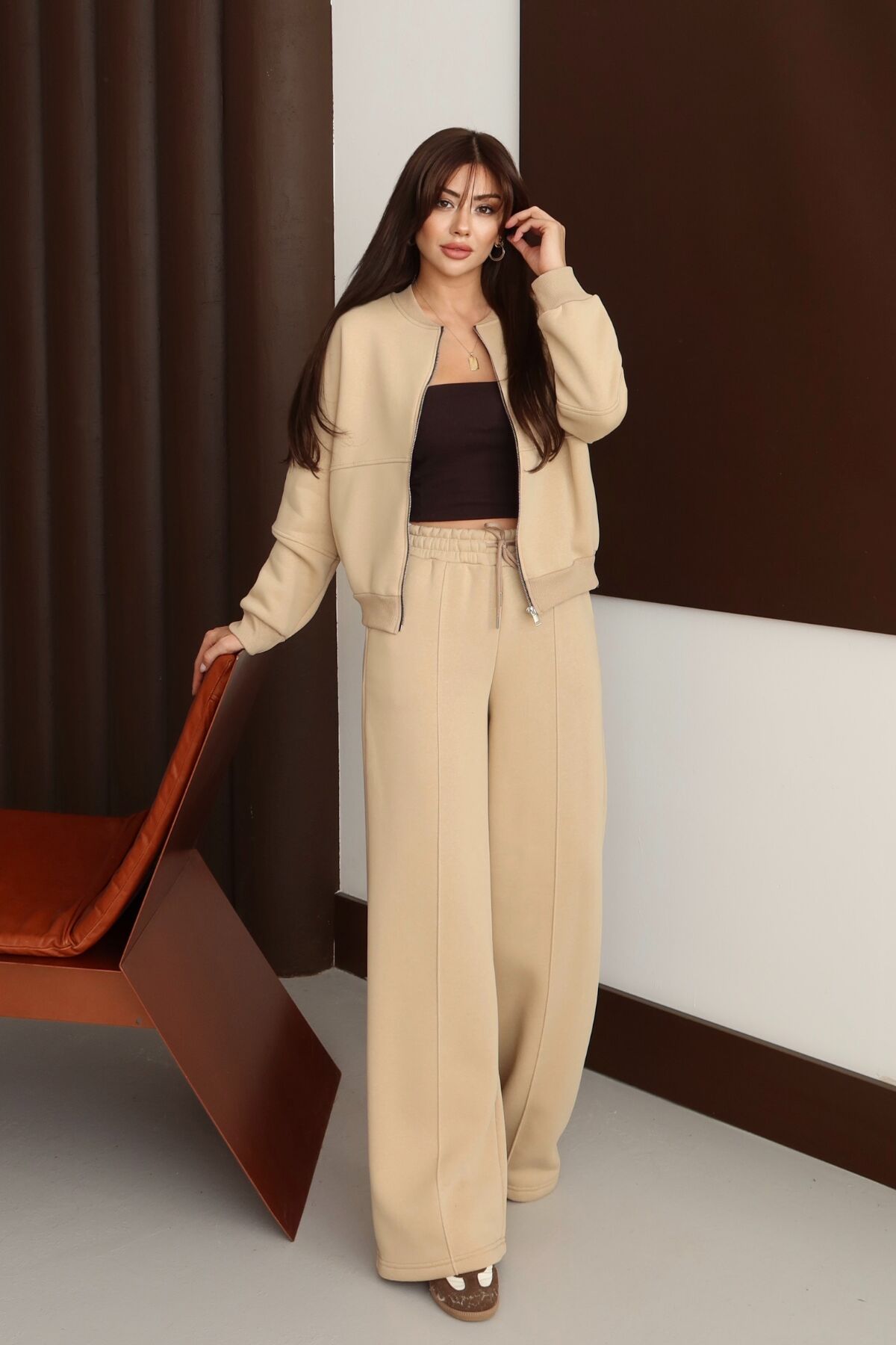 Balenbi Kadın 3 İplik İçi Polarlı Robalı Bomber Ceket Palazzo Takım 1143 XL - Bej