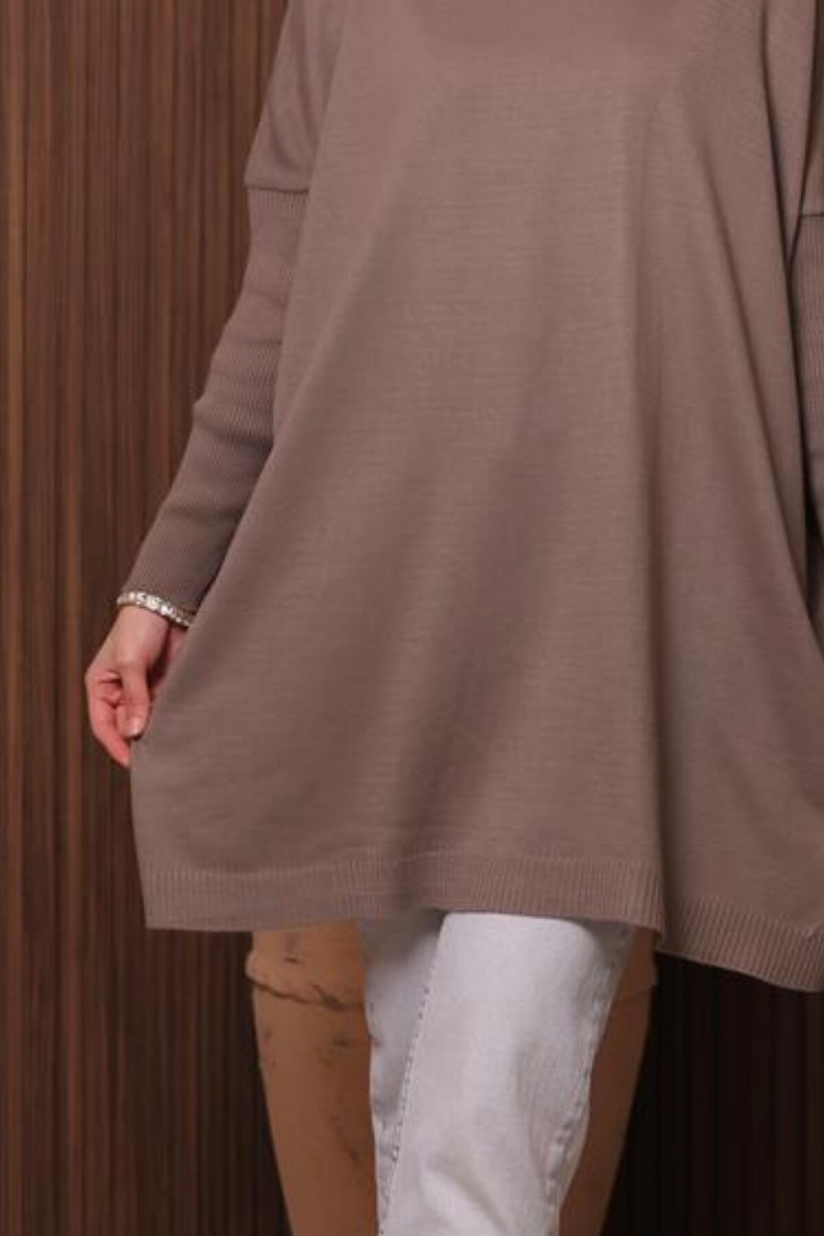 Balenbi Kadın Dik Yaka Basic 80cm Salaş Oversize Triko Tunik 1145 Standart - Toprak