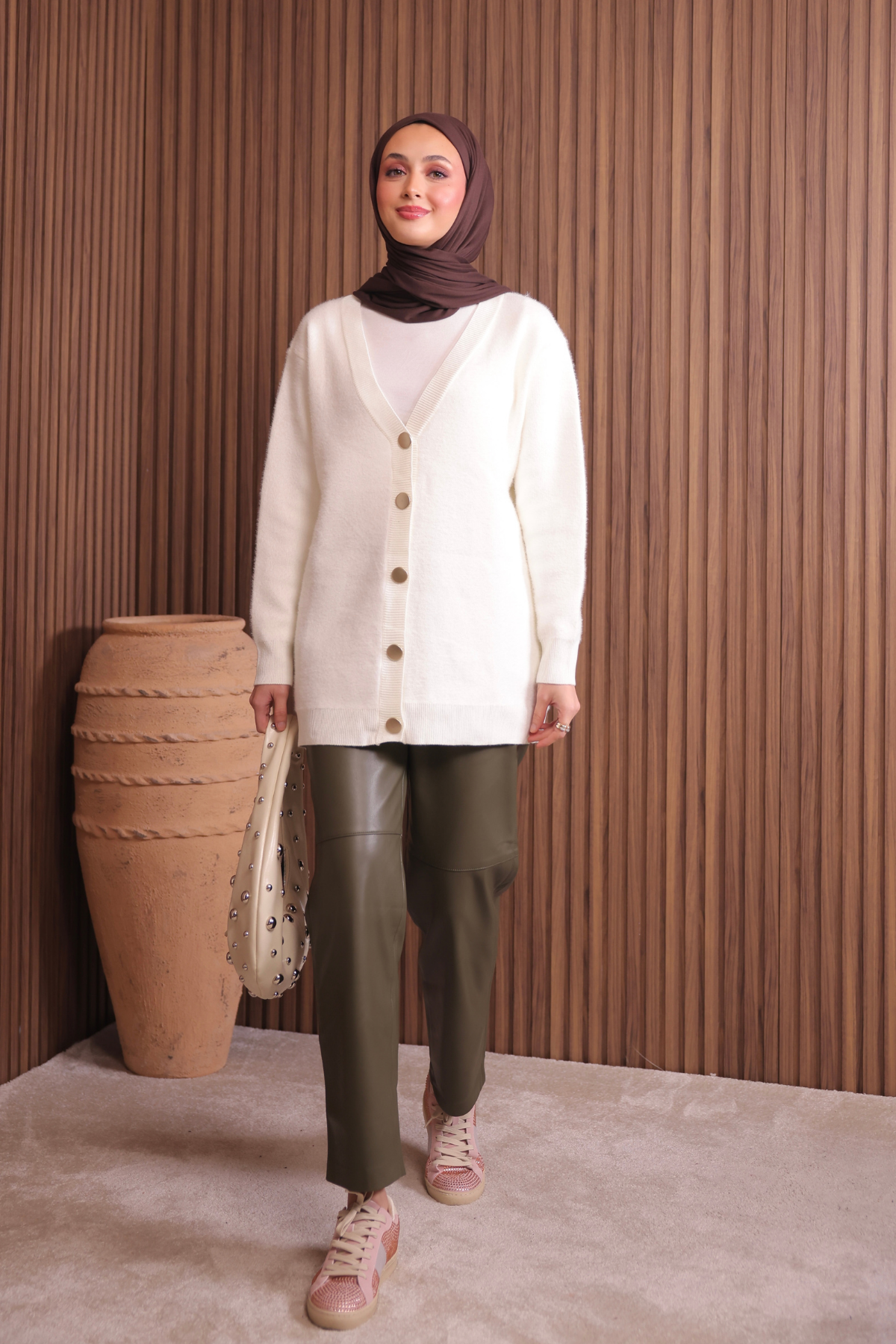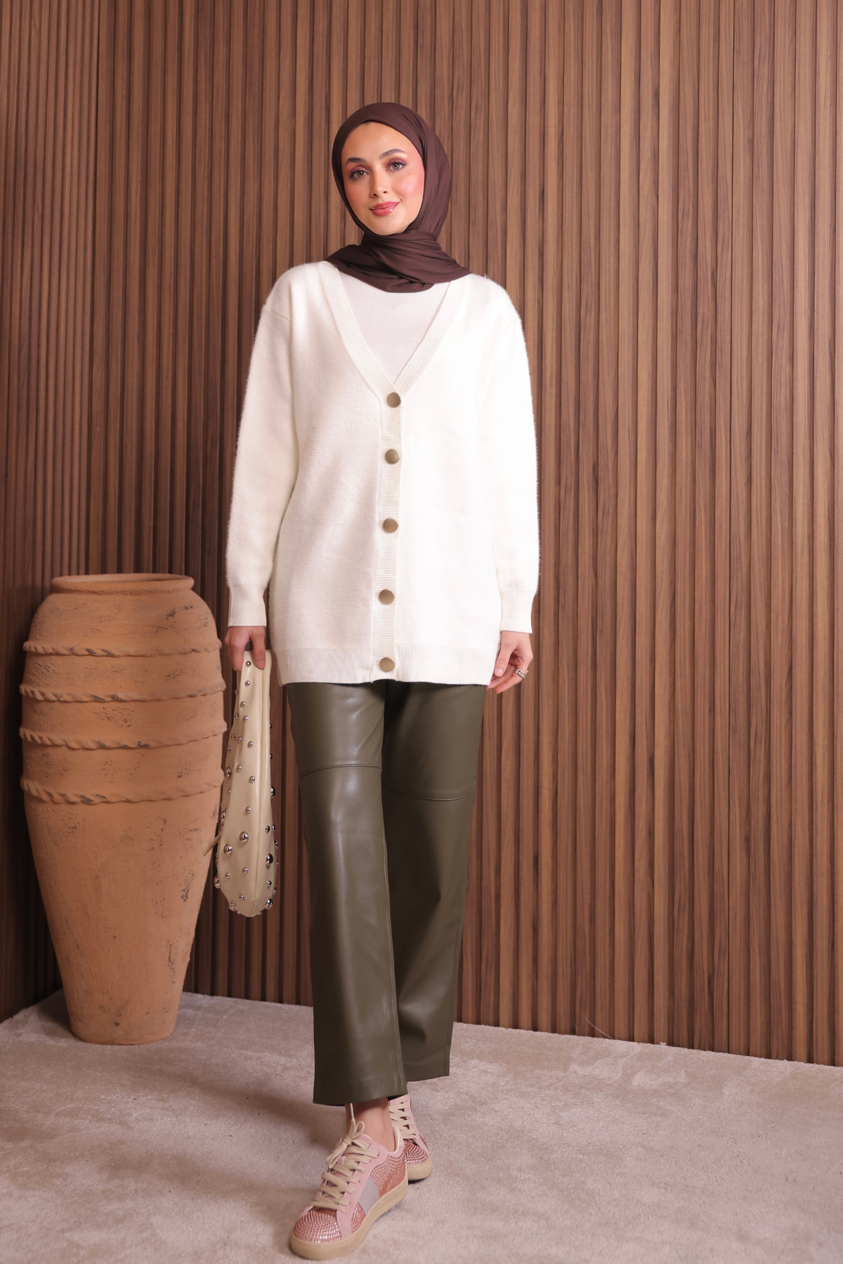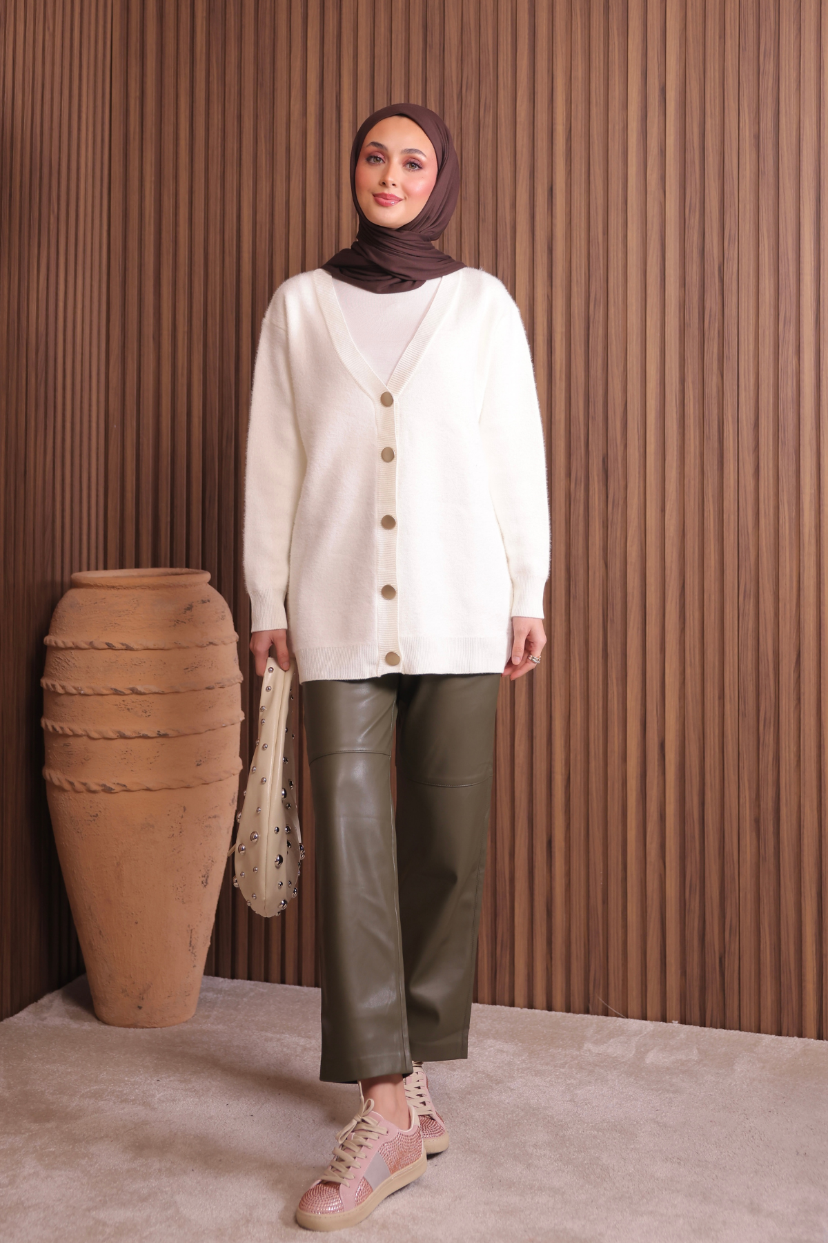 Kadın V Yaka Bronz Düğmeli Sakallı Triko Hırka 1142 Standart - Ekru