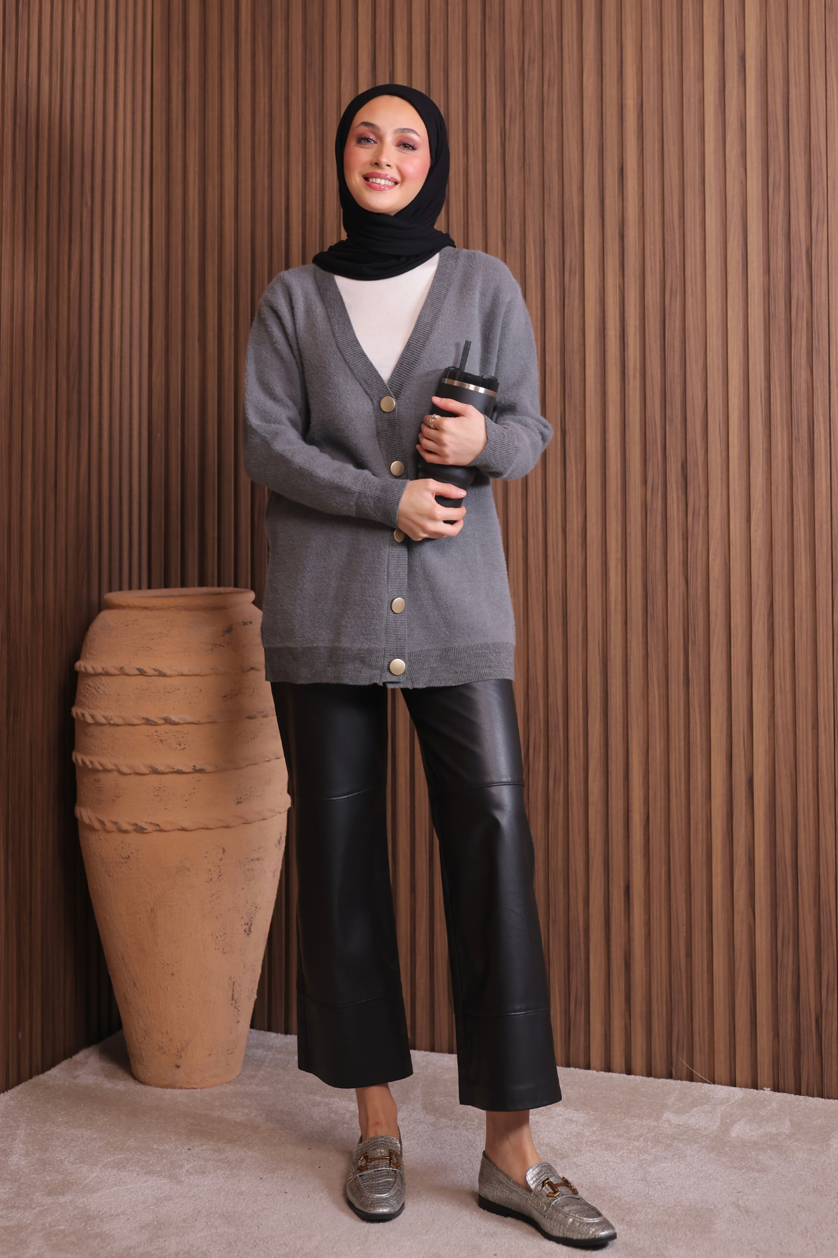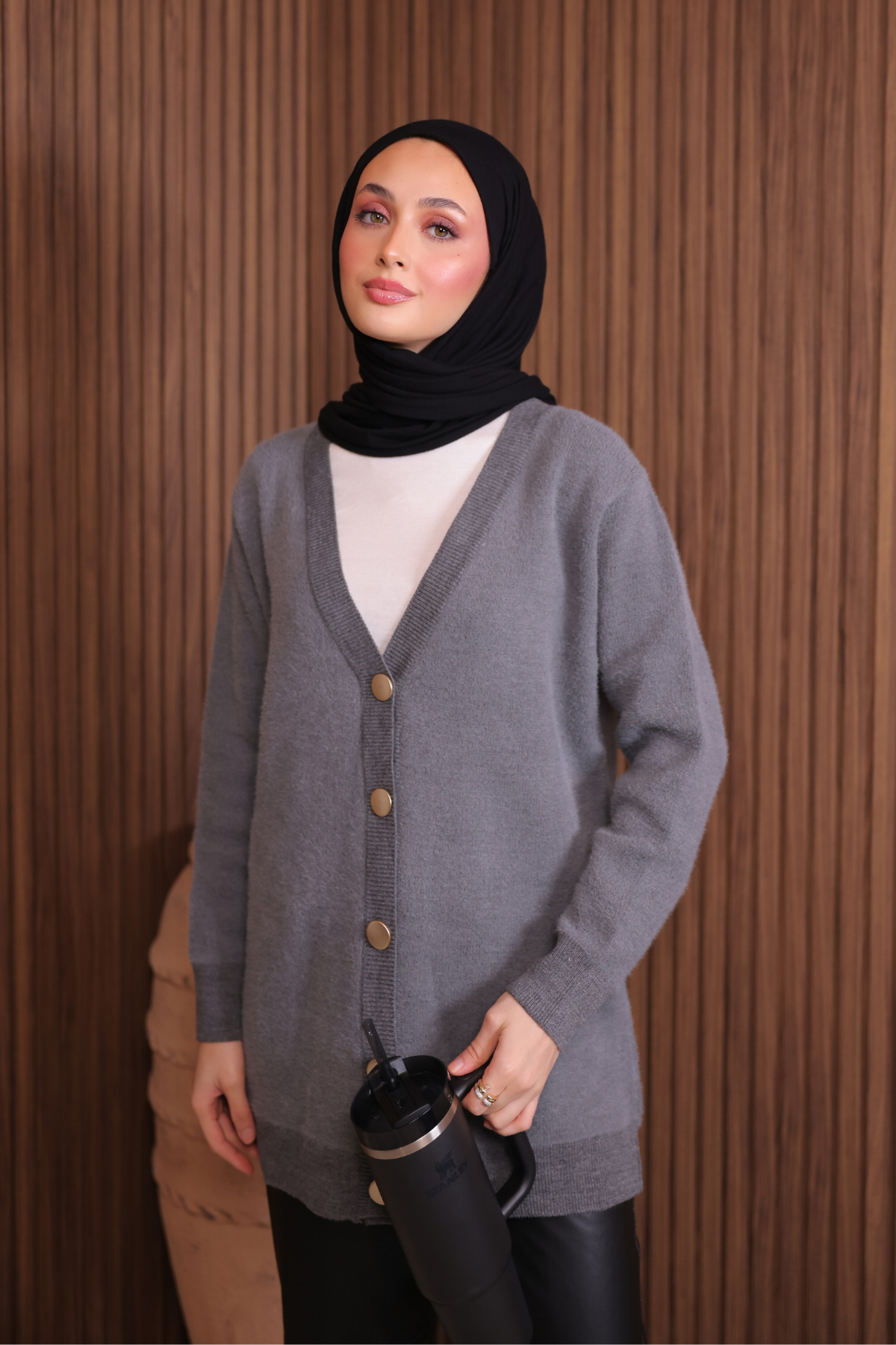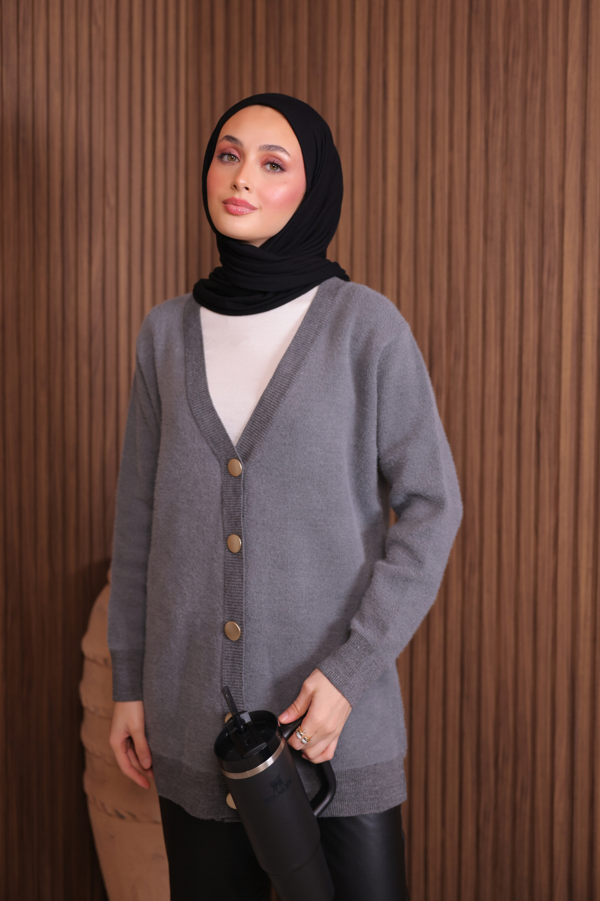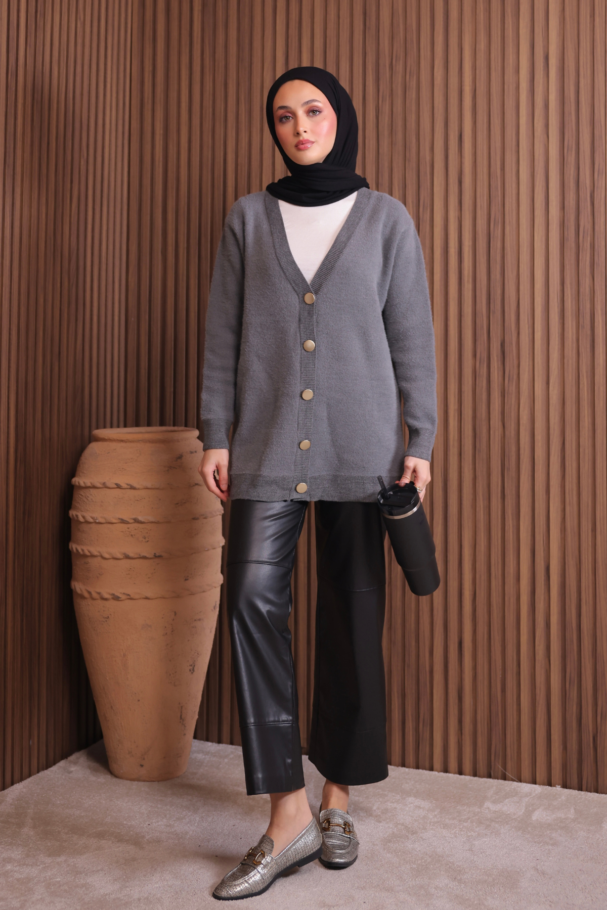 Kadın V Yaka Bronz Düğmeli Sakallı Triko Hırka 1142 Standart - Gri